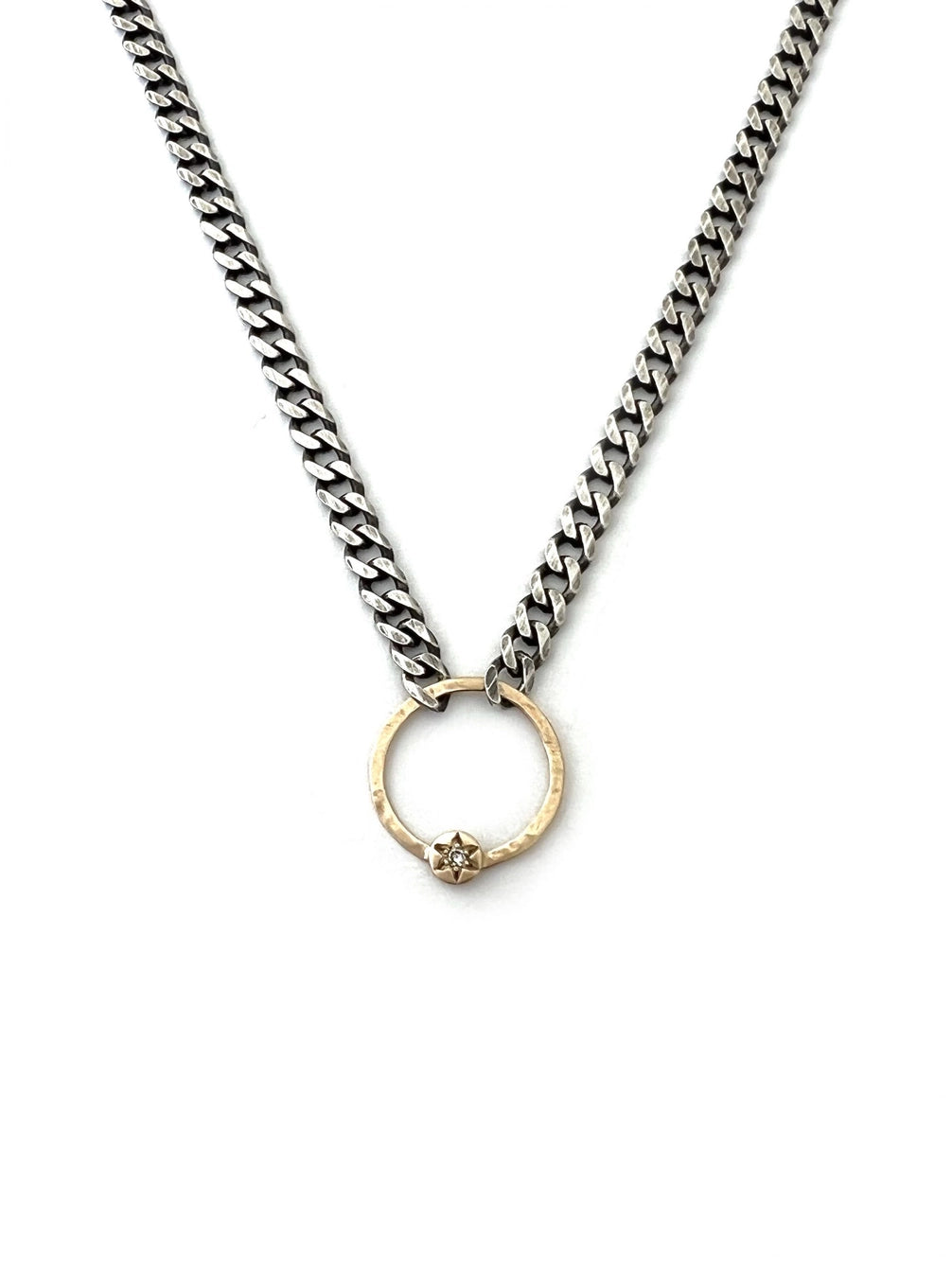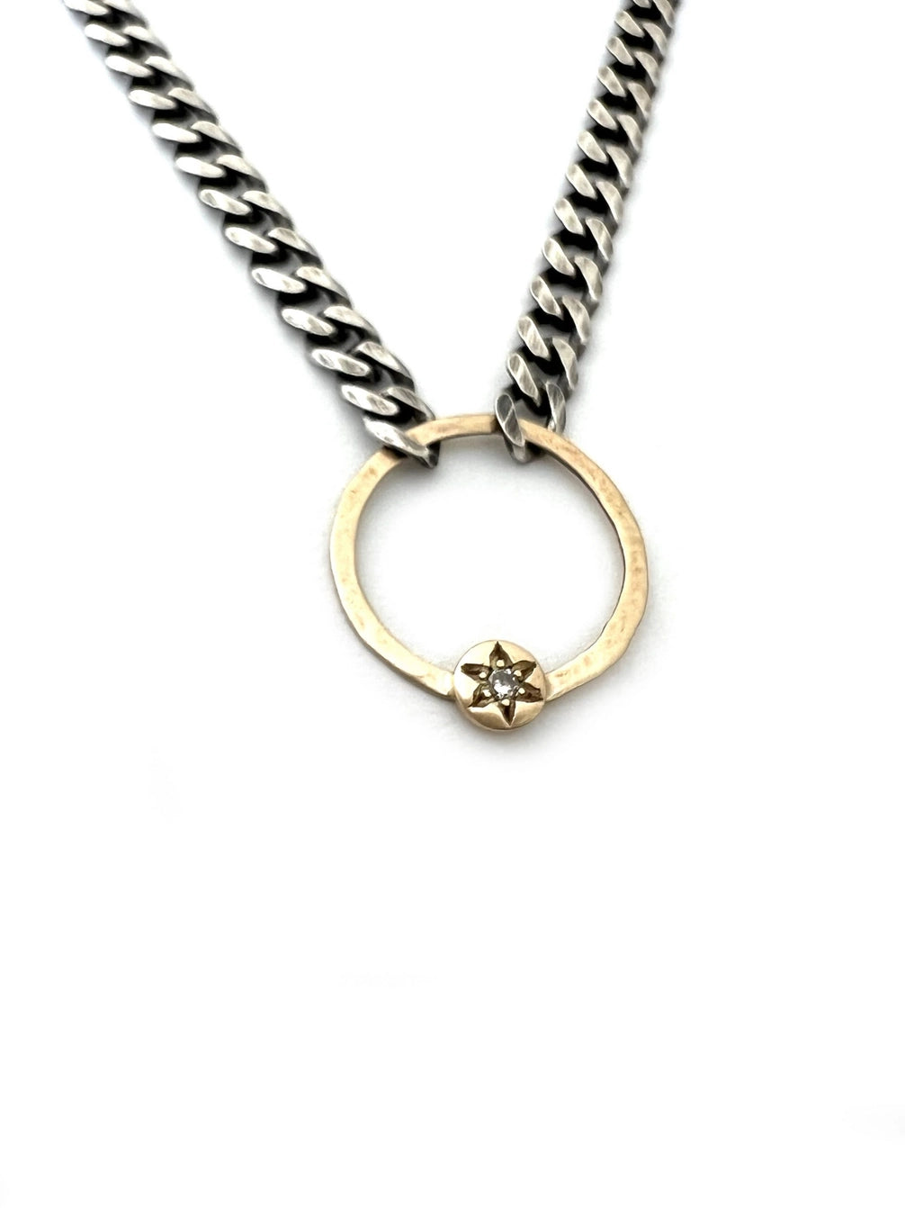 This radiant necklace is the perfect combination of rustic and elegant. It features one of CLP's signature starburst set diamond dots on a hand-fabricated14k gold circle.