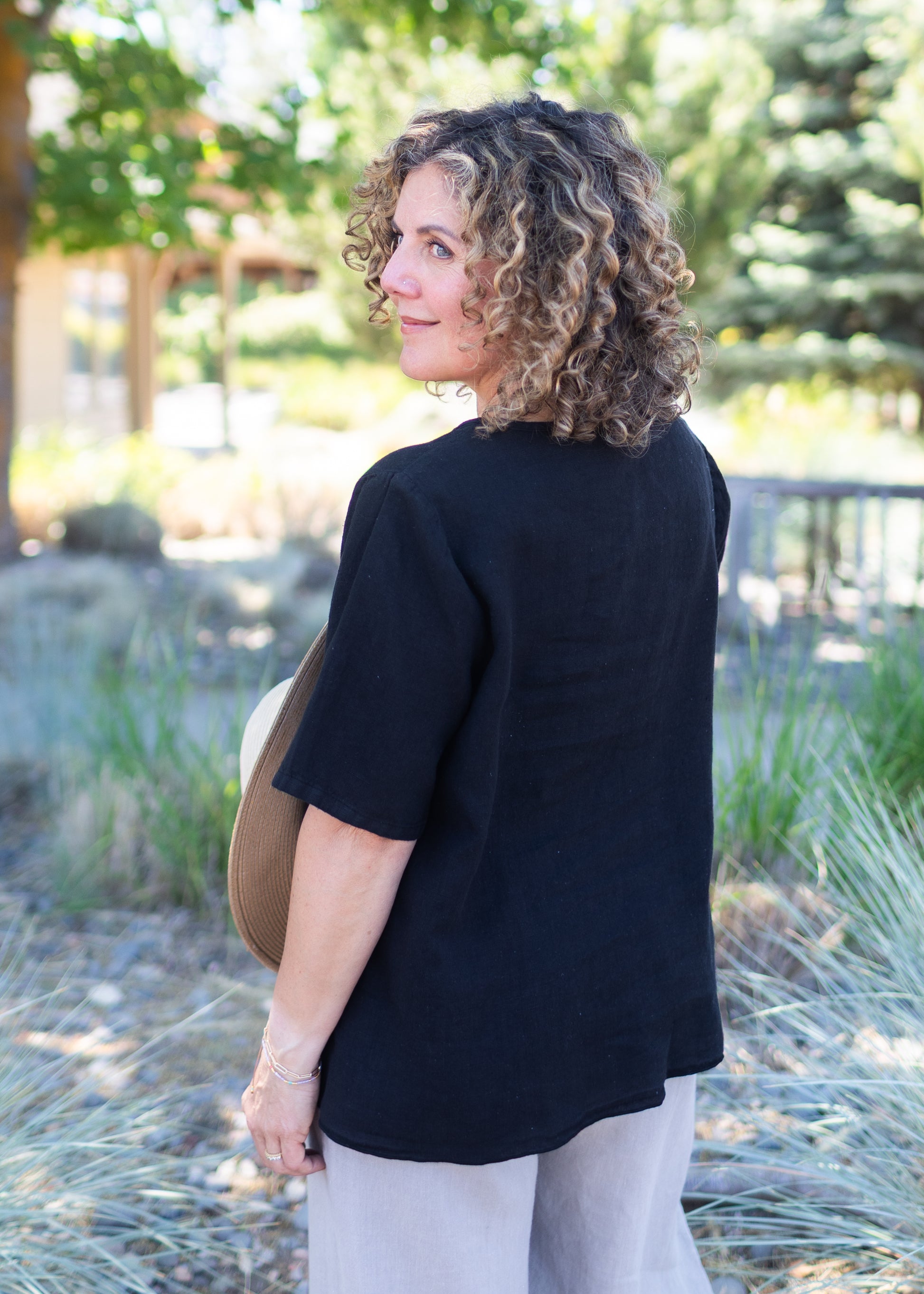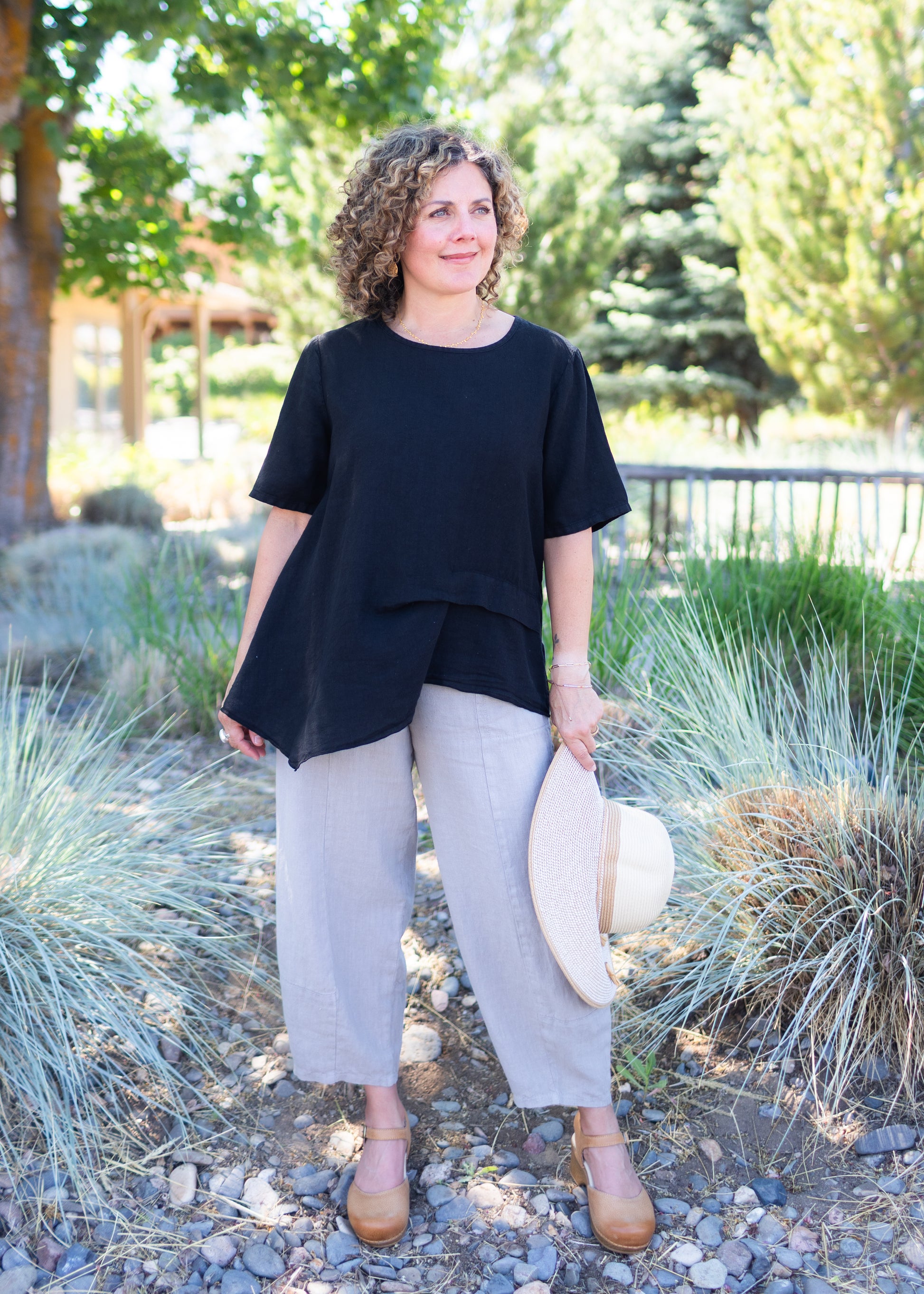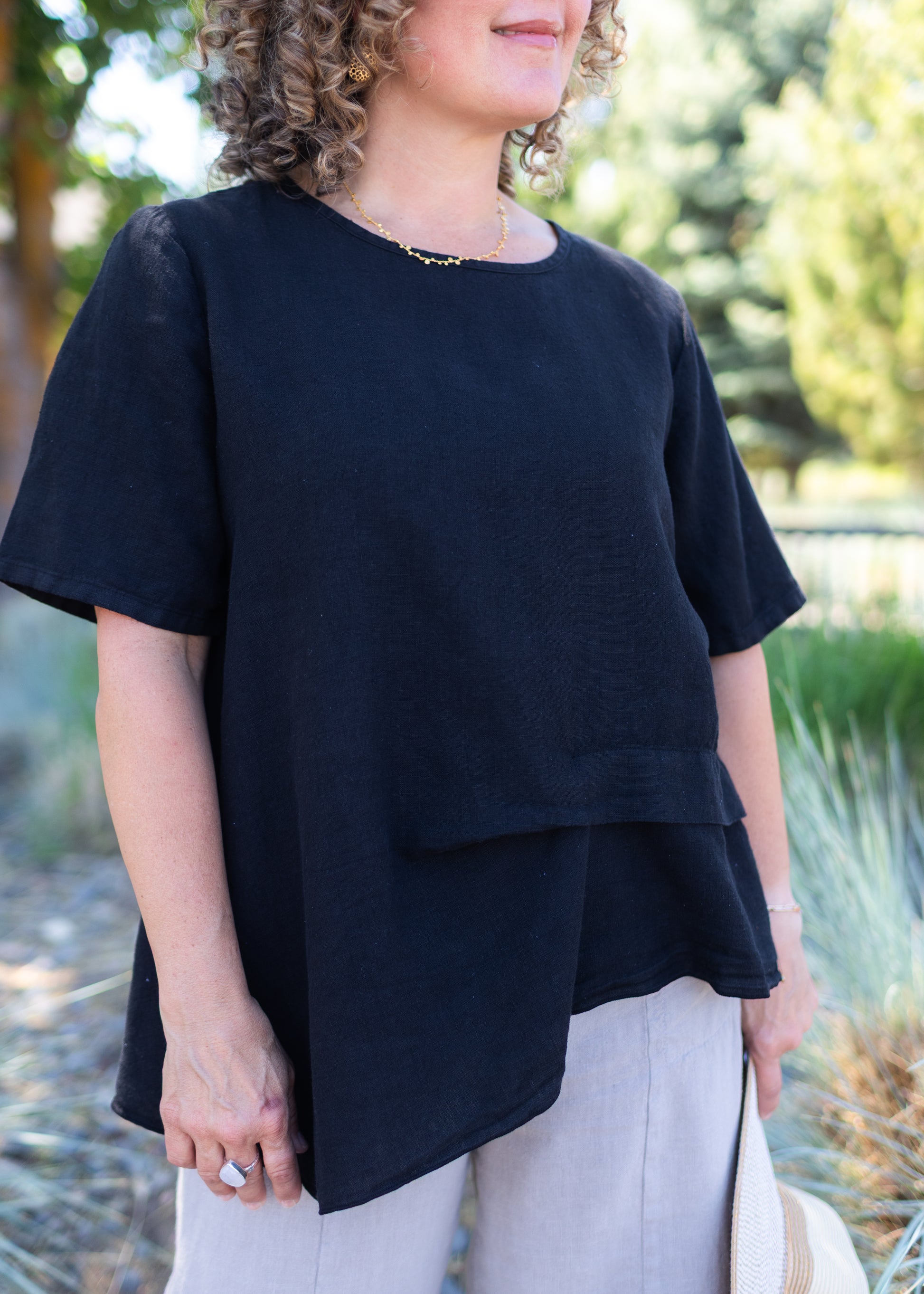 A customer favorite for a reason, the Asymmetrical Top from Fenini blends comfort with effortless style. Made from lightweight linen, it features a crew neckline, short dolman-style sleeves, and a distinctive asymmetrical hem with soft front pleats for added shape and movement. In classic black, it’s easy to dress up or down—whether you're pairing it with the matching Fenini linen pants or your favorite jeans.