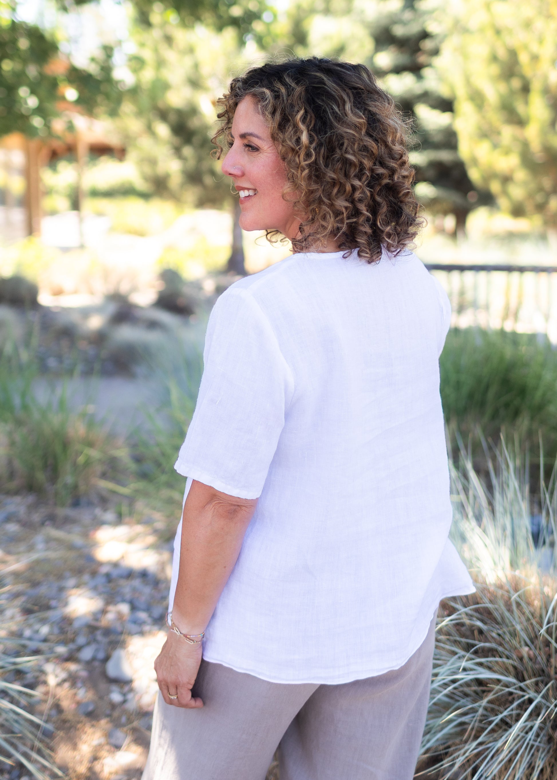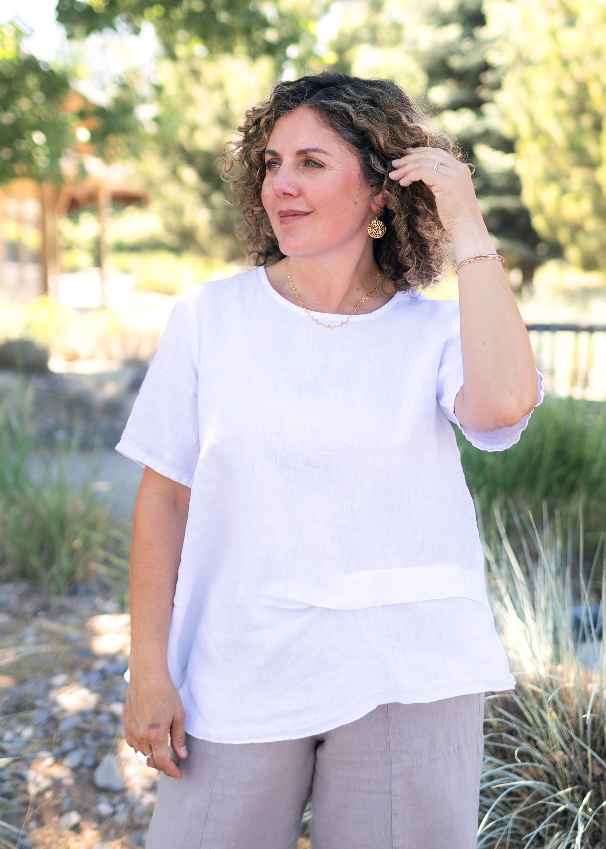 A longtime customer favorite, the Asymmetrical Top from Fenini brings together easy comfort and everyday style. Crafted from lightweight linen, it features a relaxed fit, soft pleating at the front, and an asymmetrical hemline that adds movement and interest. In crisp white, it’s the kind of top you’ll reach for again and again—perfect with the matching Fenini linen pants, classic denim, or layered under a summer jacket. Effortless, flattering, and made to keep up with your day.