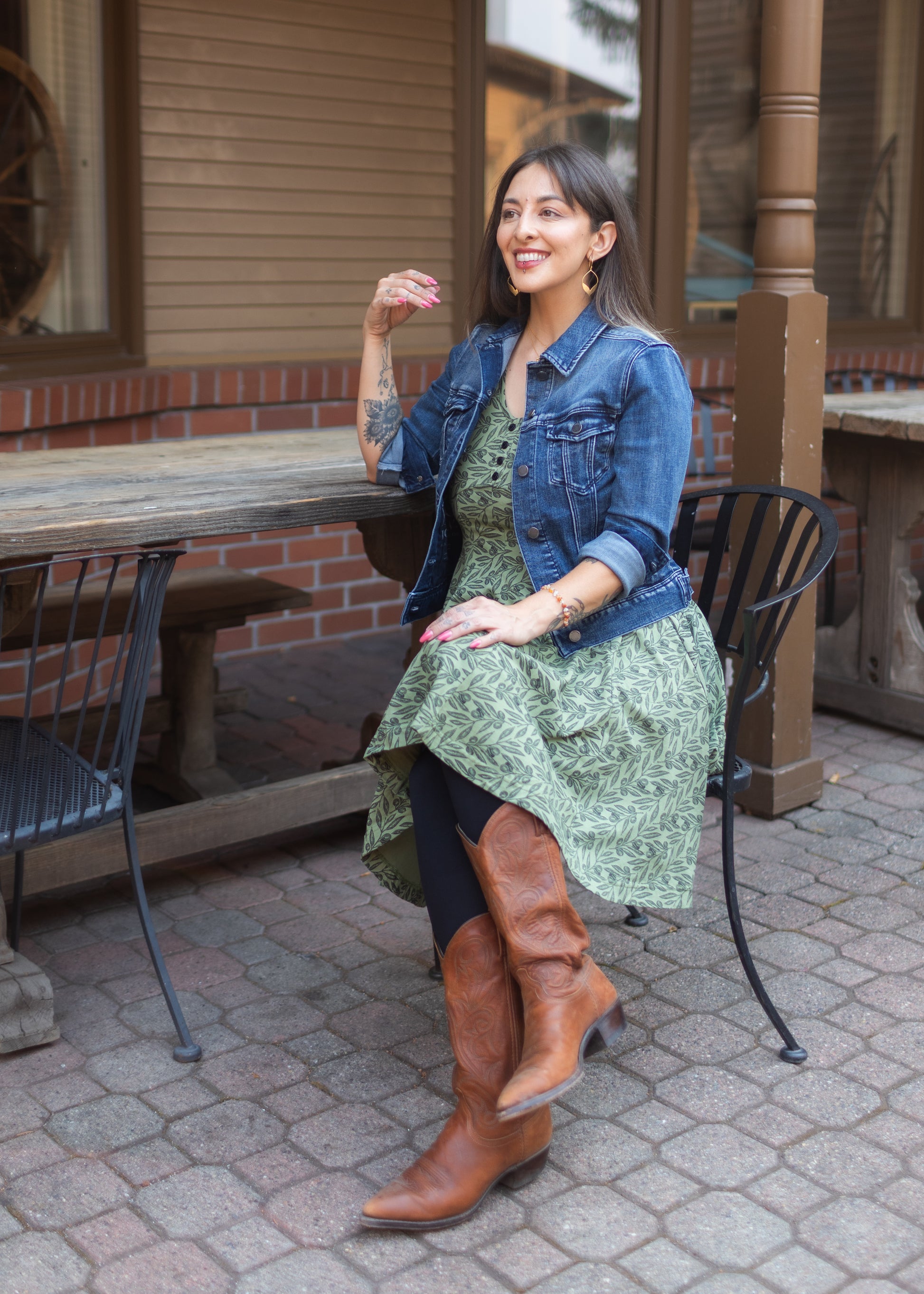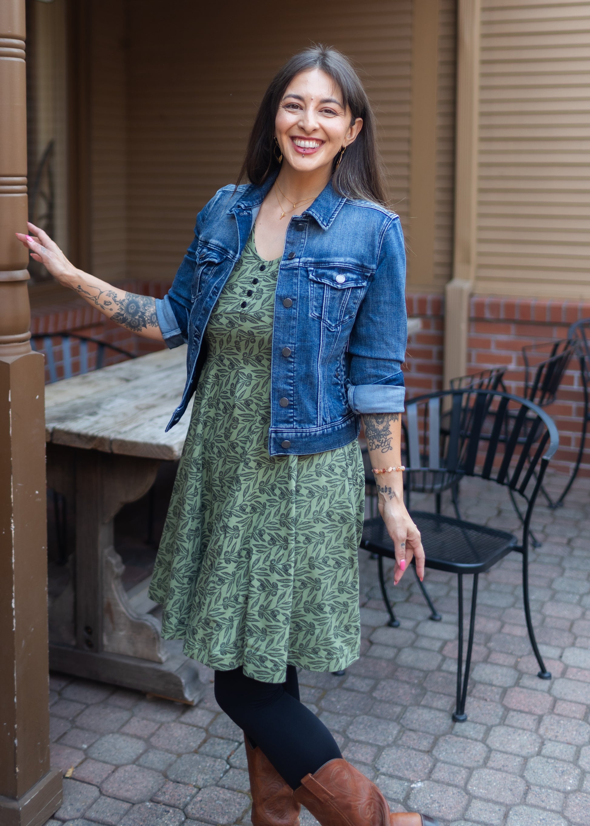 - Olive green dress with black illustrated olives printed throughout