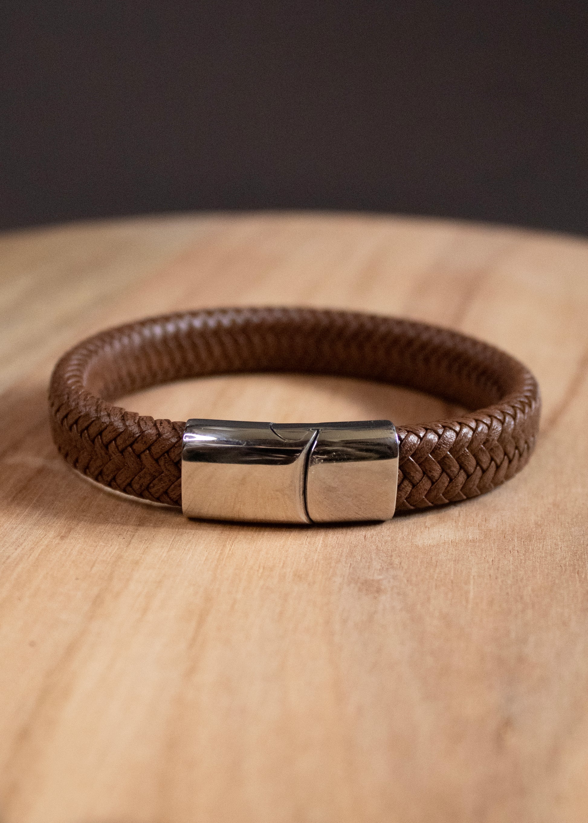 Add a touch of rugged style to your look with this brown braided bracelet, designed for a cool and casual finish.