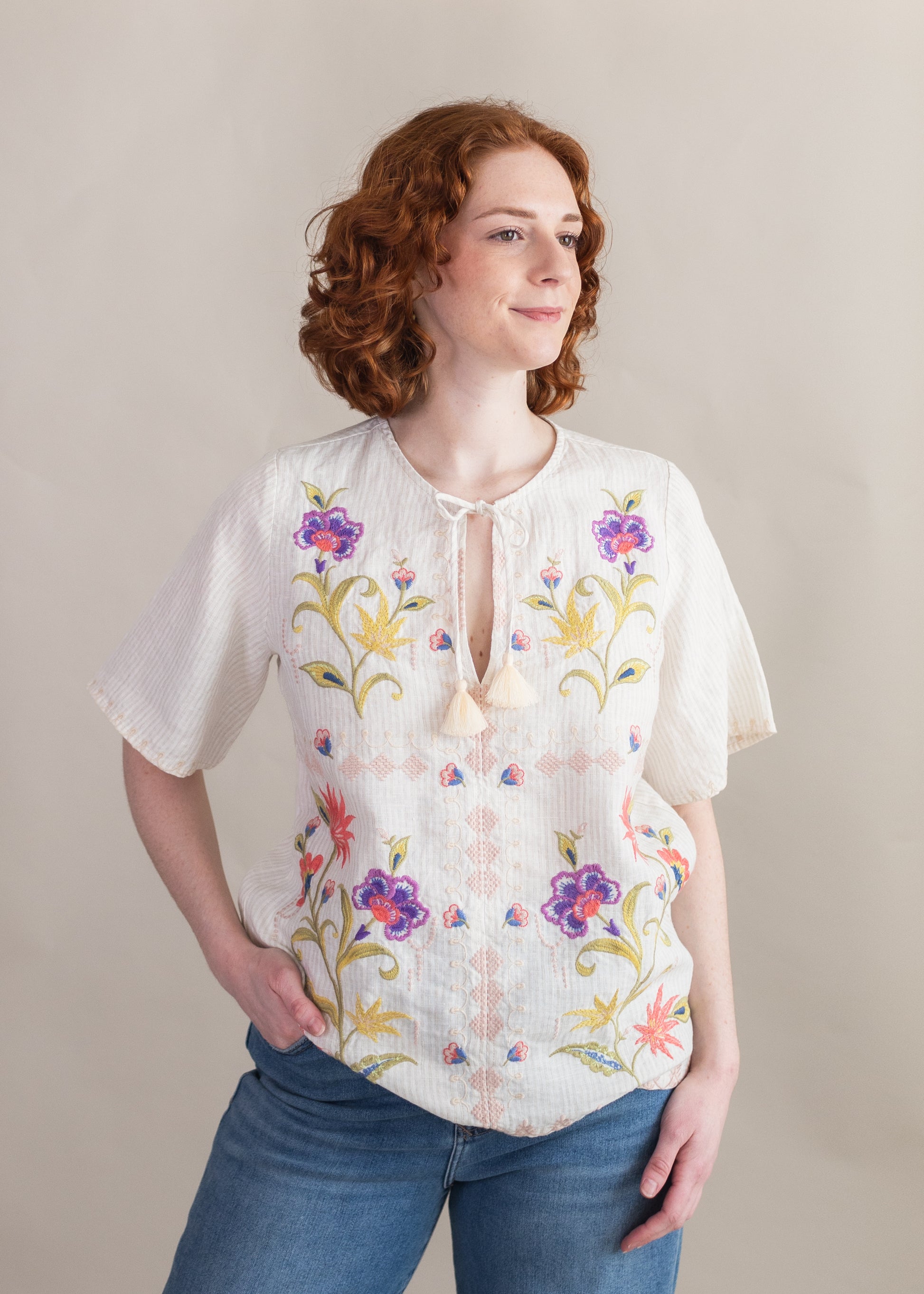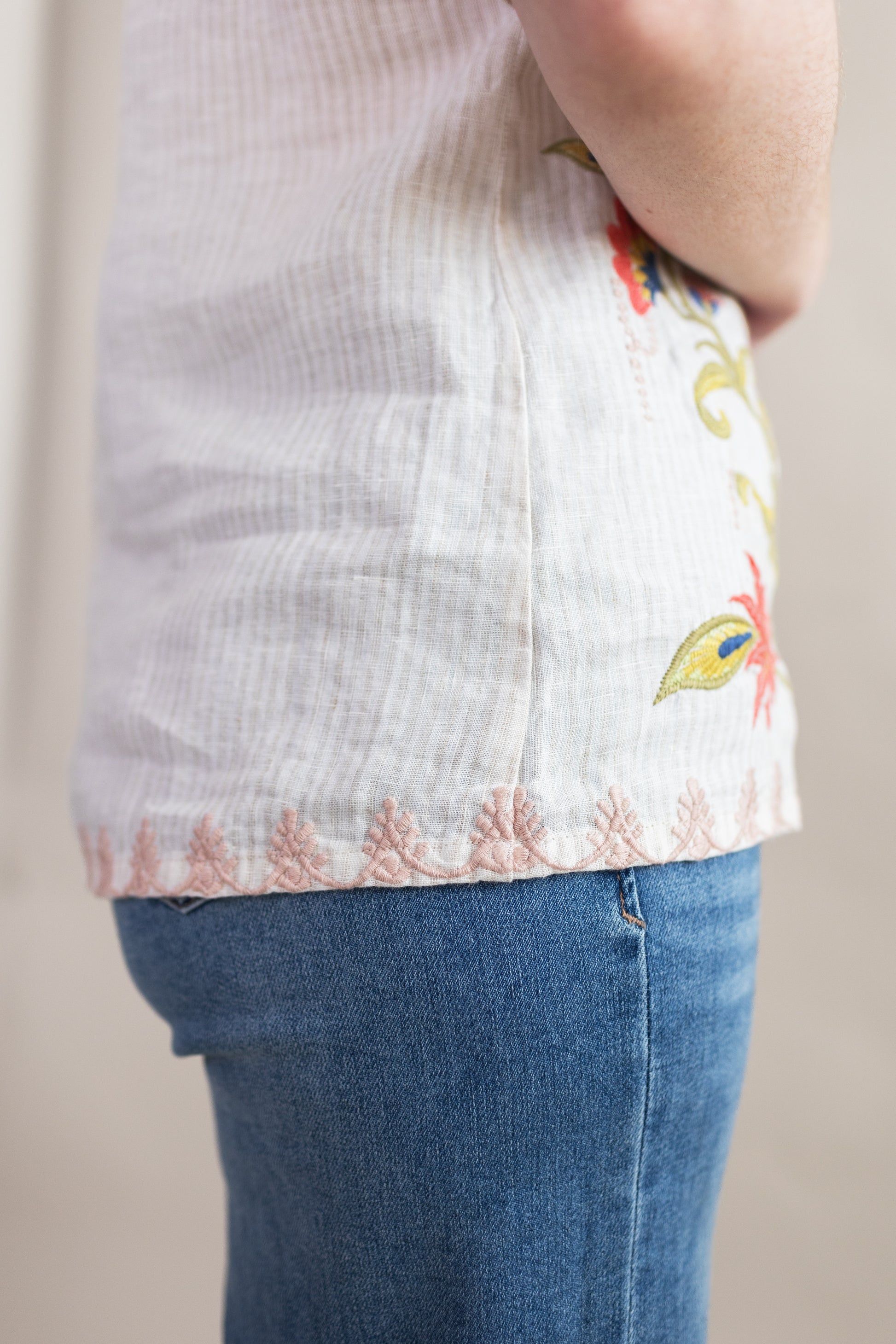 The Calista Striped Blouse from Johnny Was is a lightweight cotton shirt, featuring subtle beige stripes and floral embroidery.