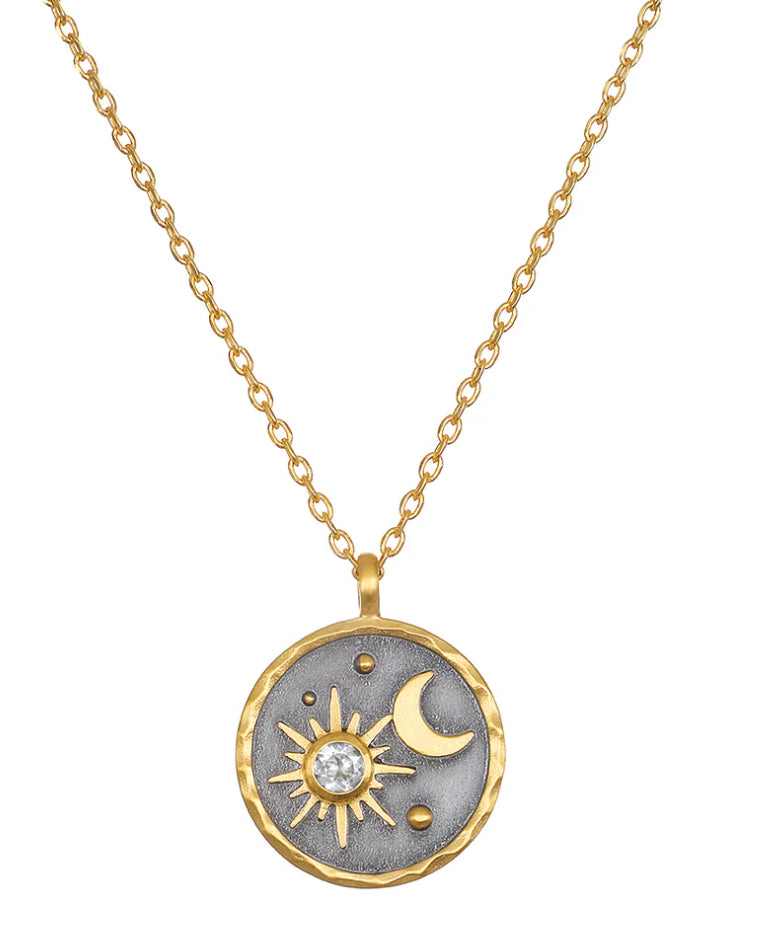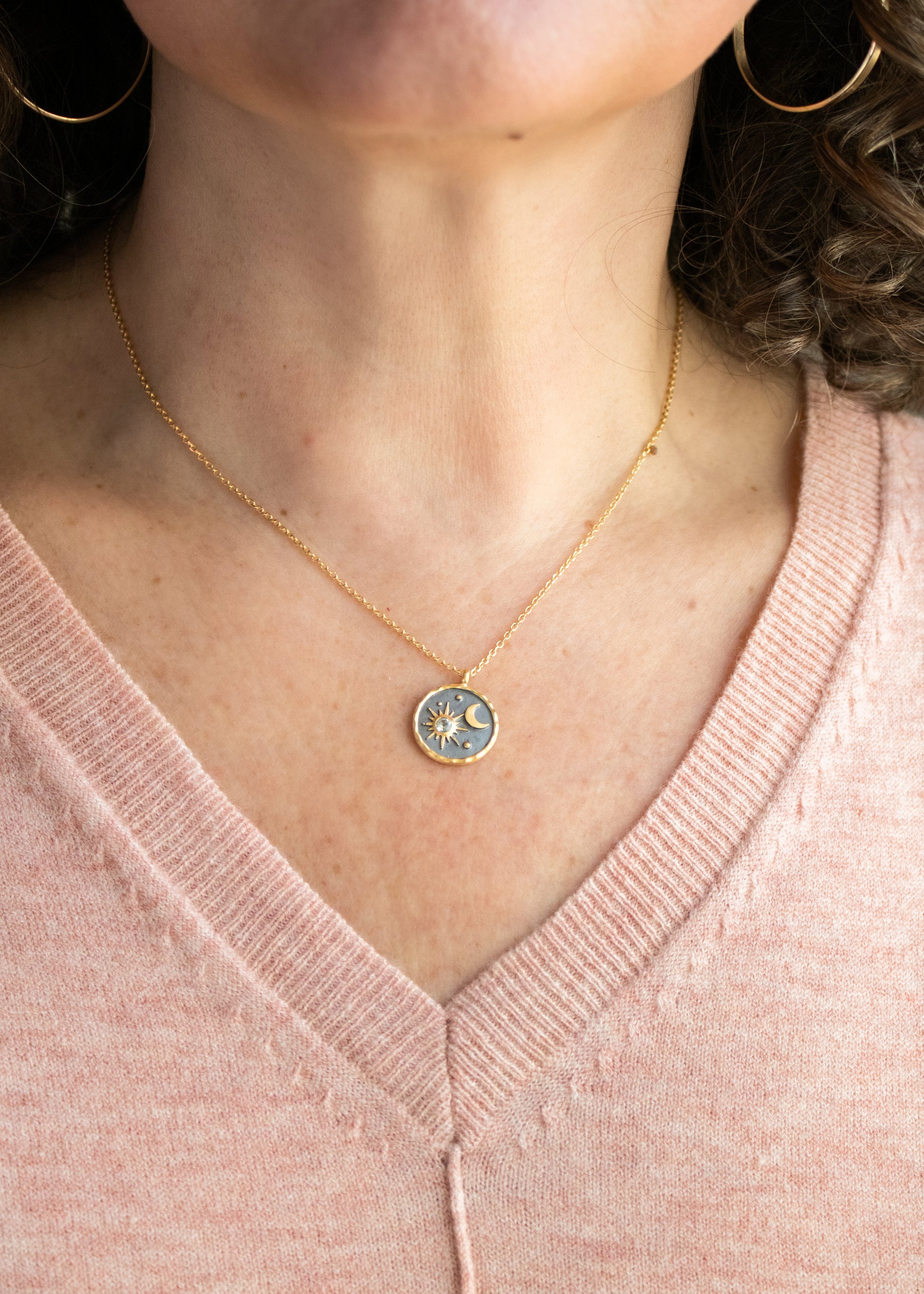 A celestial night sky shines in 18k gold plate against a gunmetal background, creating a meaningful pendant necklace. Set on a 16” chain, this birthstone necklace has an extender finished with a sparkling gold star for added length and delicate detail.