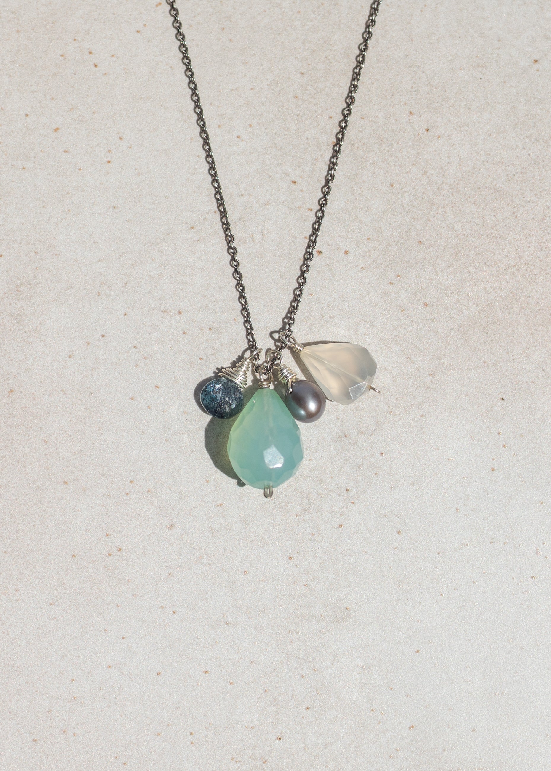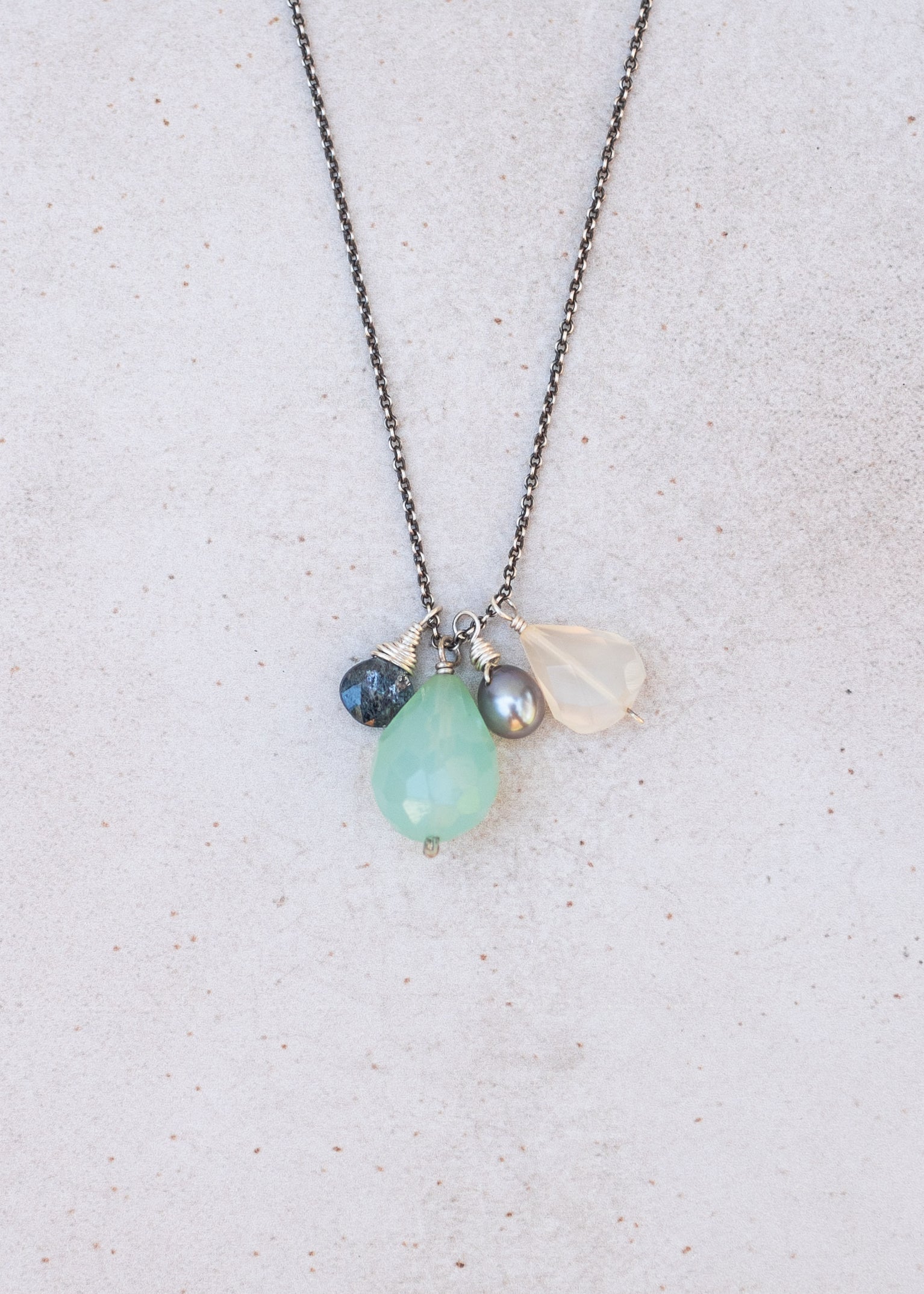 This unique handcrafted gemstone necklace features a striking chalcedony drop accented by a playful cluster of pearl, kyanite, and white chalcedony stones. Strung on an oxidized silver chain, it has a slightly moody, vintage feel that still feels fresh and modern. Perfect for pairing with a simple white tee and jeans for an easy, elevated everyday look, or layering with other favorites for a bolder statement. Made in Sisters, Oregon by artisan Kym Jasmer, this necklace blends natural elegance with laid-back style—ideal for lovers of artisan jewelry and unique, one-of-a-kind designs.