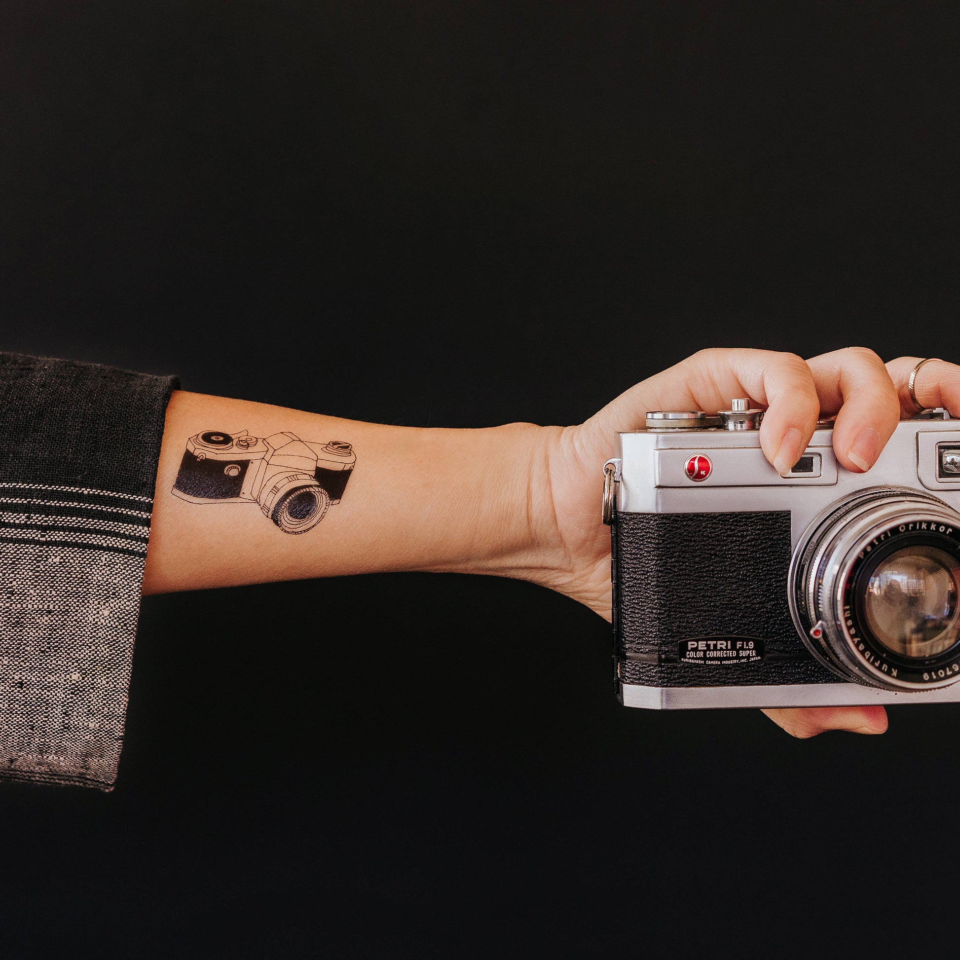Classic Camera Tattoo Pair by artist Julia Rothman. Safe, quality and made in the USA. Tattly Pairs include two of each design packaged in a polybag and sealed with a branded topper.