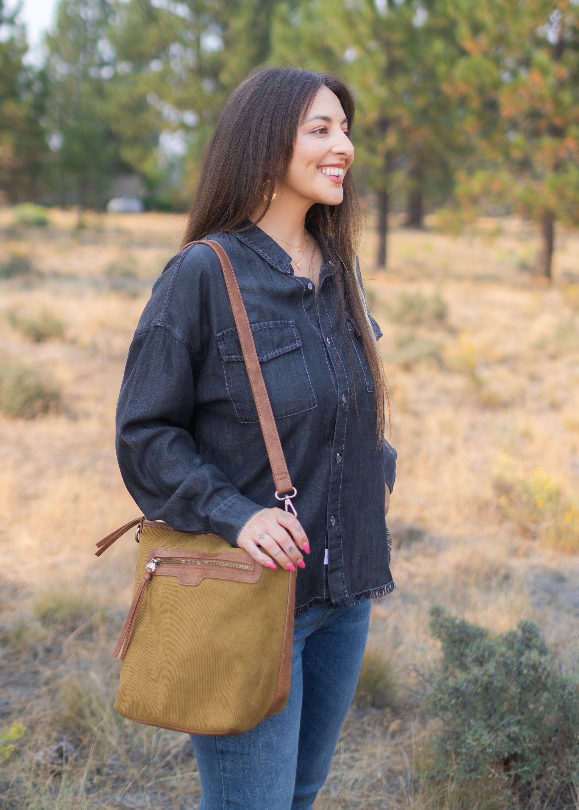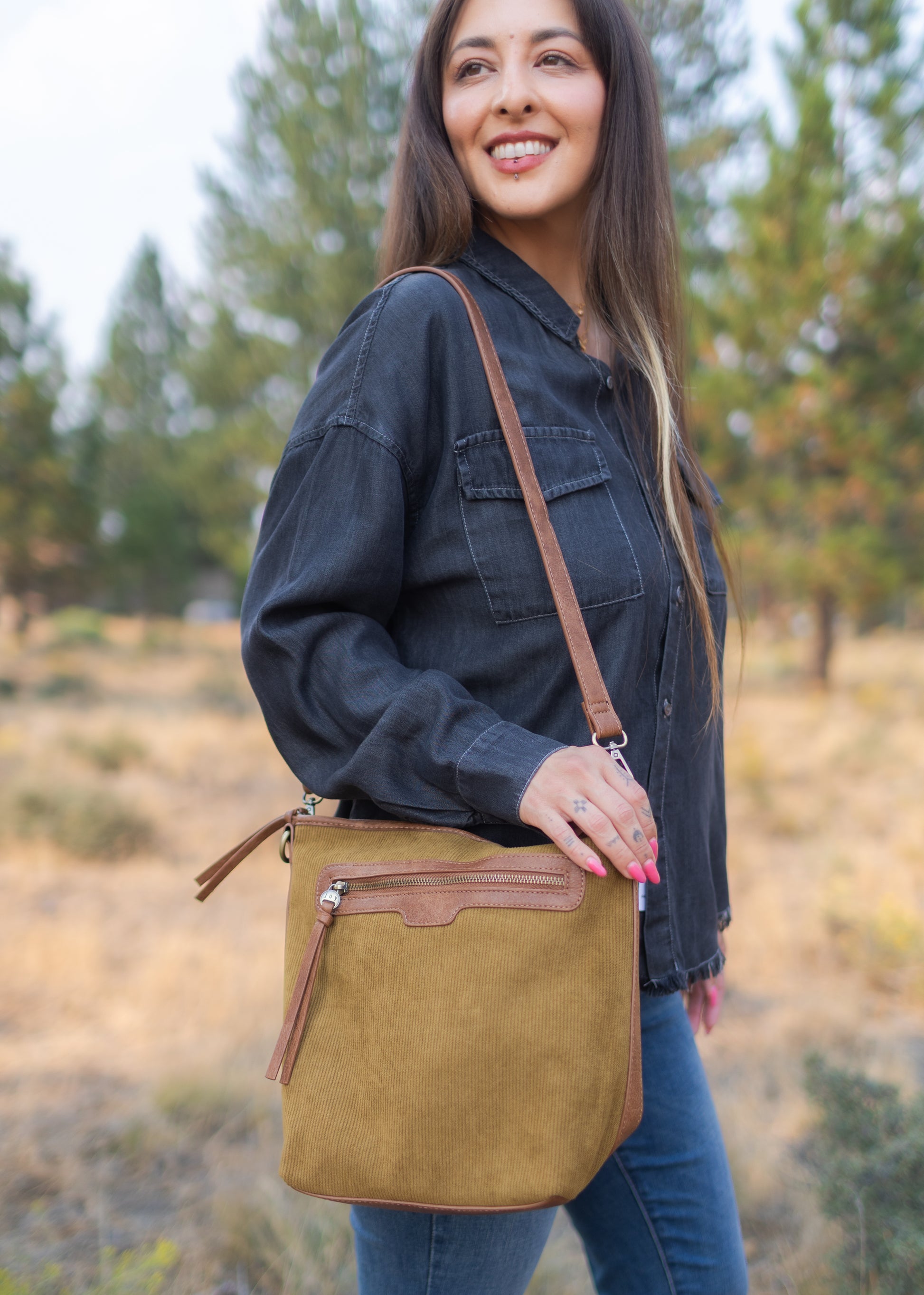 This soft & slouchy bucket style bag is accented with a zip closure, front zip pocket, and adjustable shoulder strap - all crafted in cozy corduroy in the most beautiful olive green shade.
