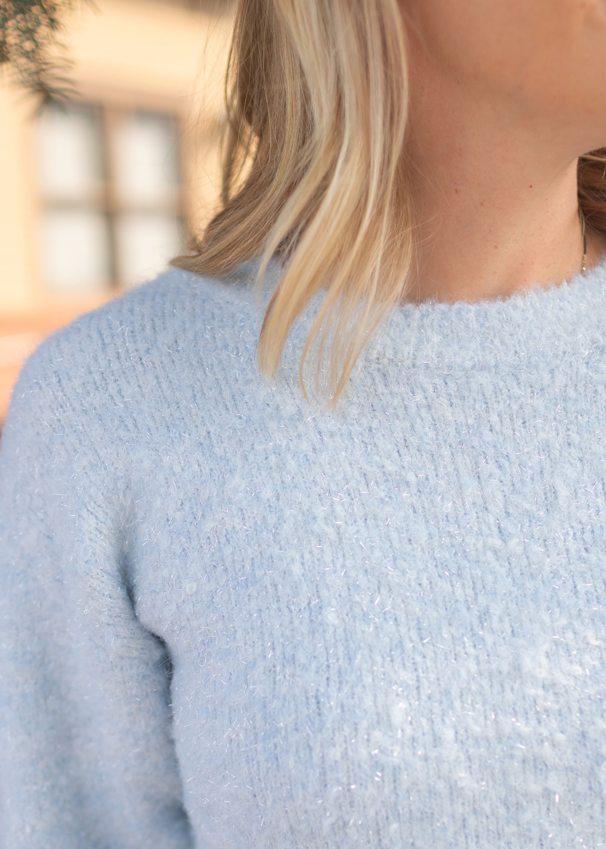Get ready to shine bright this holiday season with the Cozy Sparkle Sweater in Light Blue! Its fuzzy texture feels like a warm hug, and the relaxed fit makes lounging or dancing through New Year's a breeze. With silver sparkly threads woven in, you’ll sparkle just enough to catch every eye at Christmas parties or festive get-togethers. Cozy never looked so fun!