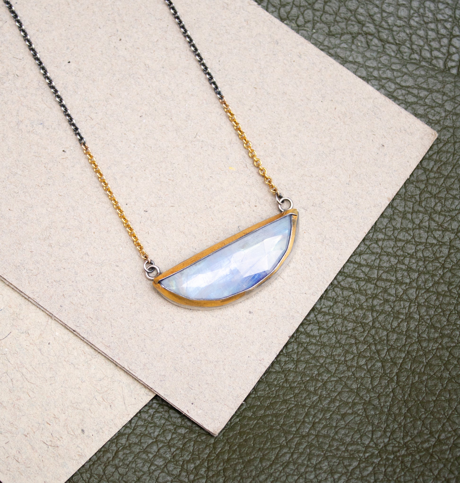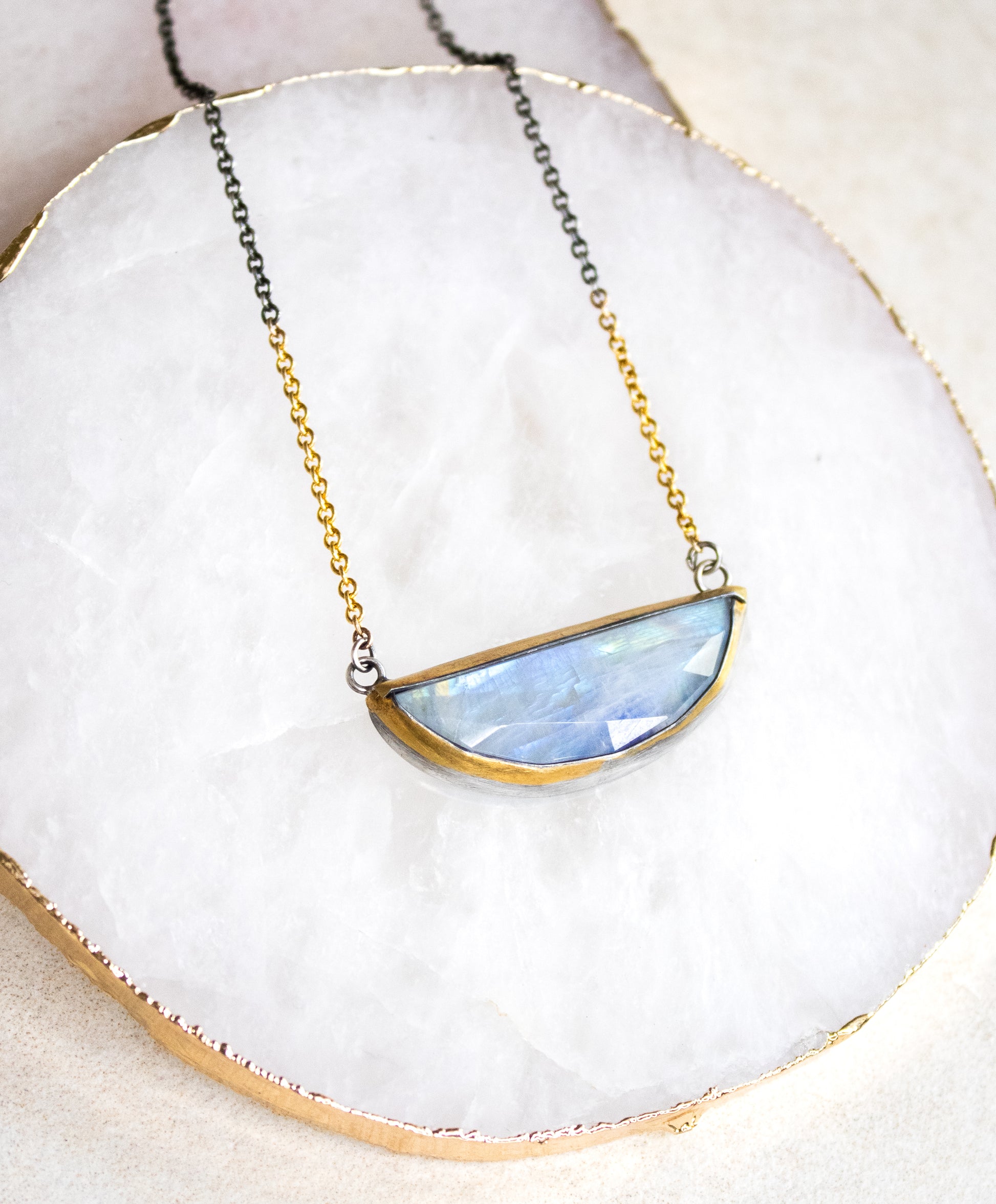 A lovely rose cut crescent shaped moonstone is set in oxidized silver with accents of 24k gold. Chain has a subtle transition from 14k gold fill to oxidized sterling silver.