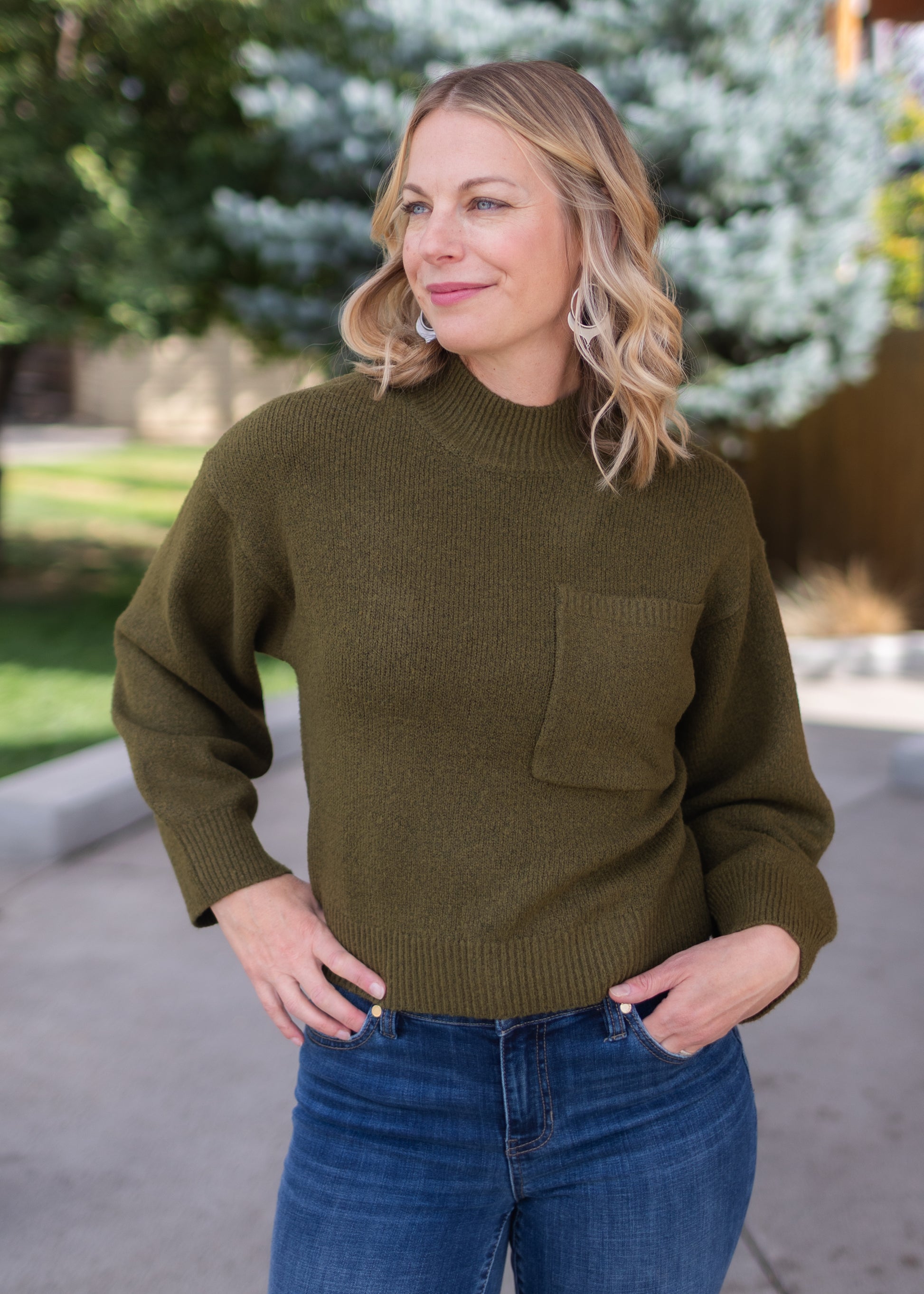 Cozy up this fall in this must-have cropped sweater! The unique front pocket is the perfect addition and the rich olive green hue pairs great with denim or leggings. Layer it over a dress or under a jacket - however you decide to wear it, it's the perfect versatile addition to your fall wardrobe!
