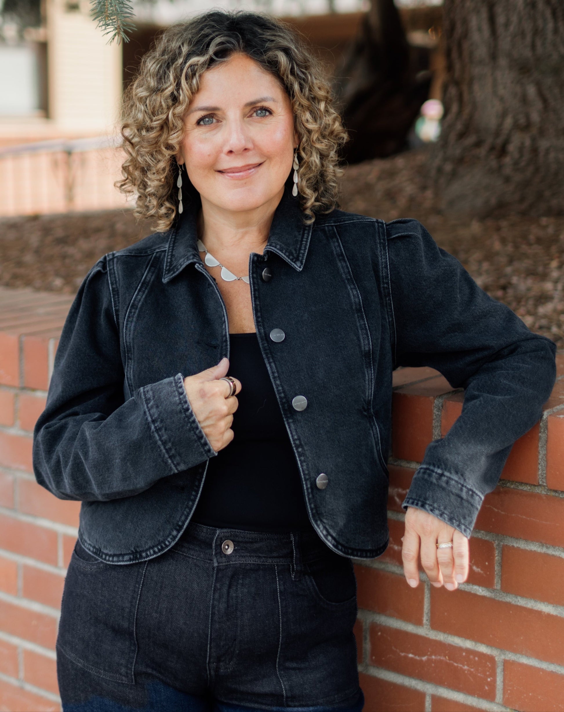 What a fun twist on a denim jacket! This one has a curved hem, cropped length, and slight puff sleeve. Pair with jeans or layer over a dress.