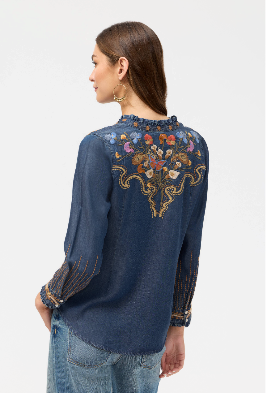Durago Ruffle Neck Shirt in Denim | Johnny Was