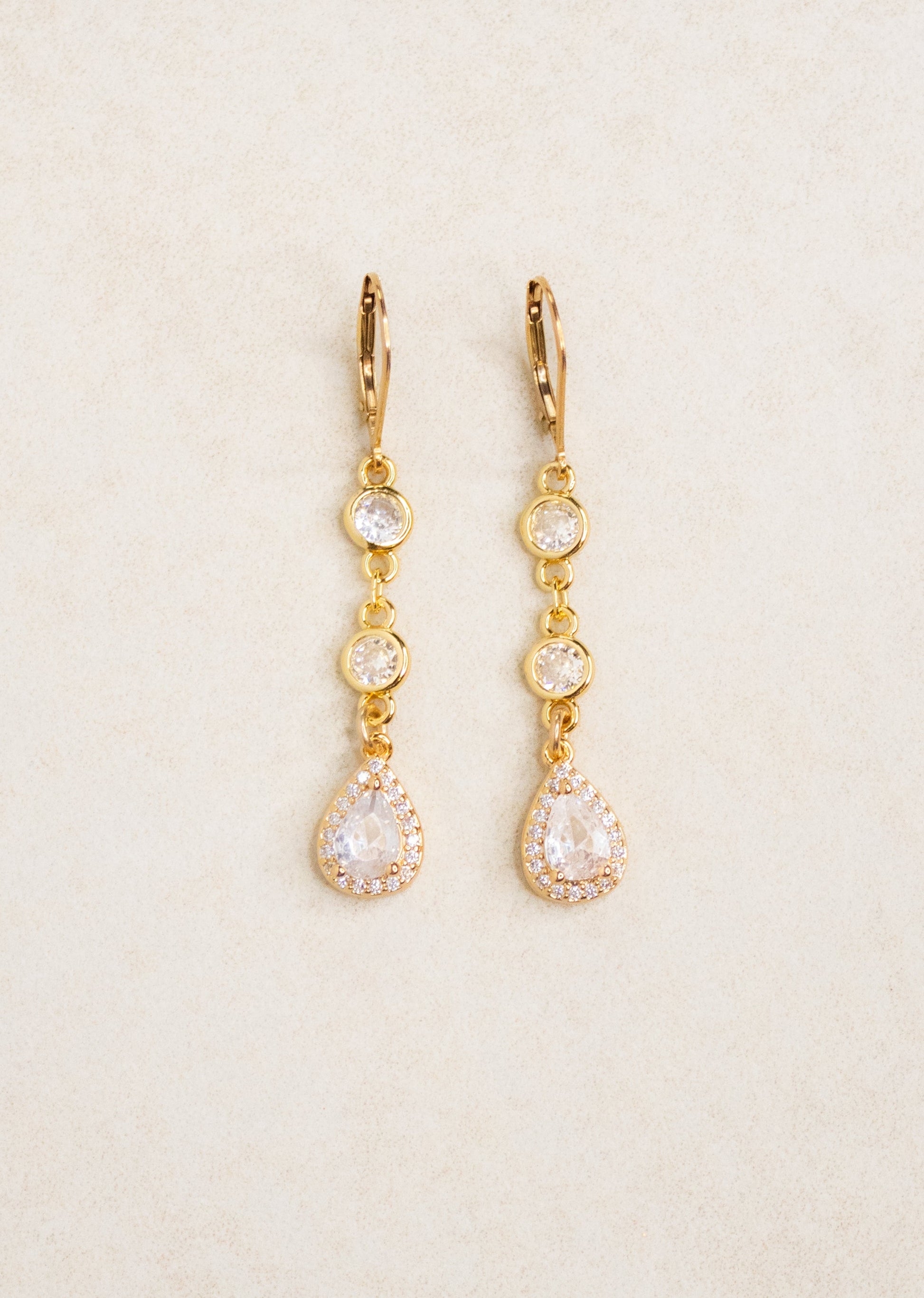 Delicate gold dangle earrings featuring two small bezel-set stones that lead to a sparkling teardrop shaped stone with a halo of shimmer, just the right amount of elegance for everyday wear or special occasions.