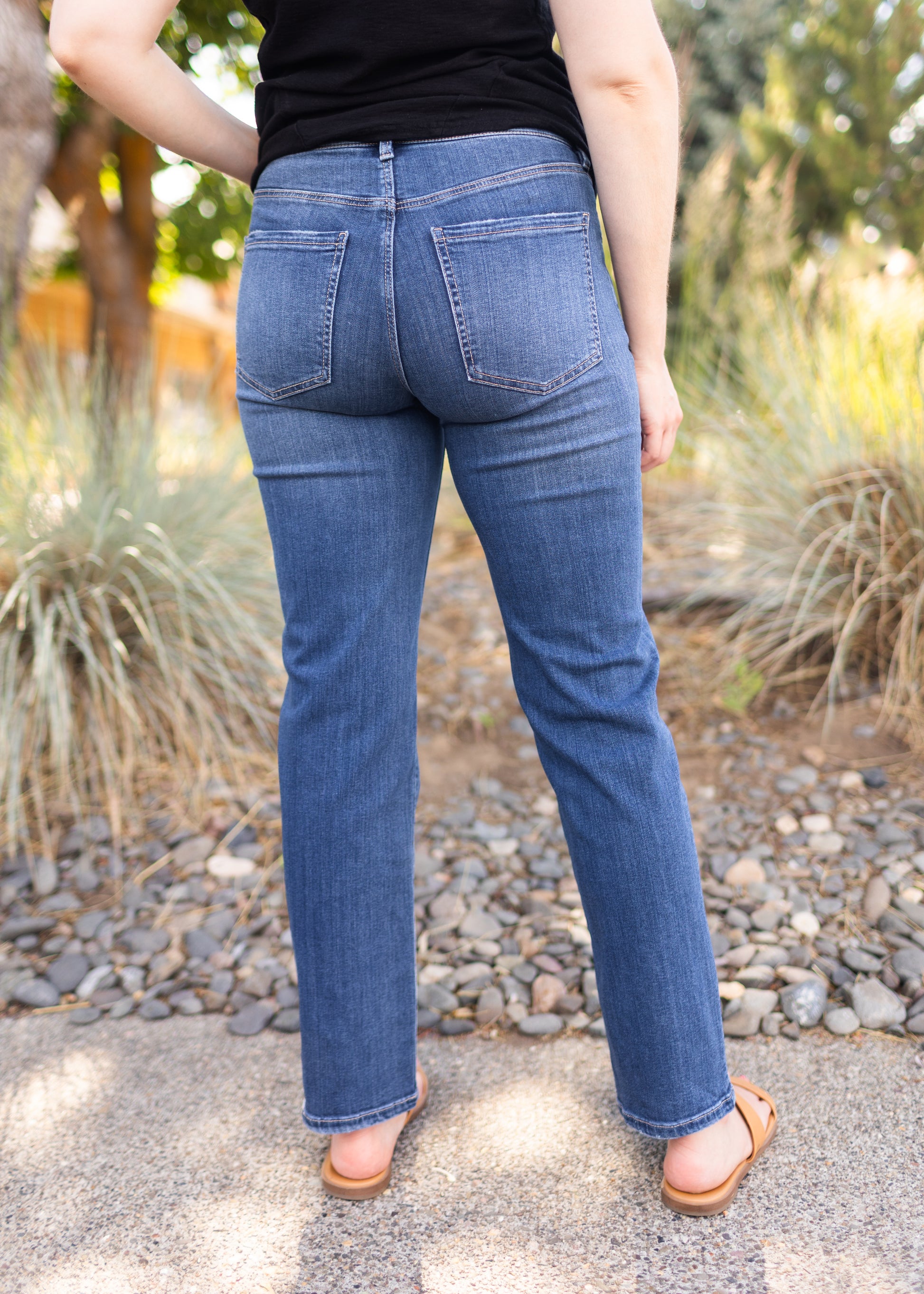 A comfortable and sleek jean with a secret elastic waistband, creating a slimming look without losing functional belt loops or pockets.