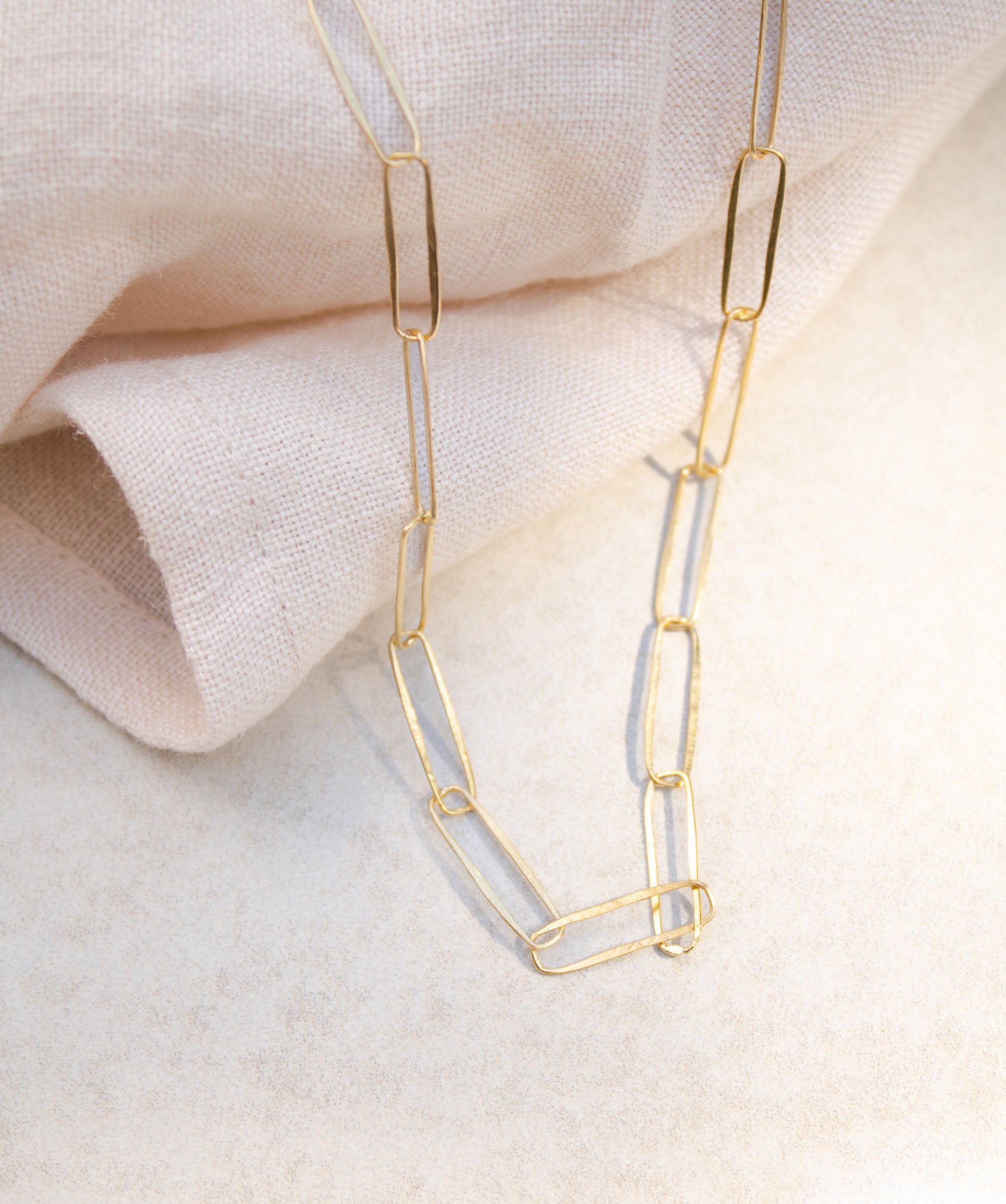 Hand-hammered wire rectangles linked together make up this lightweight delicate chain. Great piece to have in your arsenal of accessories!