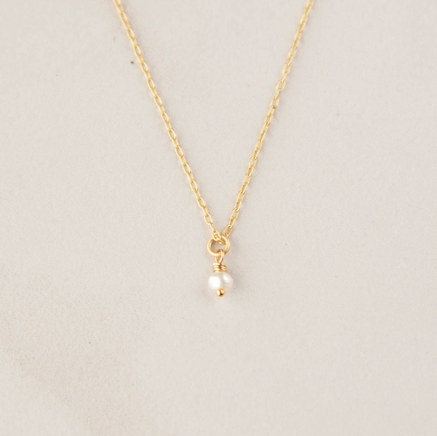 A delicate, freshwater pearl hangs on a gold-plated or sterling silver chain. Chain measures 16'' long with a 1.5'' extender. All metals are hypoallergenic and nickel free.