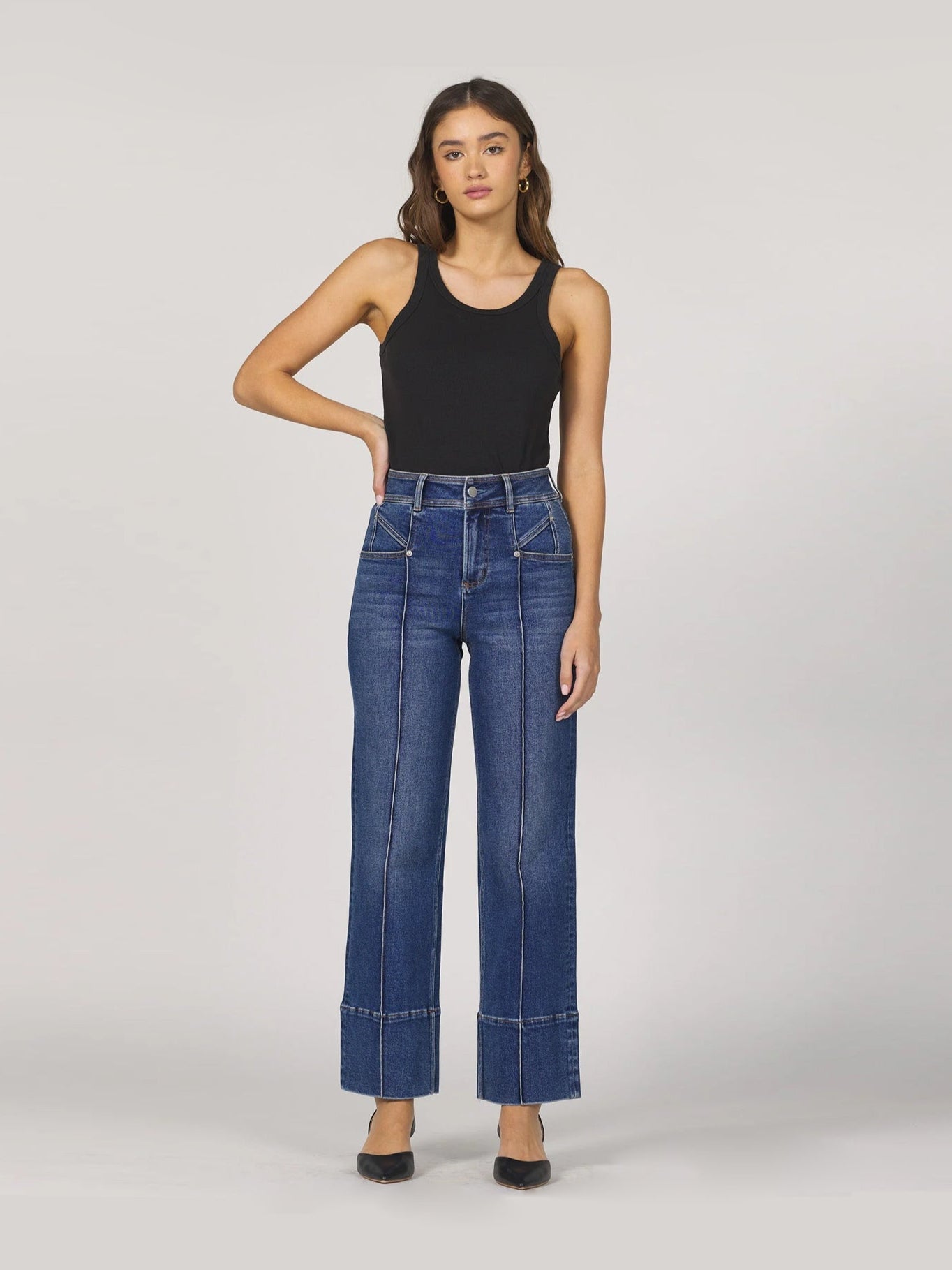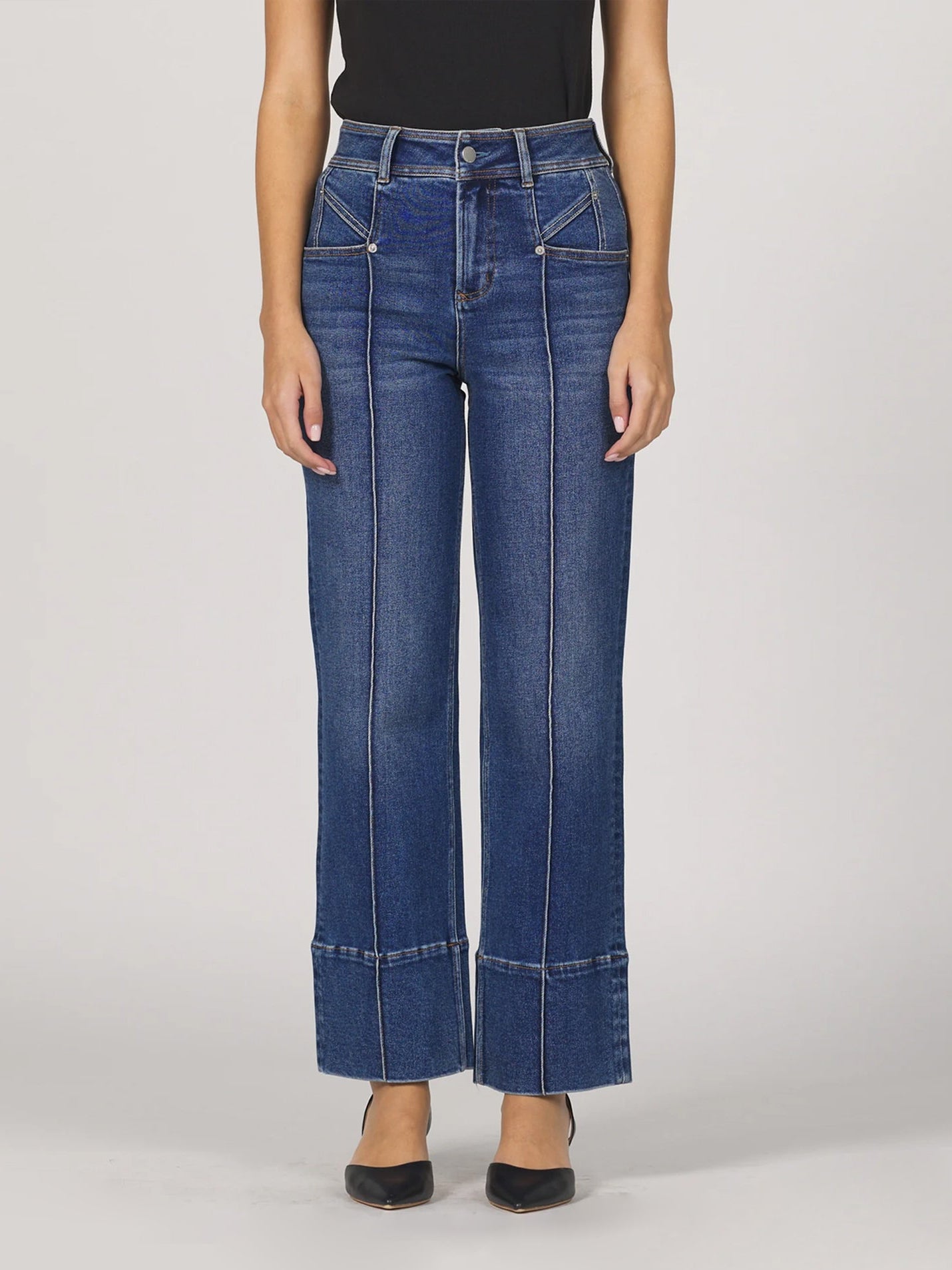 A statement-making jean, resting at the natural waist and straight through the leg. This pair features a fun front seaming detail and an extra wide hem for some added detail.