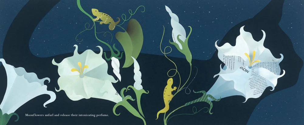 In the night garden, nothing is as it seems and everything is made new. Blinking stars and pale moonlight might reveal a lone cat tiptoeing across a roof, luminous flowers unfurling in the cool air, a mama fox escorting her sleepy cubs home. Listen closely and you might hear the wind blowing through the trees, the murmur of a slow stream, or the gentle song of crickets and bullfrogs, lulling you to sleep.