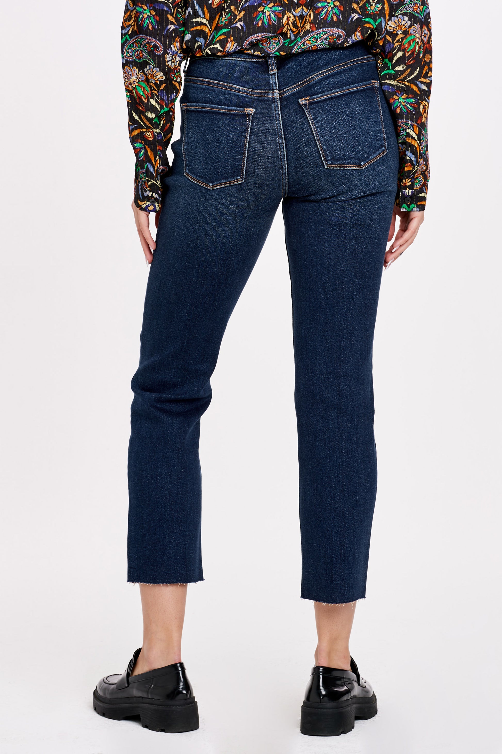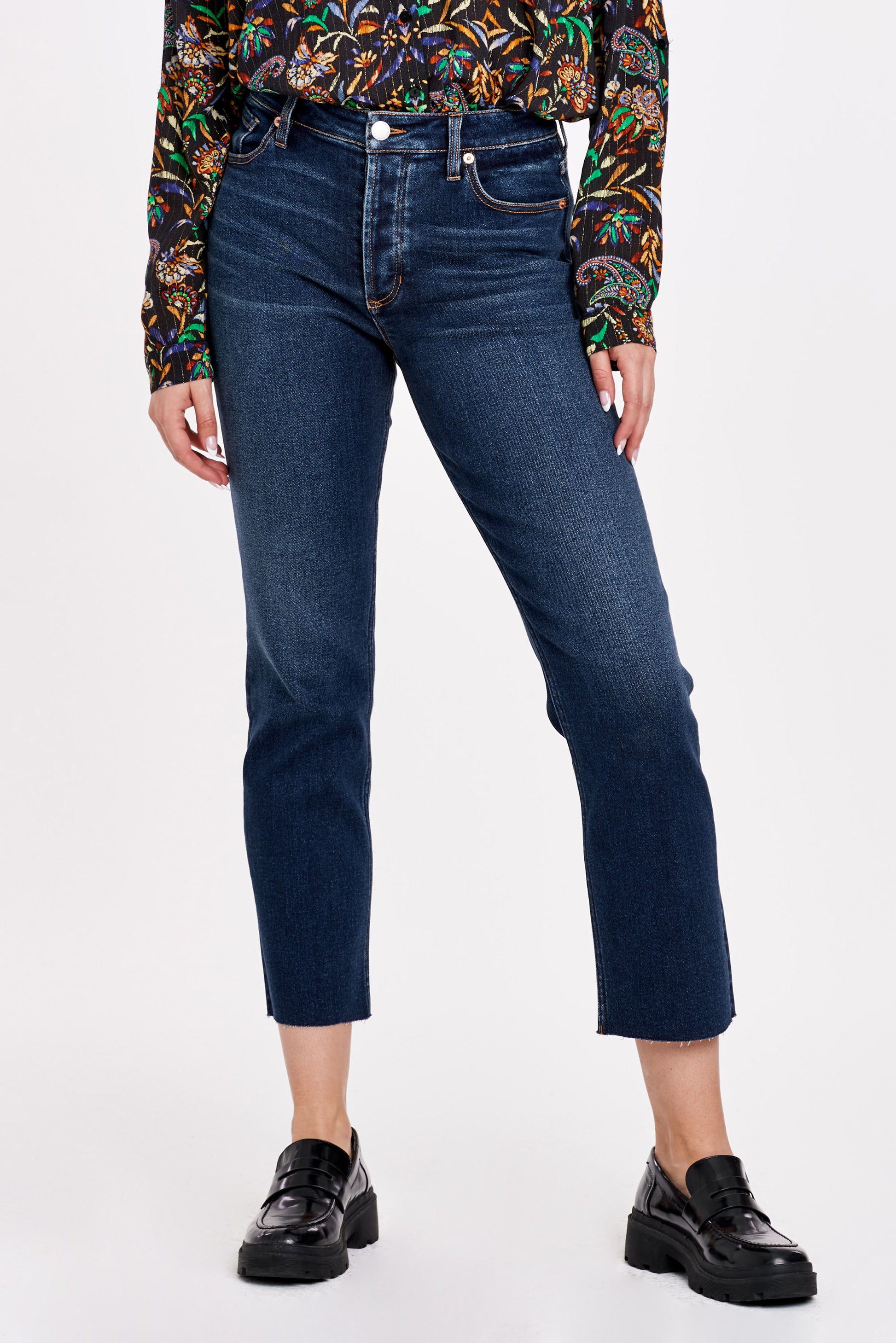 Straight leg finish with super high rise. It's the friendly fit that sits at natural waist and fitted slender from the hip to mid thigh. Cropped inseam on comfort stretch denim accented with wash destructions.