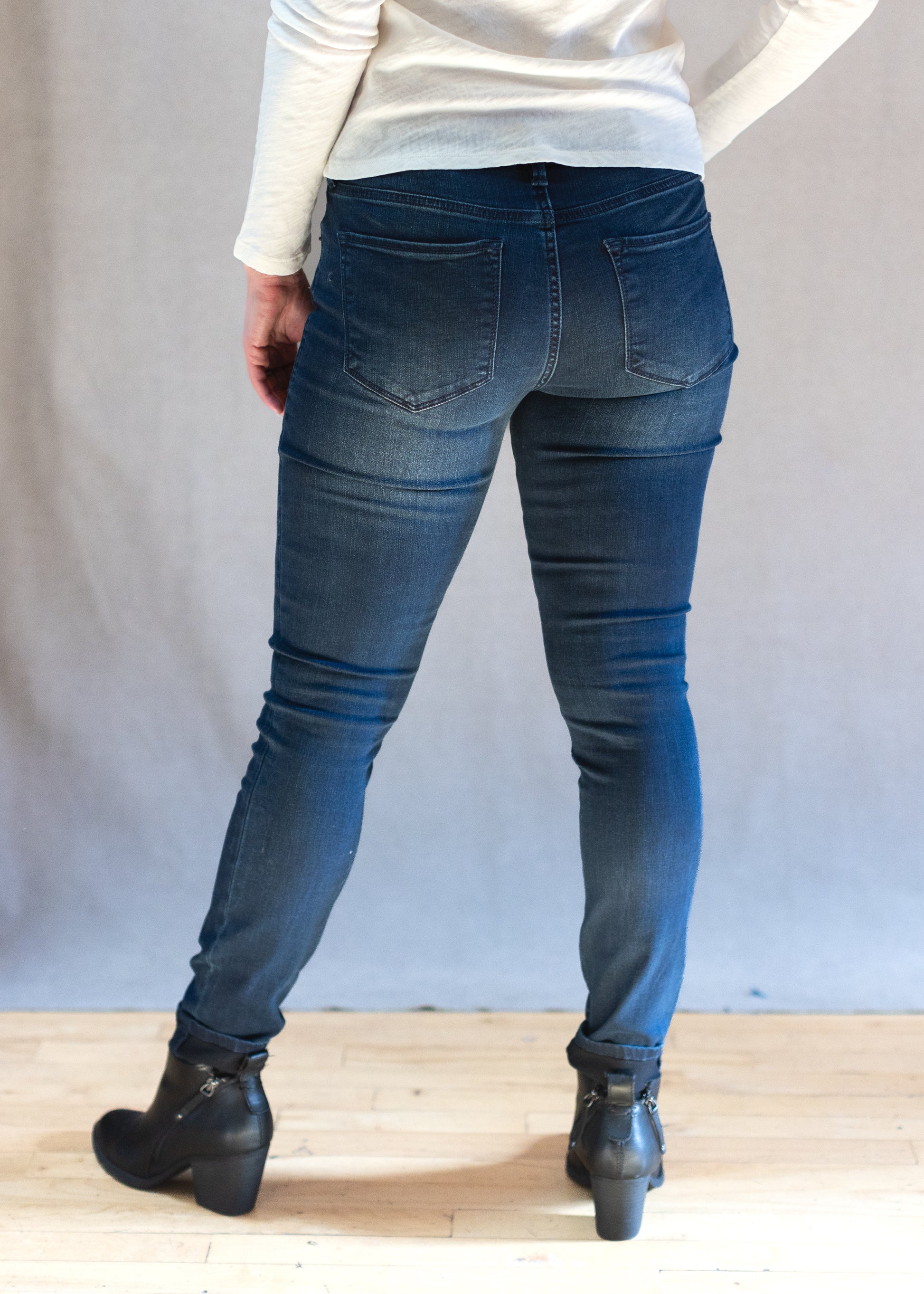 A classic skinny jean in that denim blue color that works with everything! Mid rise, and fitted through the leg.