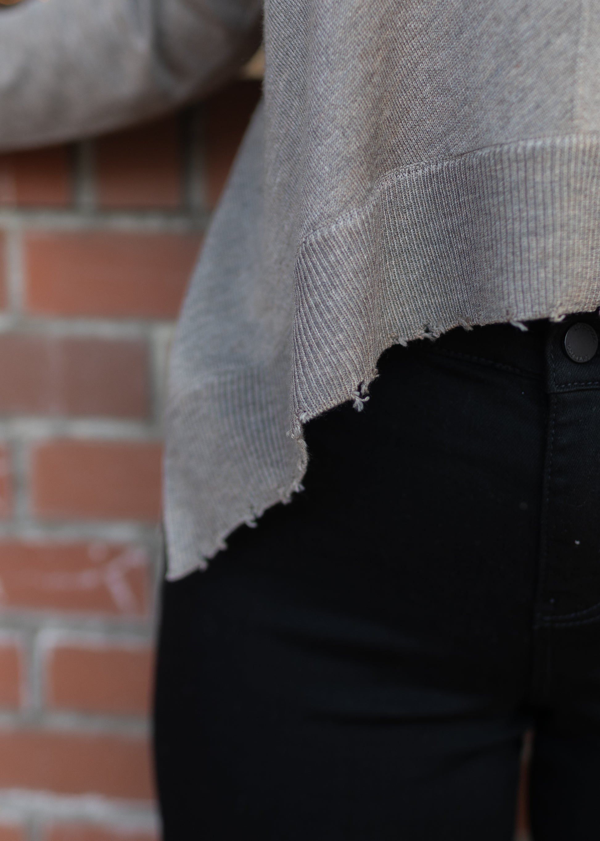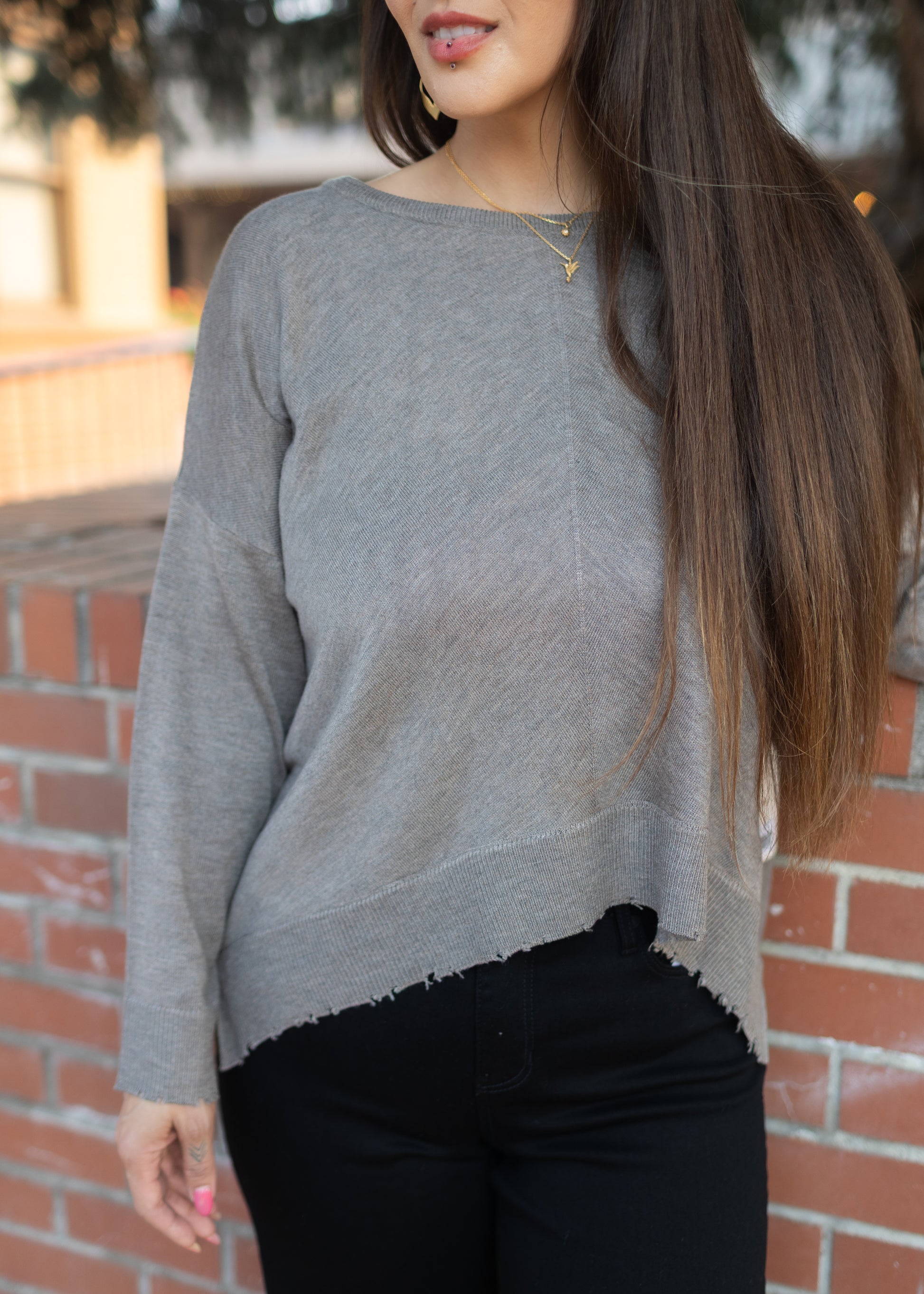 The charm of this casual top is all in the intricate details. The chevron-shaped center front seam and distressed hi/lo sweep are signatures of this design. Its voluminous shape will drape your figure in all the right places.