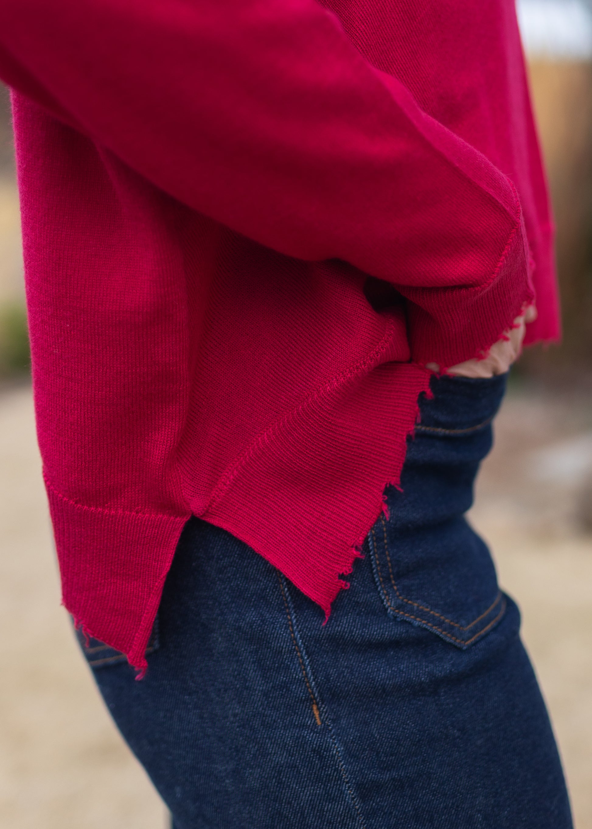 The charm of this casual top is all in the intricate details. The chevron-shaped center front seam and distressed hi/lo sweep are signatures of this design. Its voluminous shape will drape your figure in all the right places.