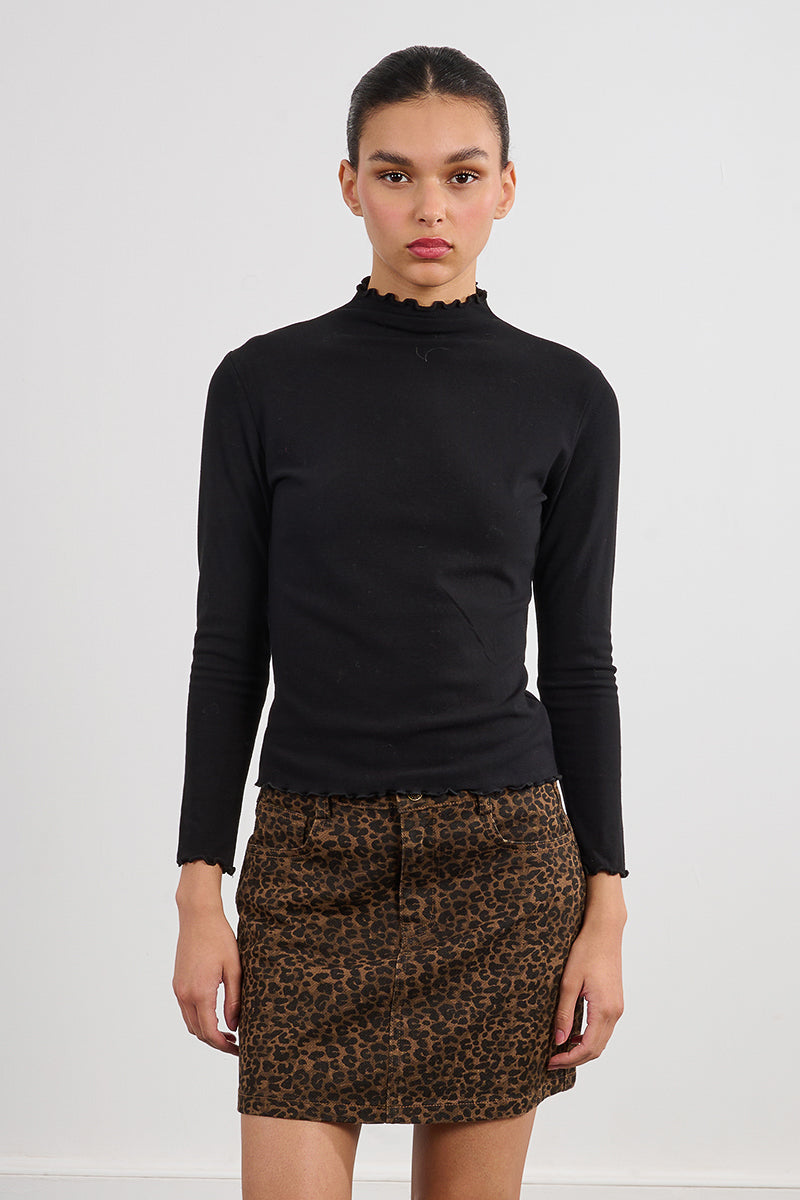 Stay warm and stylish with our Lettuce Edge Fleece-Lined Mock Neck in Black. Crafted from thick knit fabric, this long-sleeve top features cozy fleecy lining for ultimate comfort. The delicate lettuce edge hems add a subtle, feminine touch. Perfect for layering under sweaters, it combines warmth and elegance effortlessly to keep you comfortable all day long.