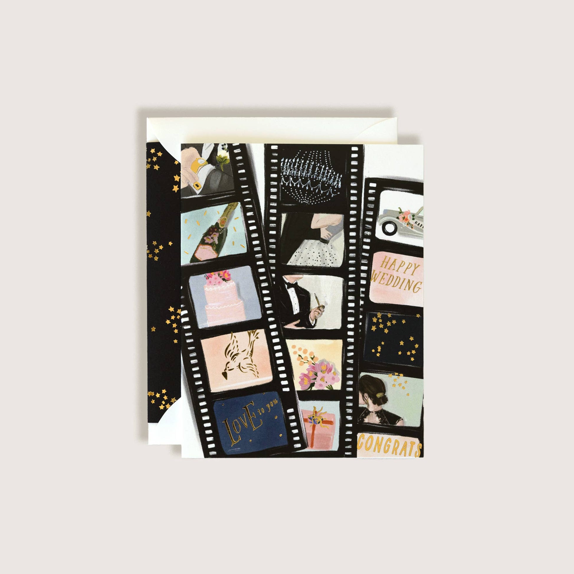 Just Like in the Movies Card. Illustrated film clippings of romance, stars, love and celebration.
