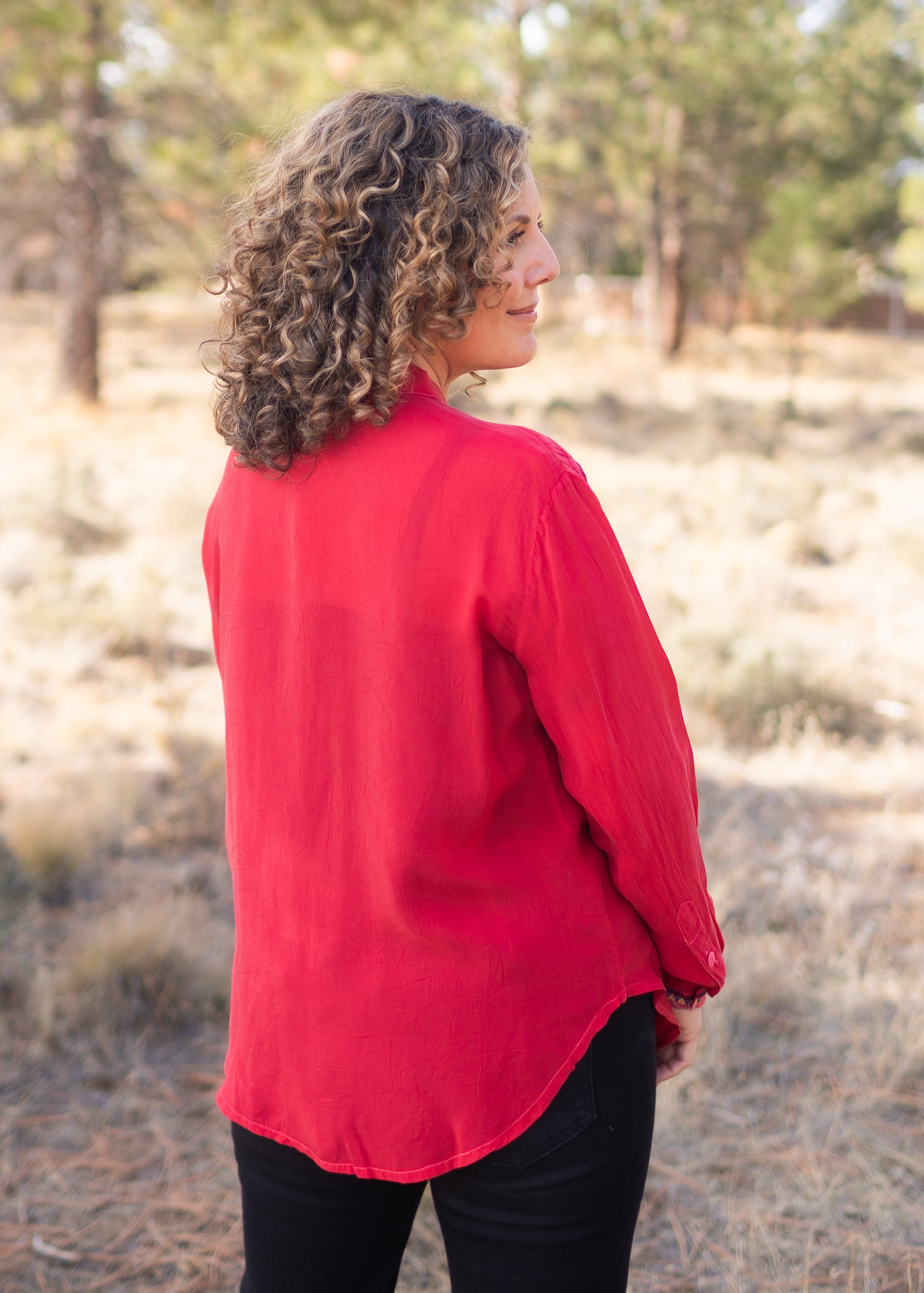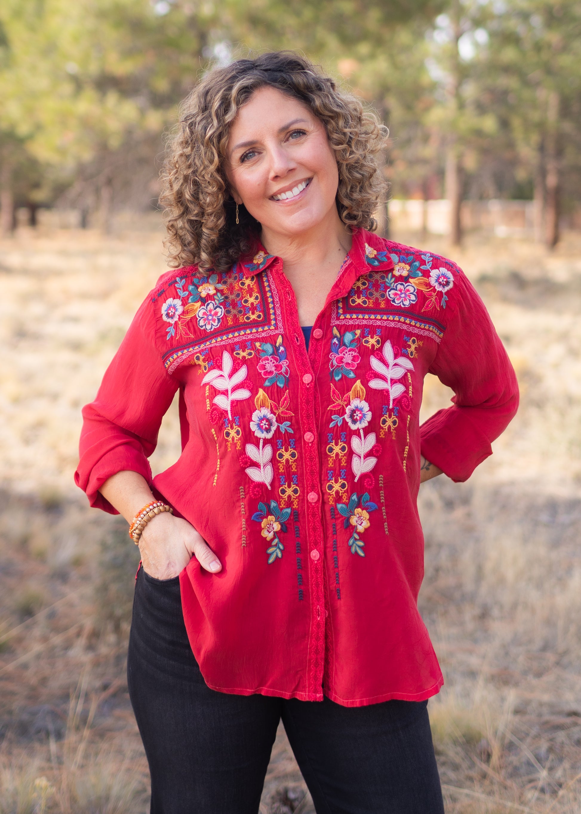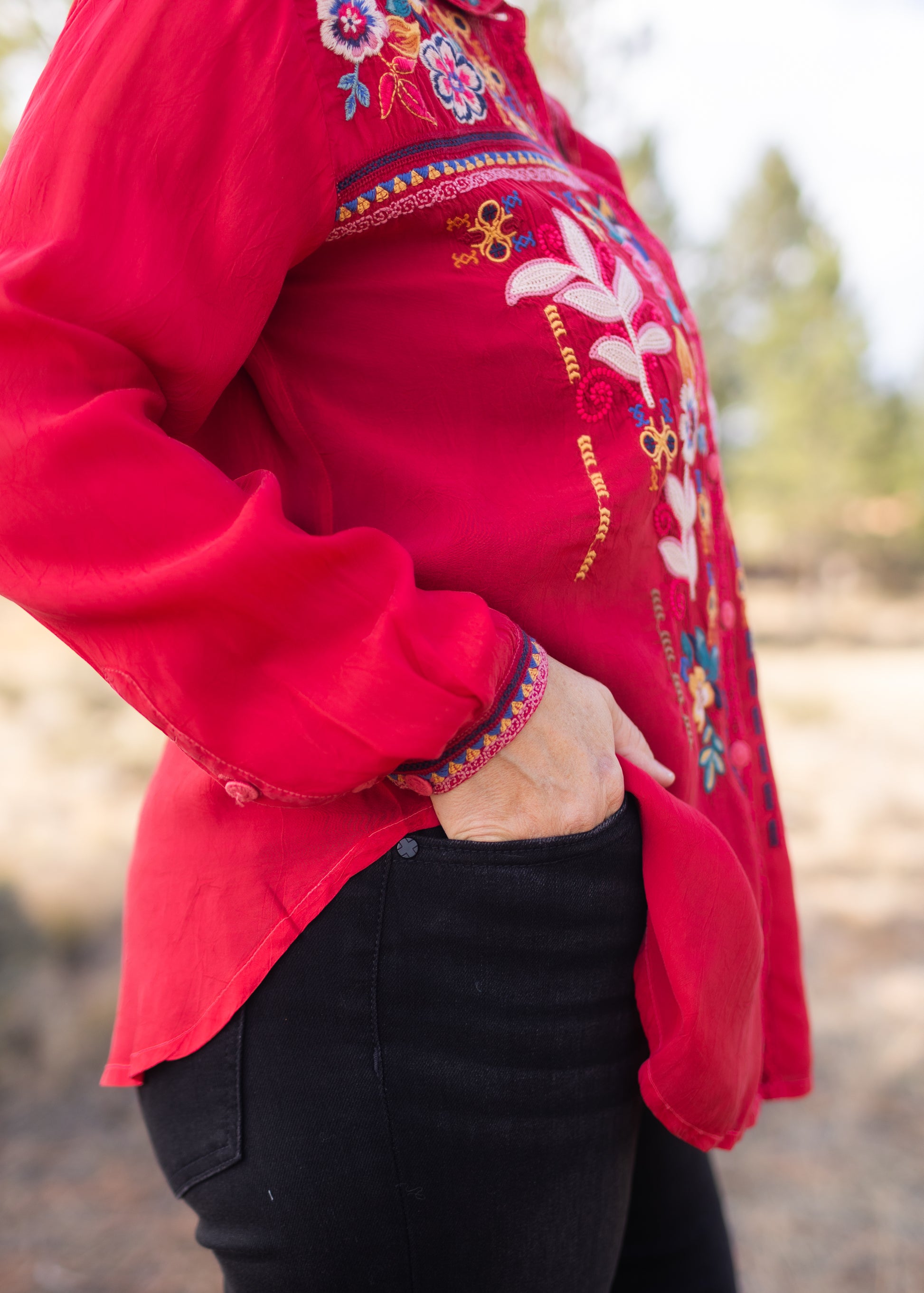 A vibrant crimson button up blouse with stunning floral embroidery in pink, gold, and blue hues. Finished with a collared neckline, embroidered button placket, and flowy silhouette, it’s an effortless mix of artistry and bohemian charm, perfect for brightening cool-weather days.