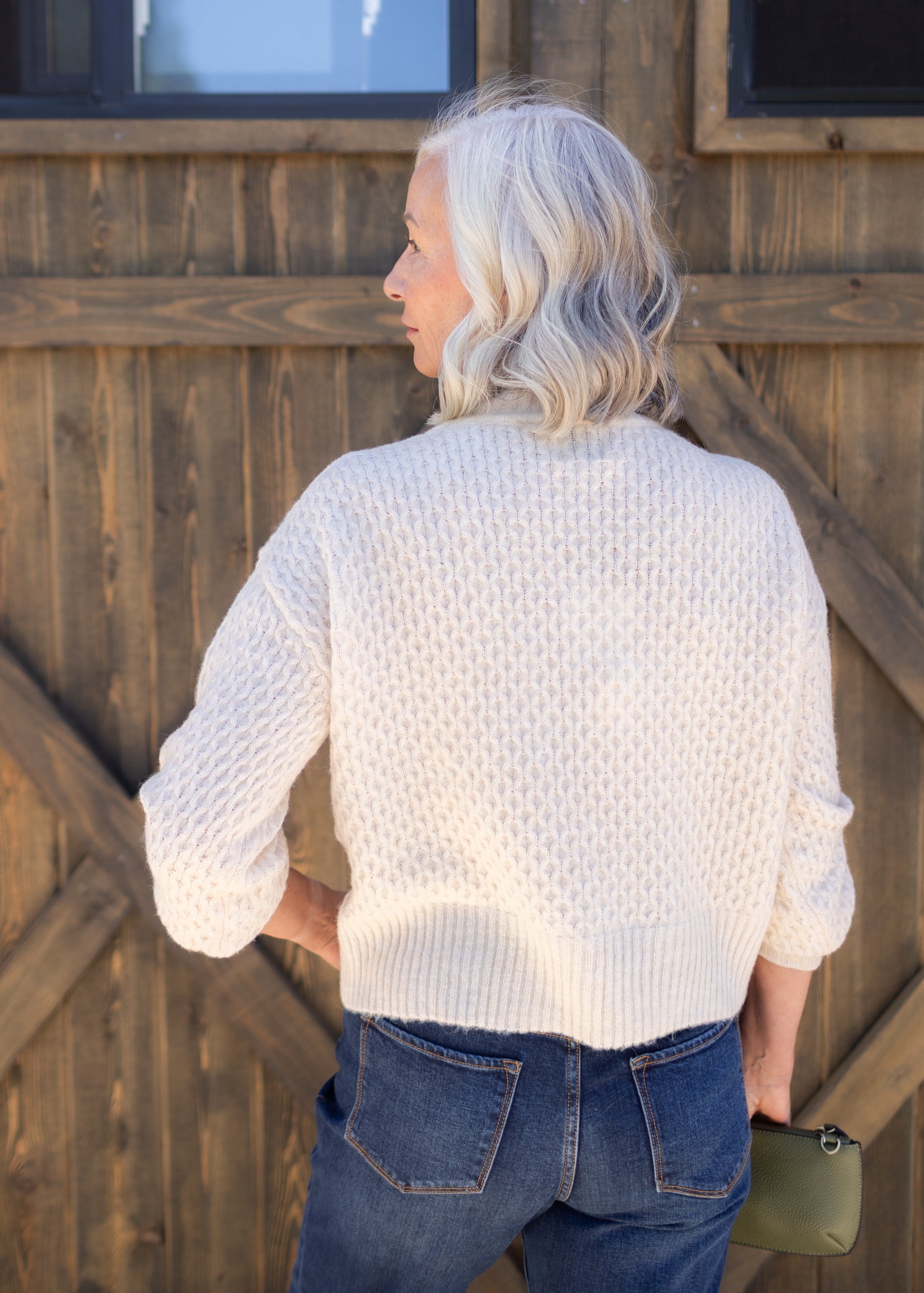 Experience the perfect blend of style and comfort with this cream mock neck sweater. Its unique chain-like knit pattern and warm peach undertone add subtle sophistication, while the wide rib hem and long blouson sleeves create a flattering, modern silhouette. Elevate your wardrobe with this versatile piece that promises both chic and cozy vibes!