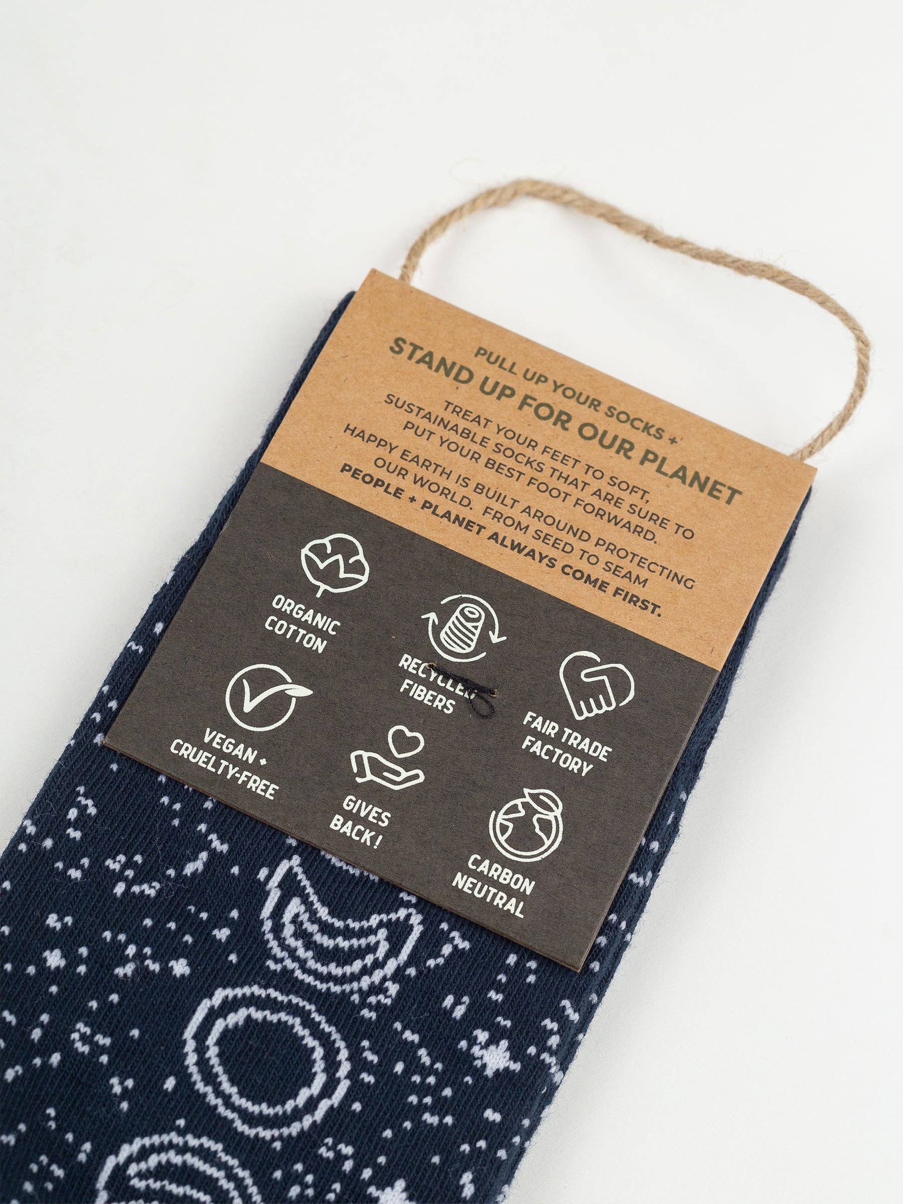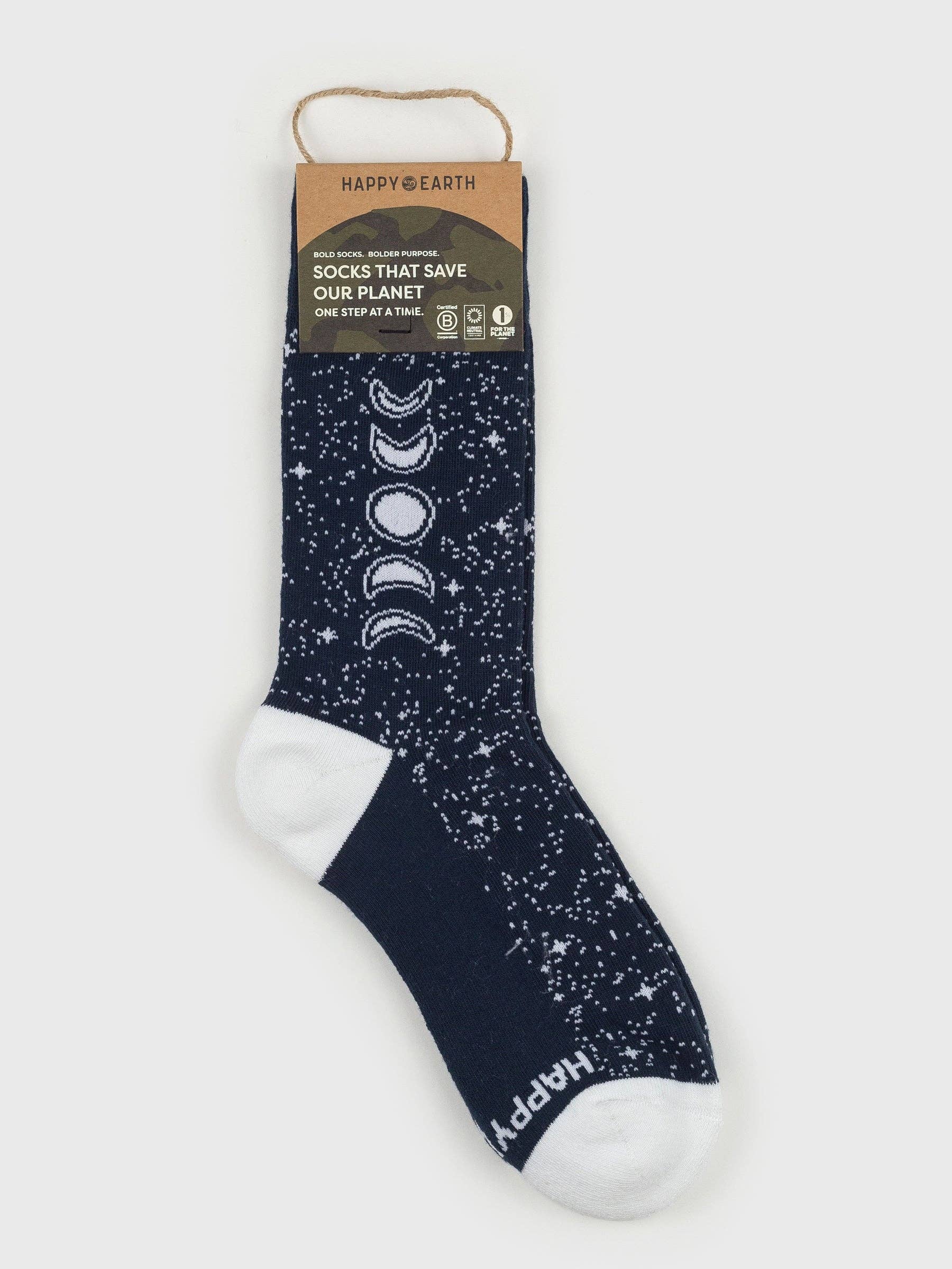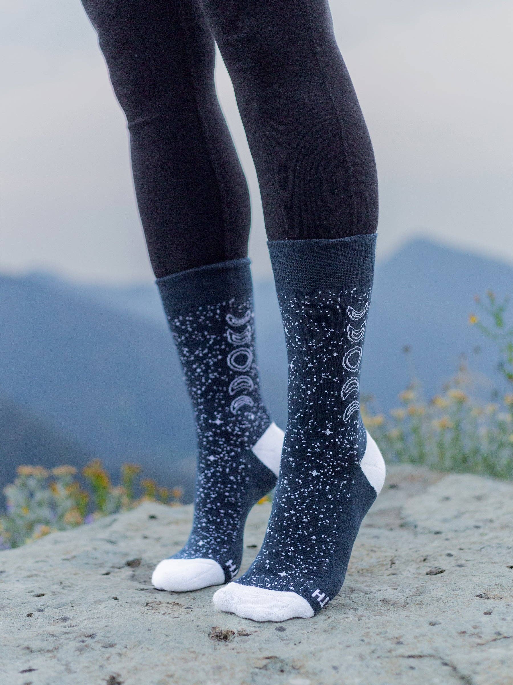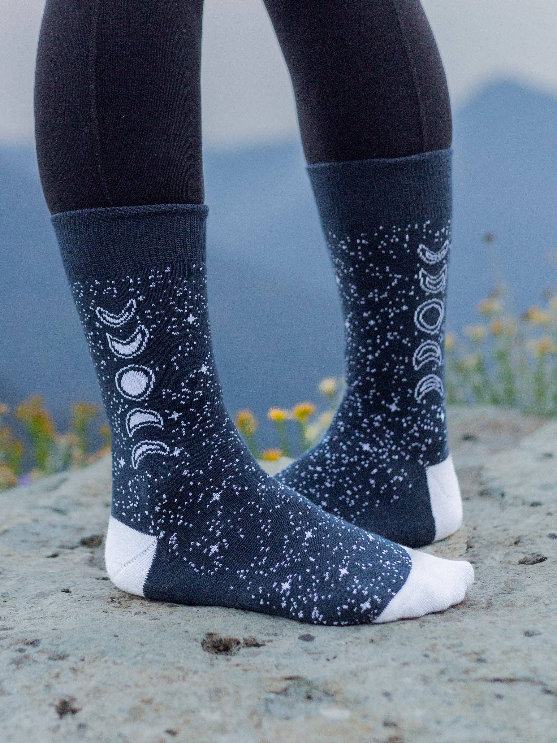 A pair that truly dazzles. Midnight blue speckled with white stars and moon phases. Soft, supportive socks made to put your best foot forward. Knit from comfy, breathable organic cotton with a touch of recycled nylon and elastane to enhance flexibility and moisture-wicking performance.