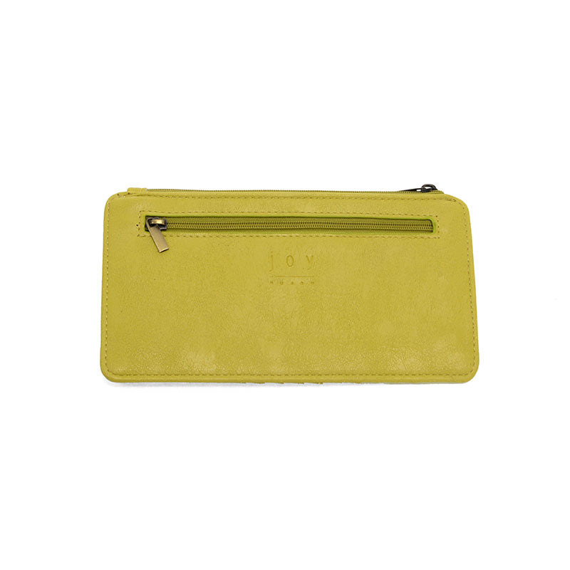 This slim and sleek card wallet has 9 credit card pockets, an ID window, zippered change pocket, and zippered billfold pocket all in casual distressed Vegan Leather.