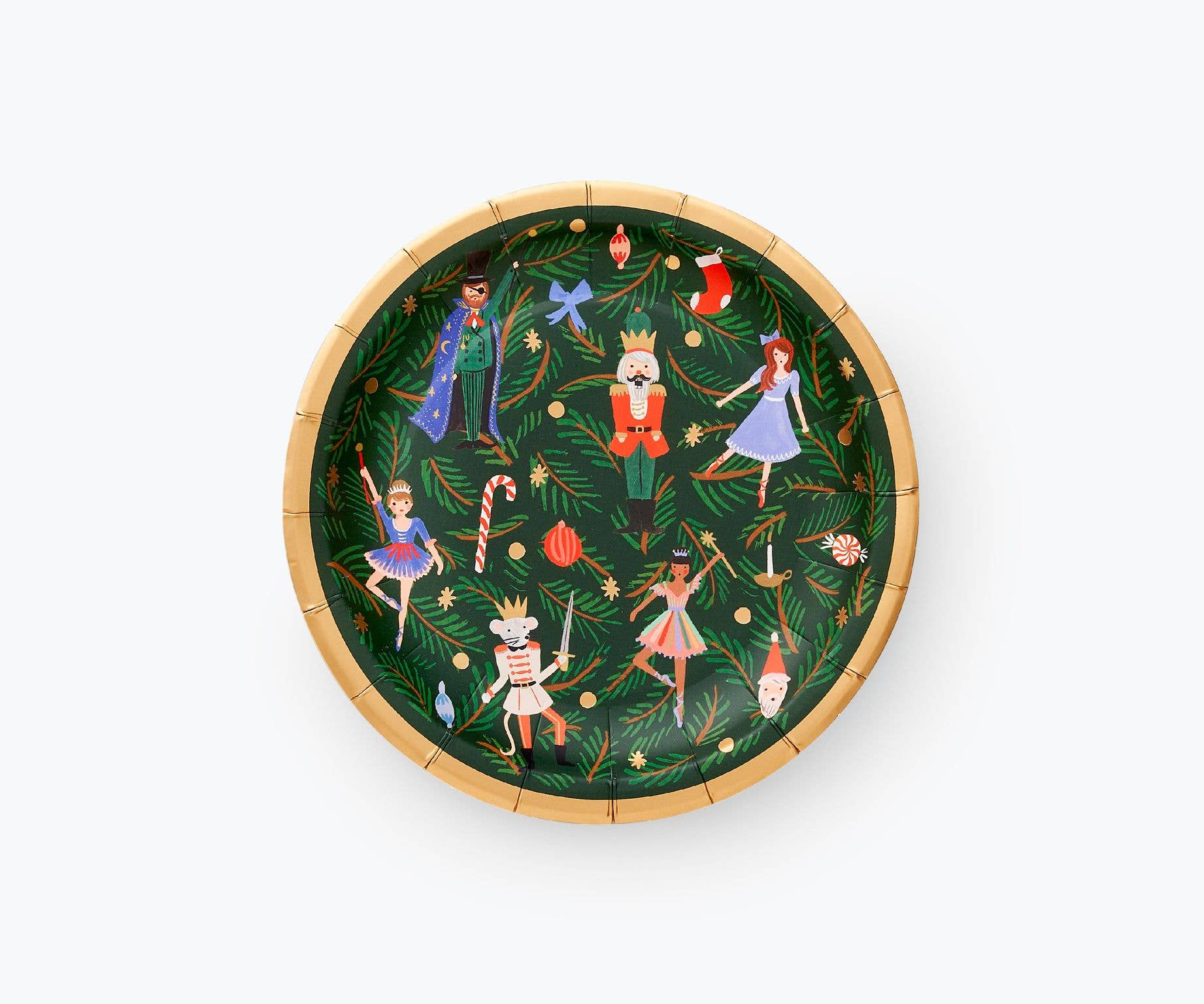 Our small holiday party plates featuring your favorite Nutcracker characters and gold foil accents are a festive touch for any family gathering, cookie decorating event, or Christmas party.
