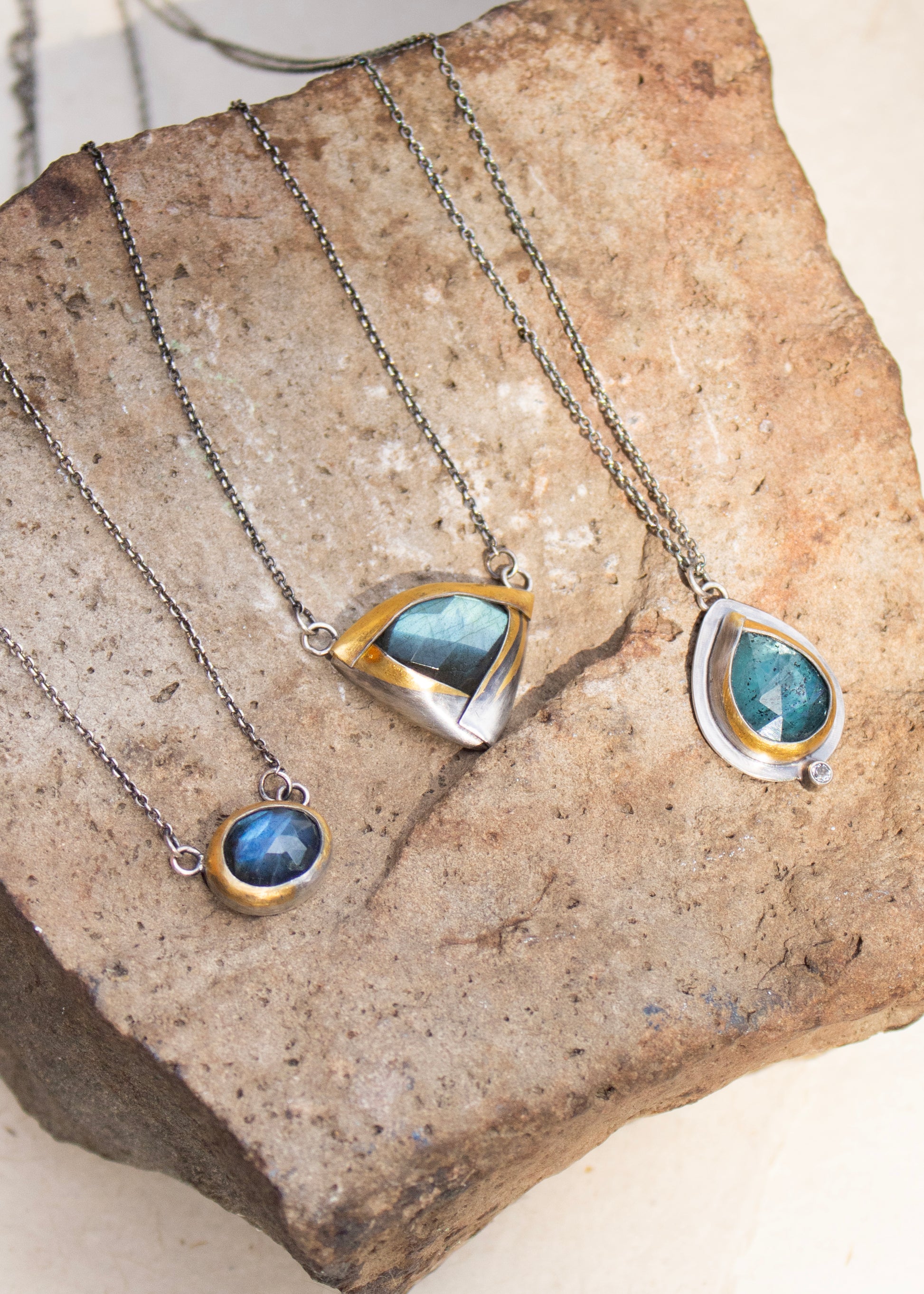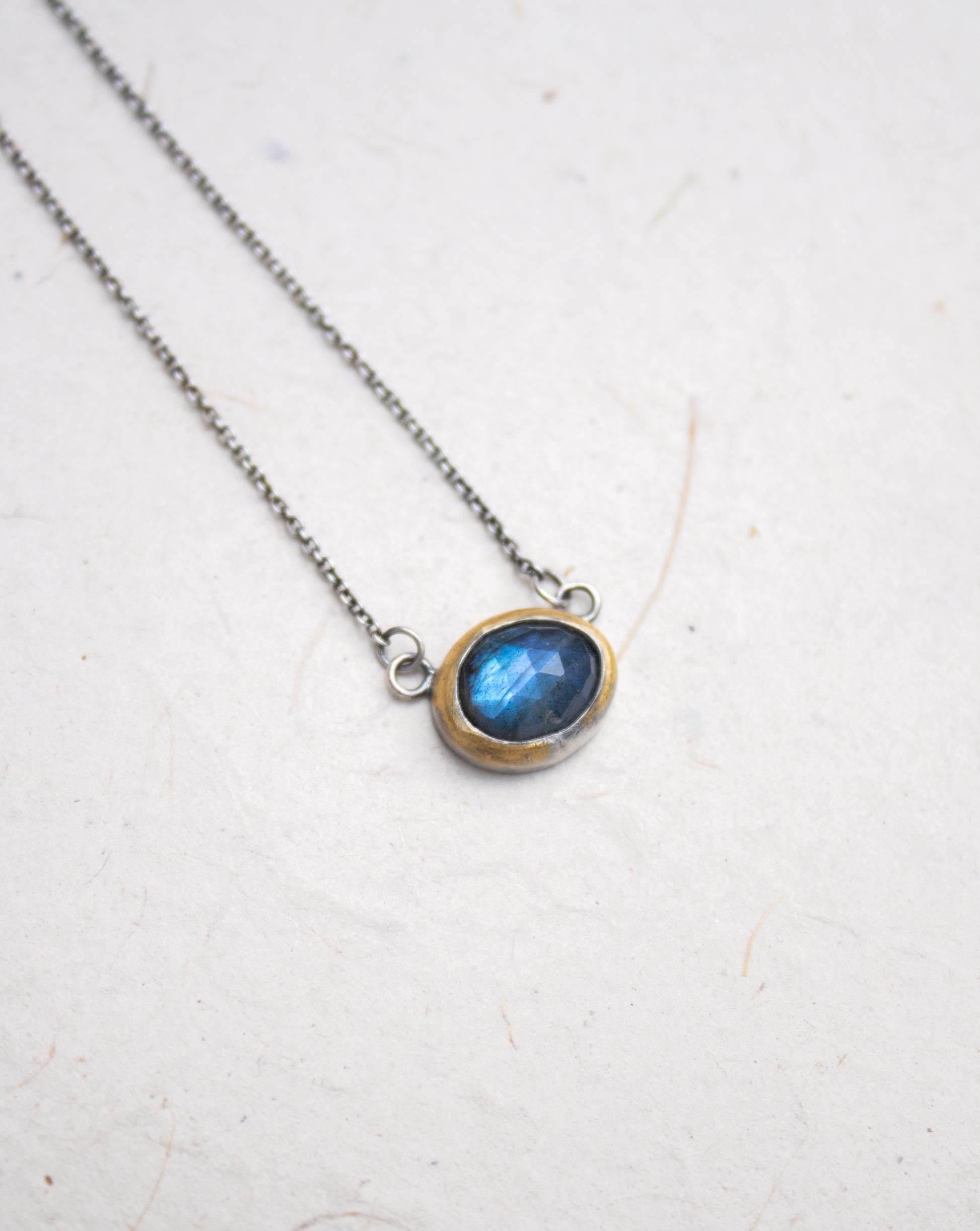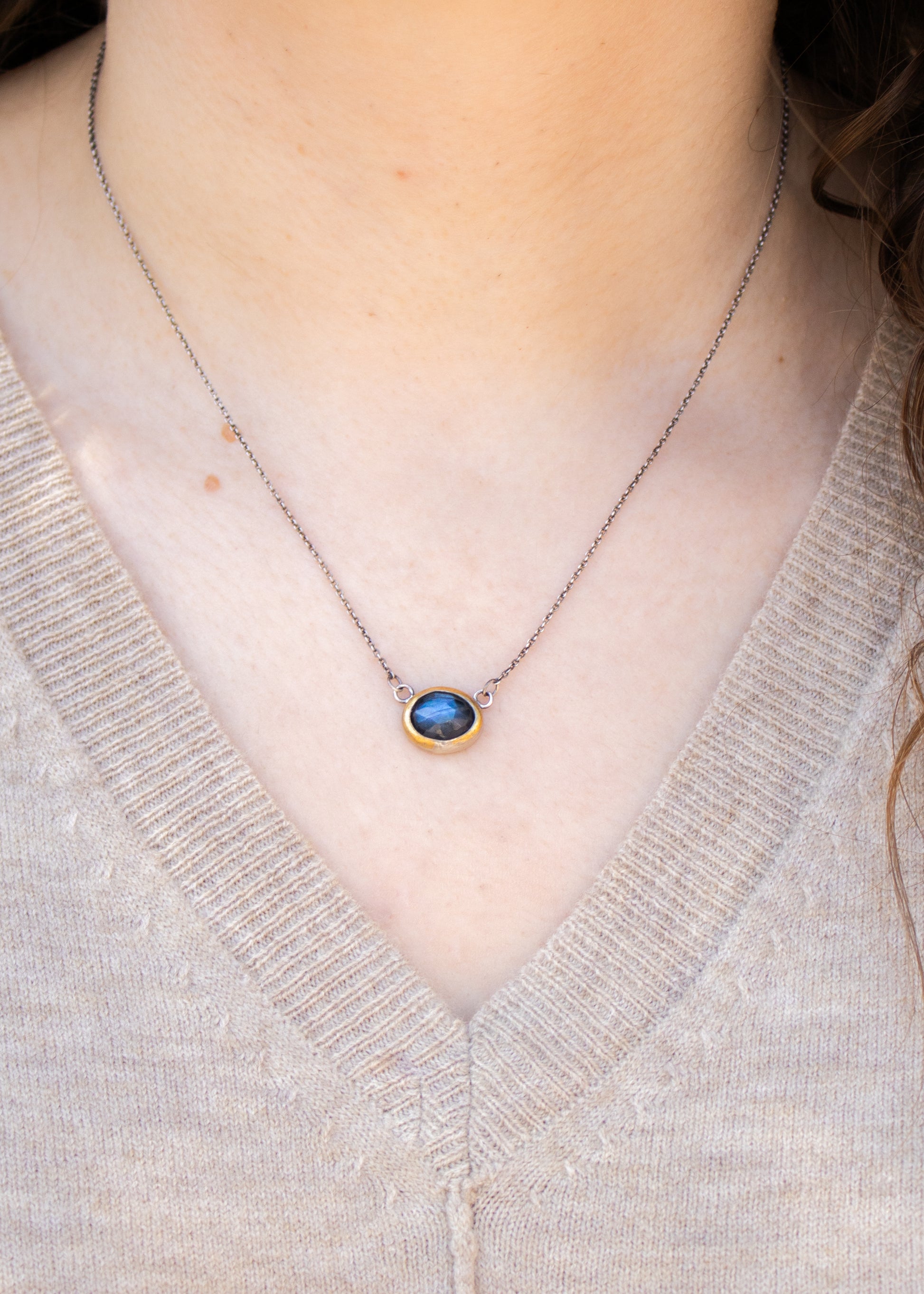 Juicy rose cut gemstone set in oxidized silver with 24k gold accents oxidized silver chain.