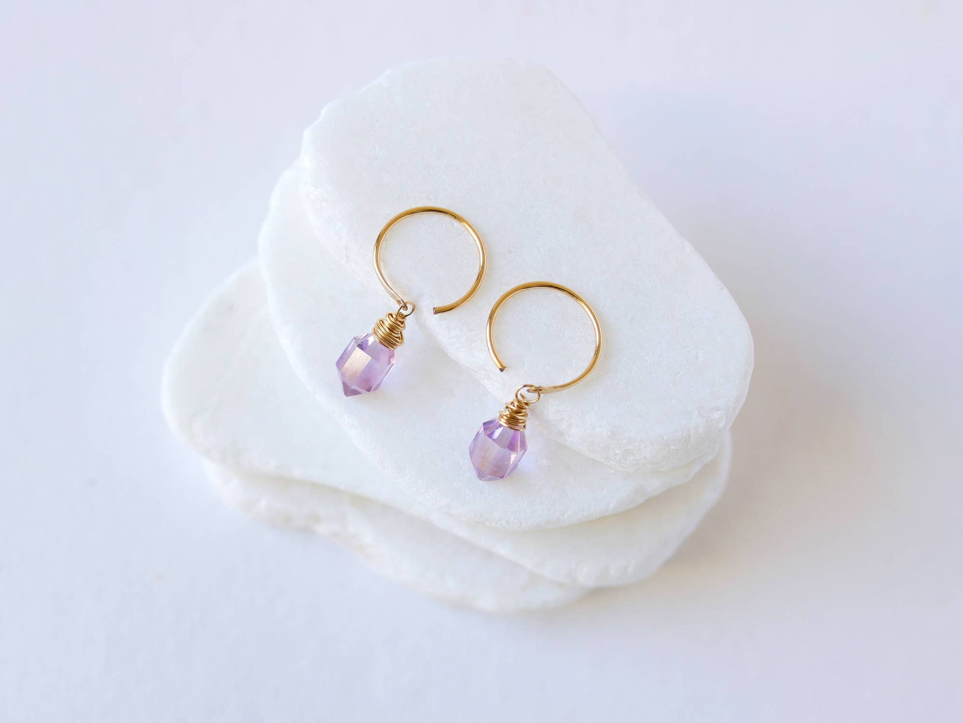 Hand crafted hoops in a thick but comfortable metal are shaped, drilled, hammered and polished for a sleek and shiny threader style huggie. These huggies are adorned with faceted Pink Amethyst double pointed briolettes wrapped securely and beautifully. These stones are a soft lavender color adding a gentle pop of color any look.