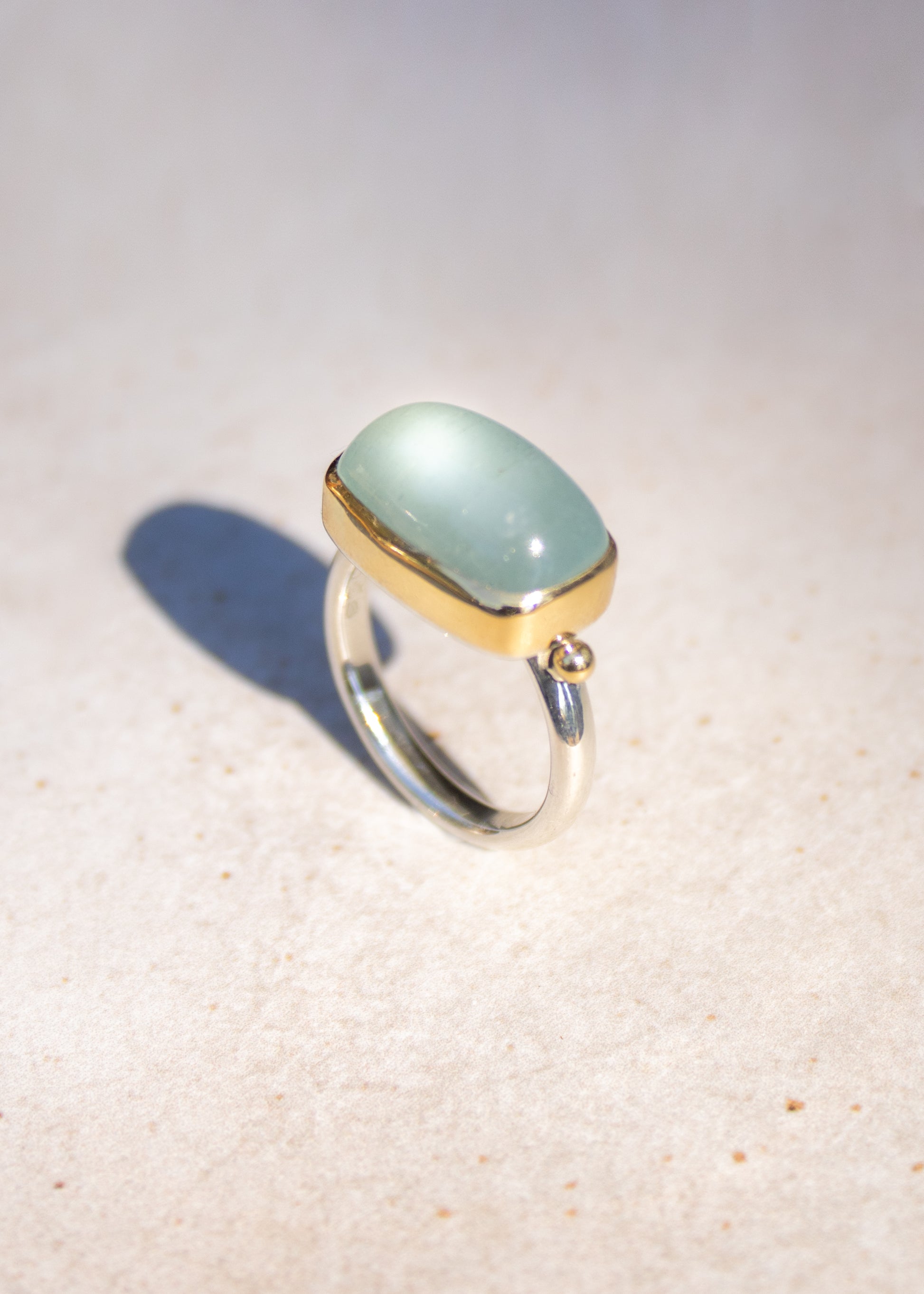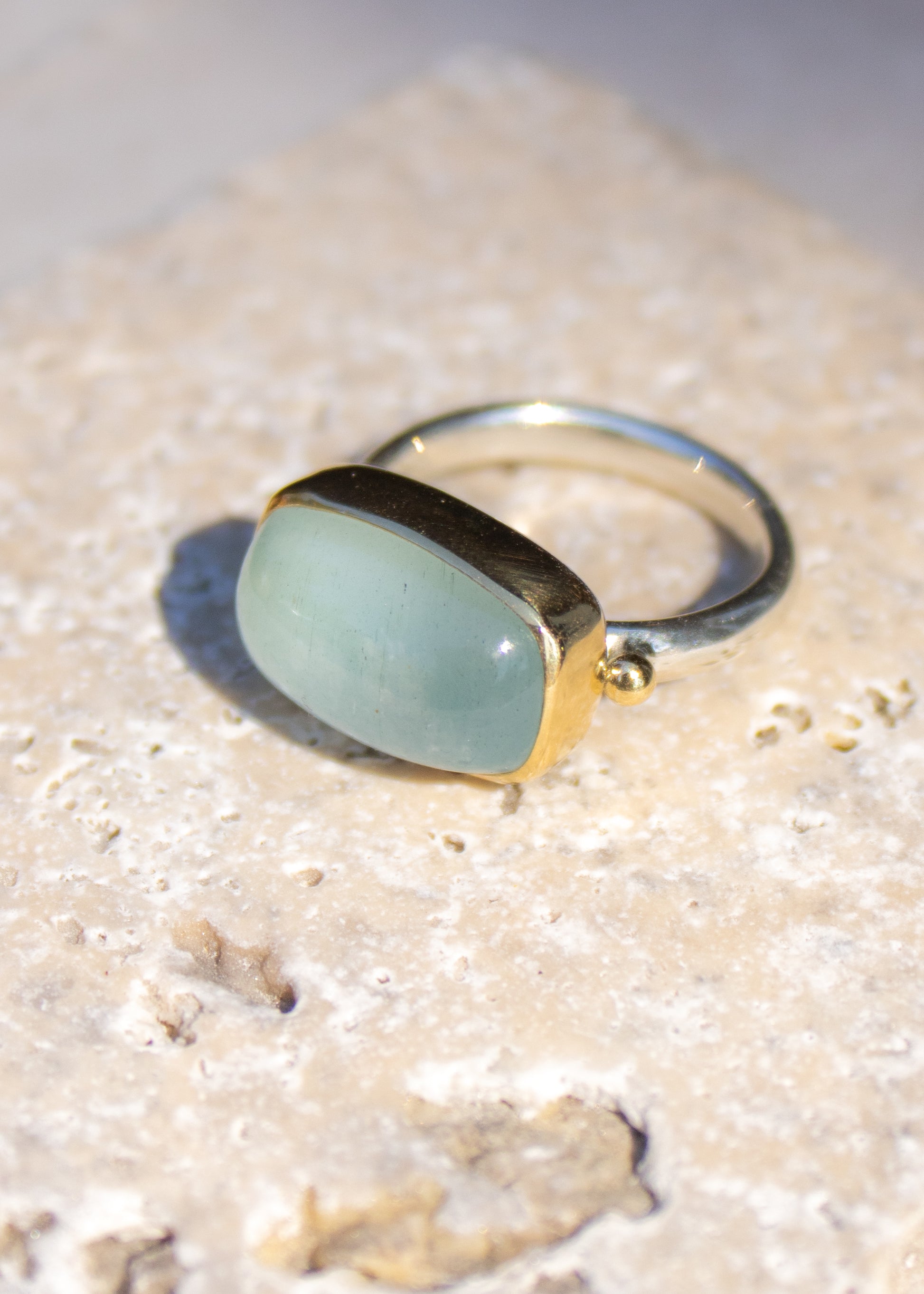 This stunning aquamarine ring features a 10x16mm gemstone known for its calming energy and oceanic beauty. Symbolizing happiness, hope, and everlasting youth, aquamarine has long been cherished as a protective stone for travelers and sailors, believed to bring courage and safety at sea. Set in 18k gold with a bold wide sterling silver band, this handcrafted ring offers a striking contrast of textures and tones. Made in Scottsdale, Arizona, it’s a meaningful piece for anyone drawn to healing crystals, ocean-inspired jewelry, or artisan gemstone rings. This ring makes a perfect statement ring or an unforgettable gift with intention.