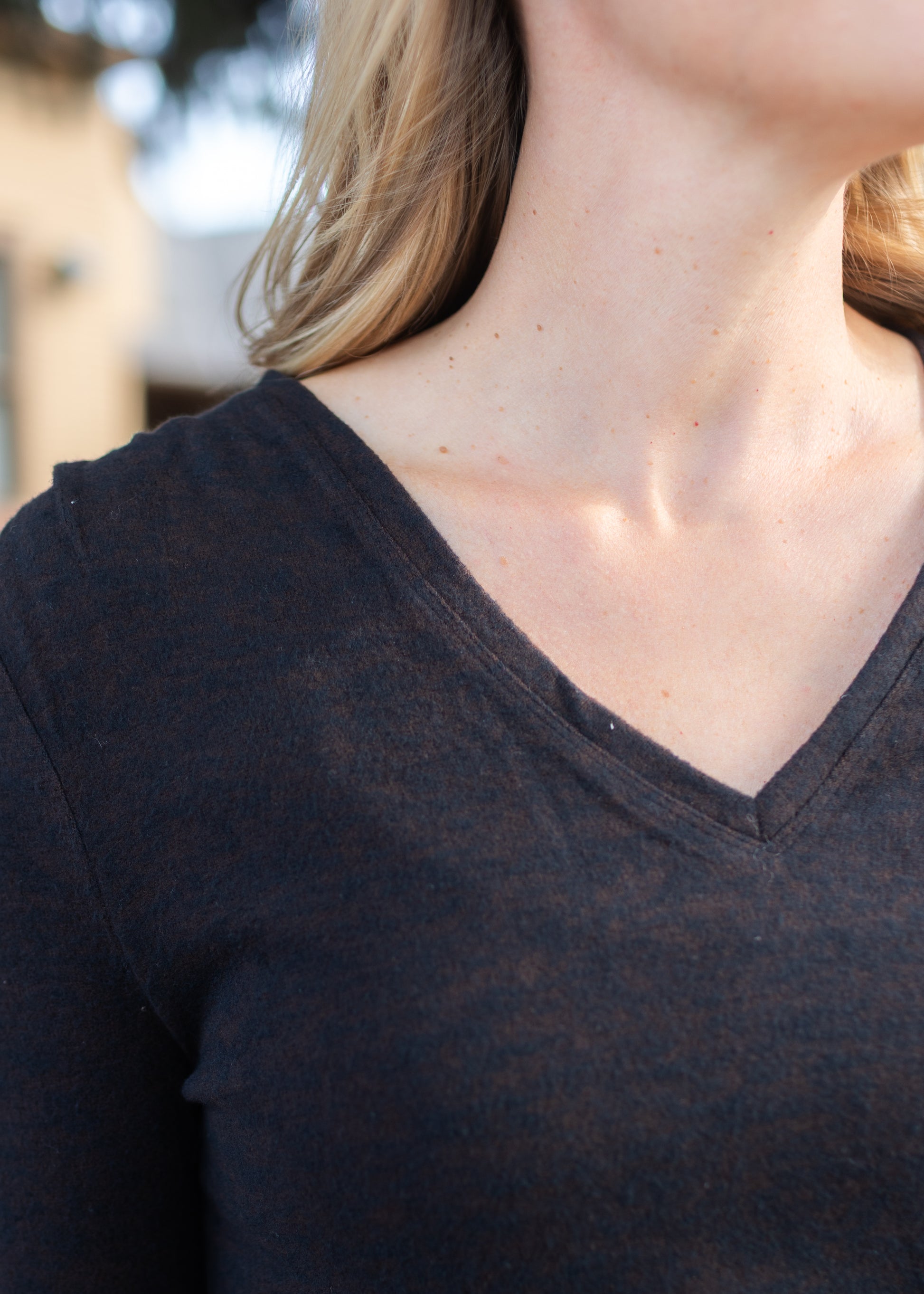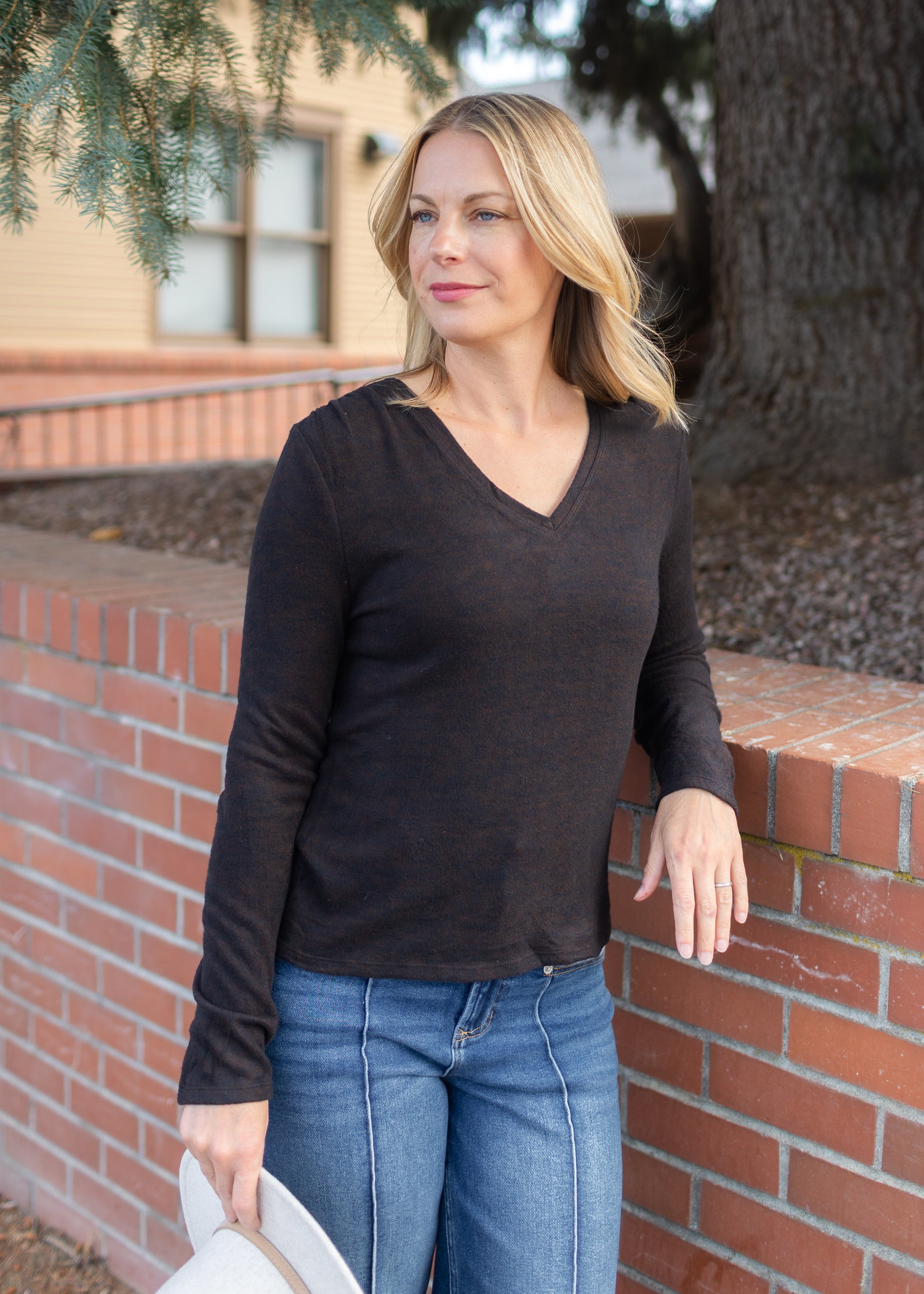 Somewhere in between a sweater and a long sleeve tee is where this yummy knit top lives. Layer it under your favorite blazer on a cold day, or wear by itself with your favorite jeans. The brushed knit is incredibly soft, and the v-neckline will ensure you won't get overheated. The shirred shoulder details gives just the right amount of visual interest!