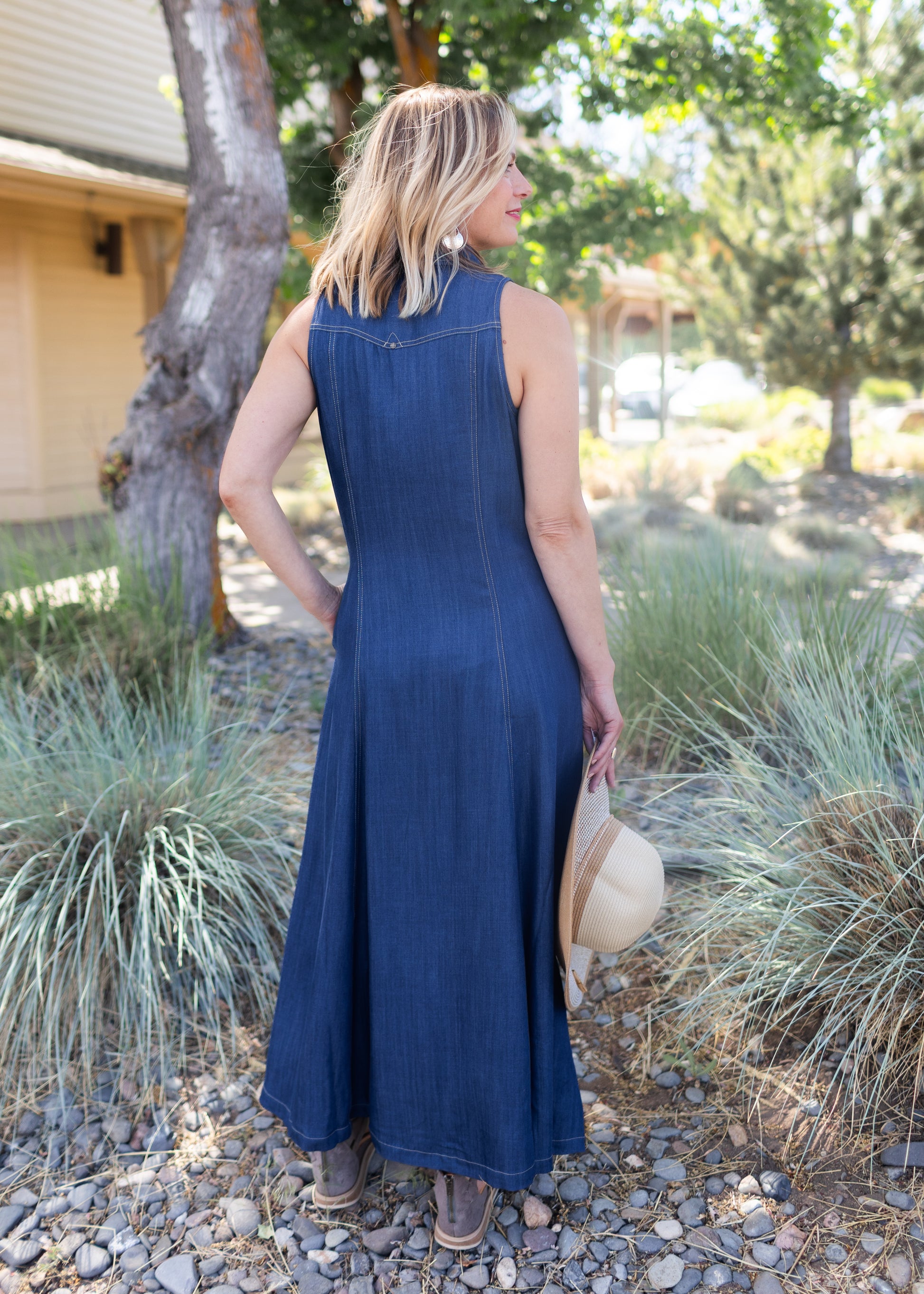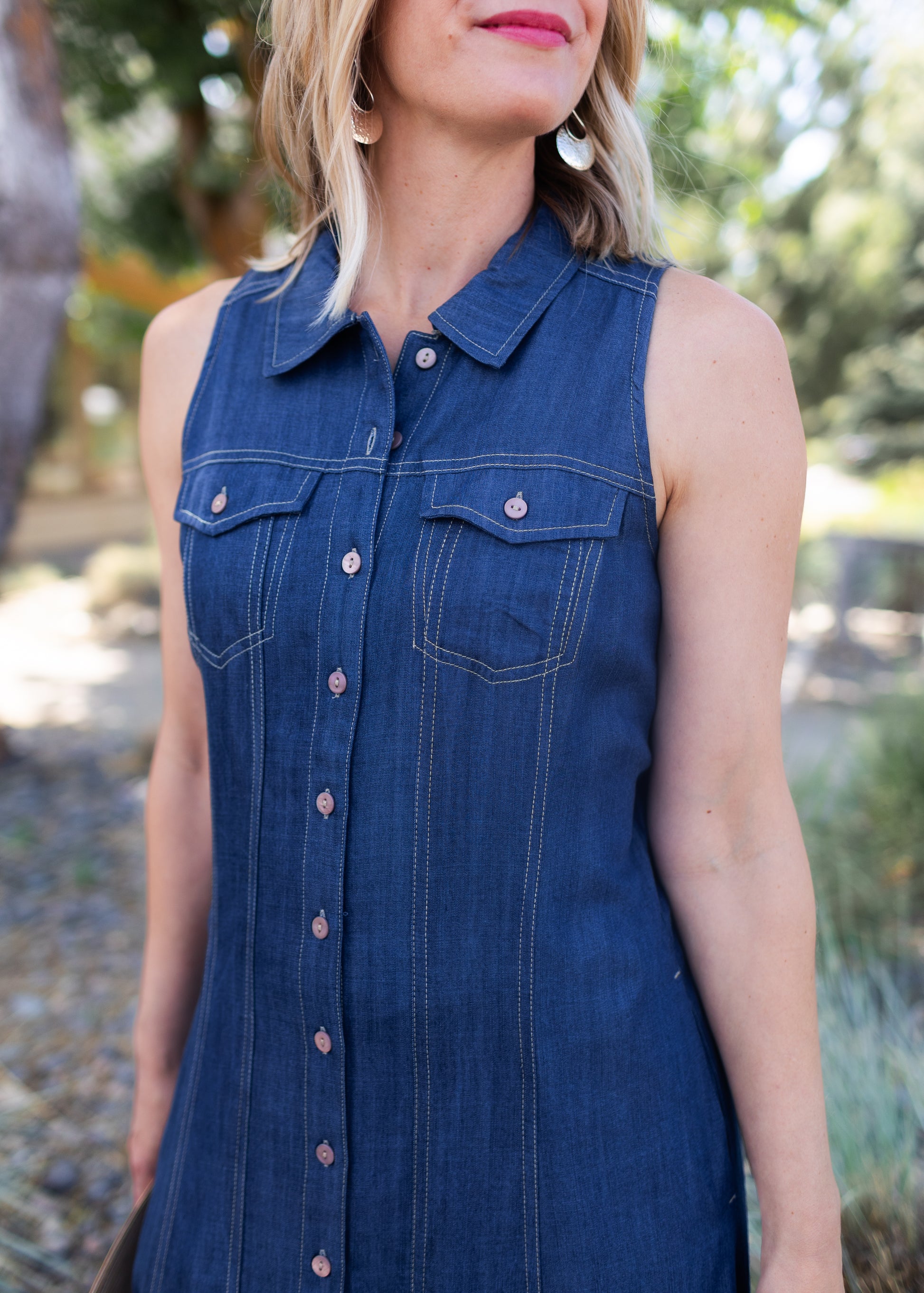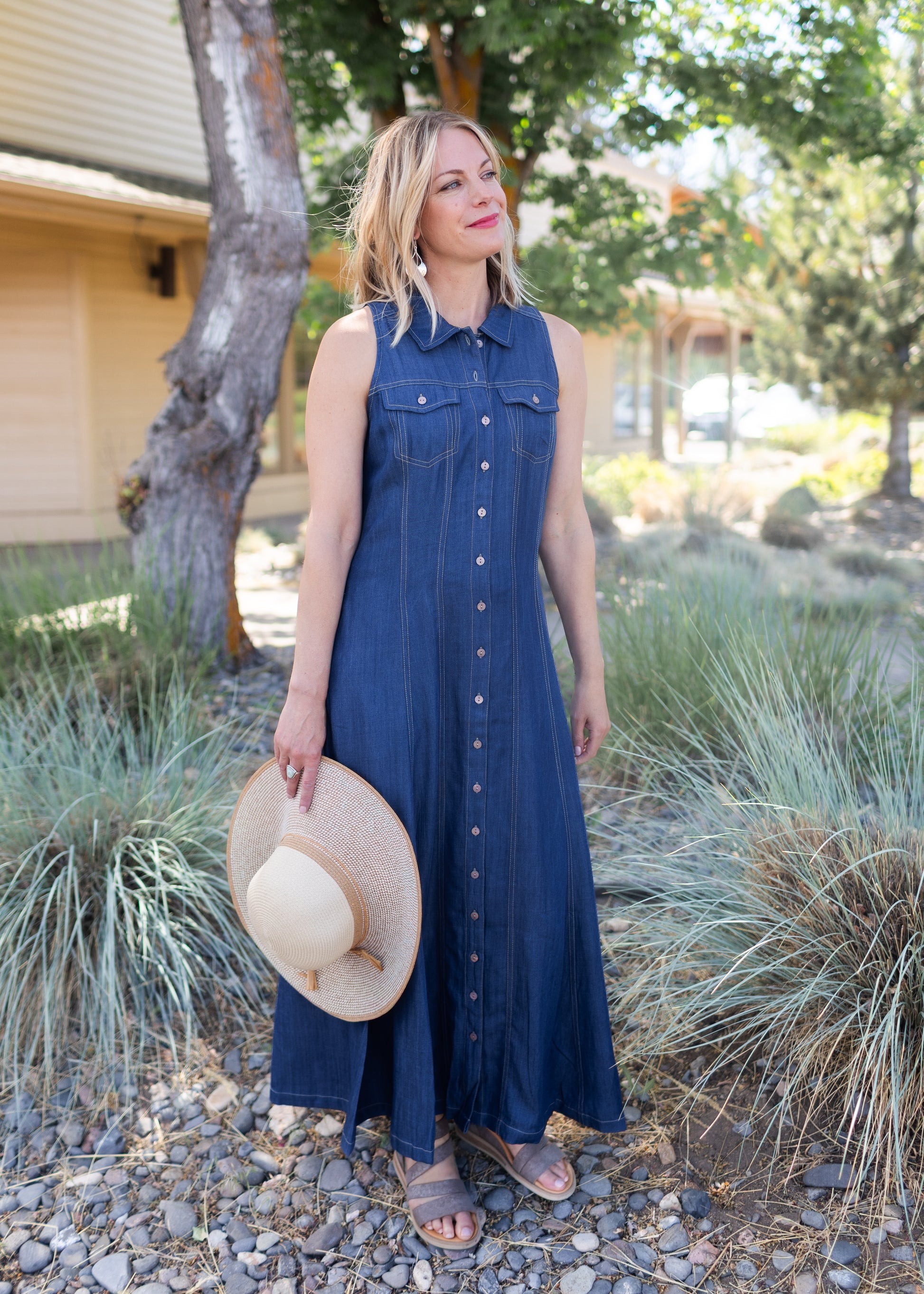 Perfect for layering or wearing solo, this sleeveless button-down denim dress works for casual weekends, travel days, or dressed-up dinners. Whether you call it a denim maxi dress, a long button-up denim shirt dress, or just your new favorite, it’s a wardrobe staple you’ll keep reaching for.