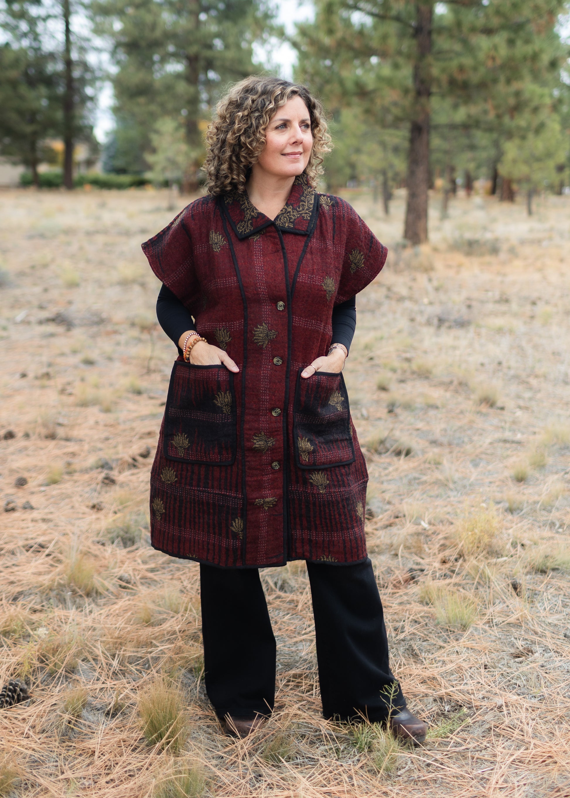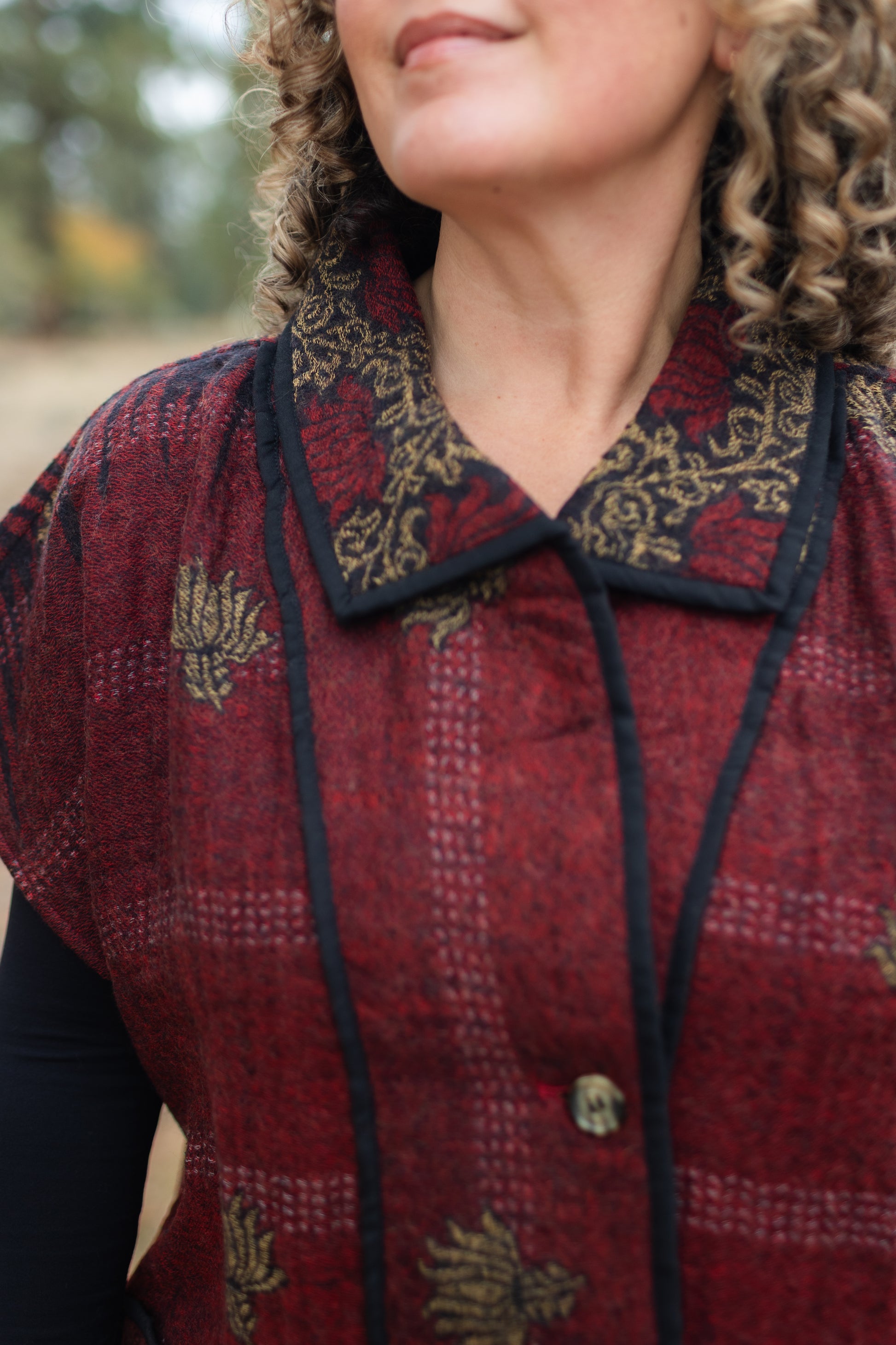 This sleeveless jacket is a true work of art, handcrafted and woodblock printed by hand. The deep garnet red wool is detailed with intricate black and olive block prints, each one showing the subtle artistry of traditional craftsmanship. A patterned collar and contrast trim bring refined structure, while oversized pockets add both charm and function. Finished with button closures down the front, this cozy, one-of-a-kind piece layers beautifully over a fitted top or turtleneck for an effortlessly elevated look.