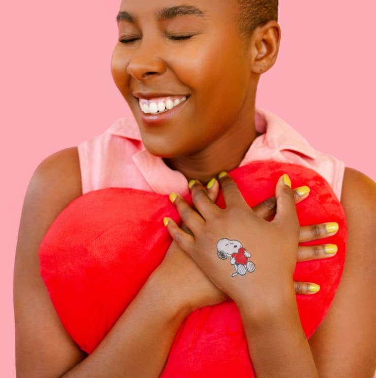 Snoopy Heart Tattoo Pair by artist PEANUTS®. Safety tested, vegan, cruelty free, and made in the US with domestic and imported materials. Tattly Pairs include two of each design packaged in a polybag and sealed with a branded topper.