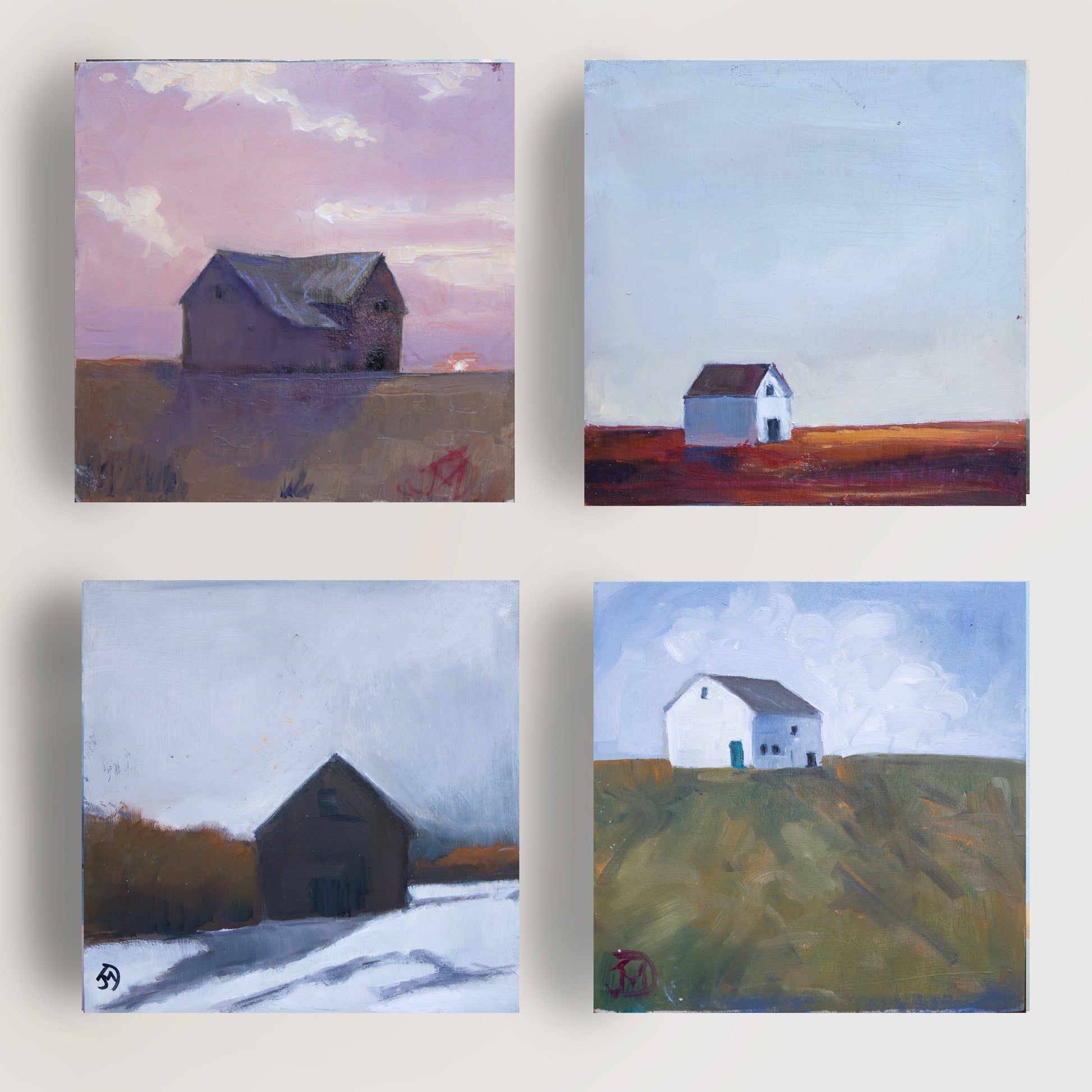 - Small square painting of a barn at sunset