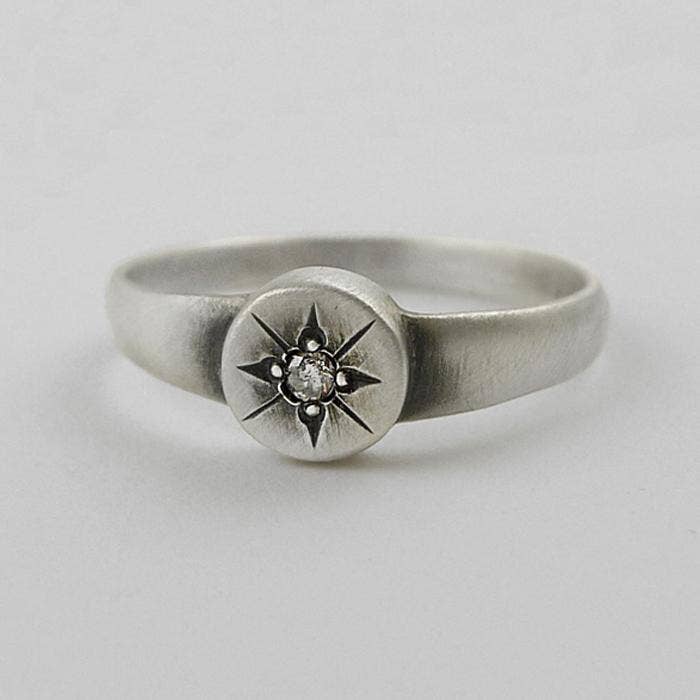 Disc with sparkling star set diamond in sterling silver. In the late-Victorian era "star setting" was a popular technique used by jewelers. The "star" is formed when a graver tool is used to push metal around the stone to form prongs and secure it in place.