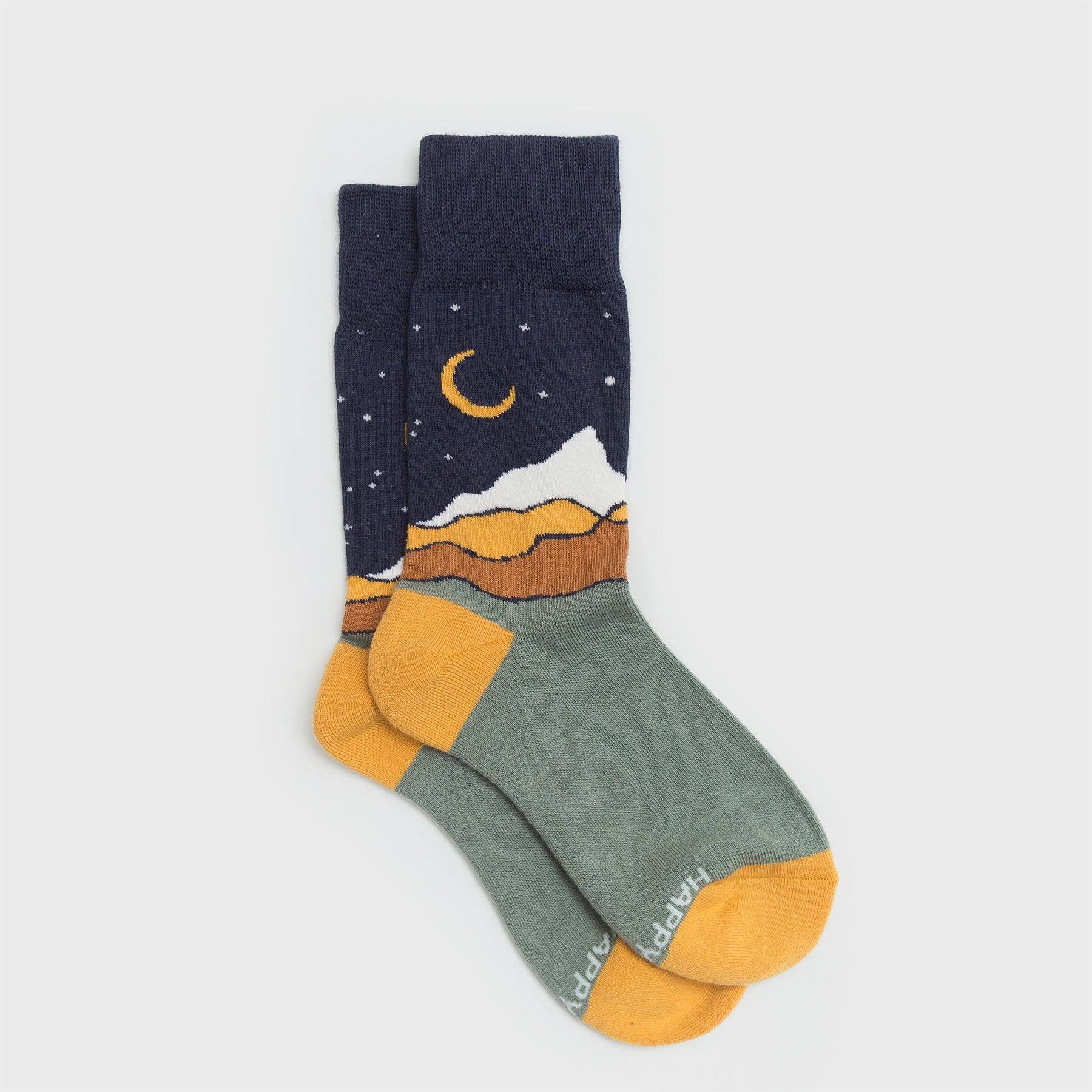 An ode to star-studded skies and mountain peaks. Navy and cool gray body with golden heel and toe, decorated with a mountainous nighttime scene. Soft, supportive socks made to put your best foot forward. Knit from comfy, breathable organic cotton with a touch of recycled nylon and elastane to enhance flexibility and moisture-wicking performance.