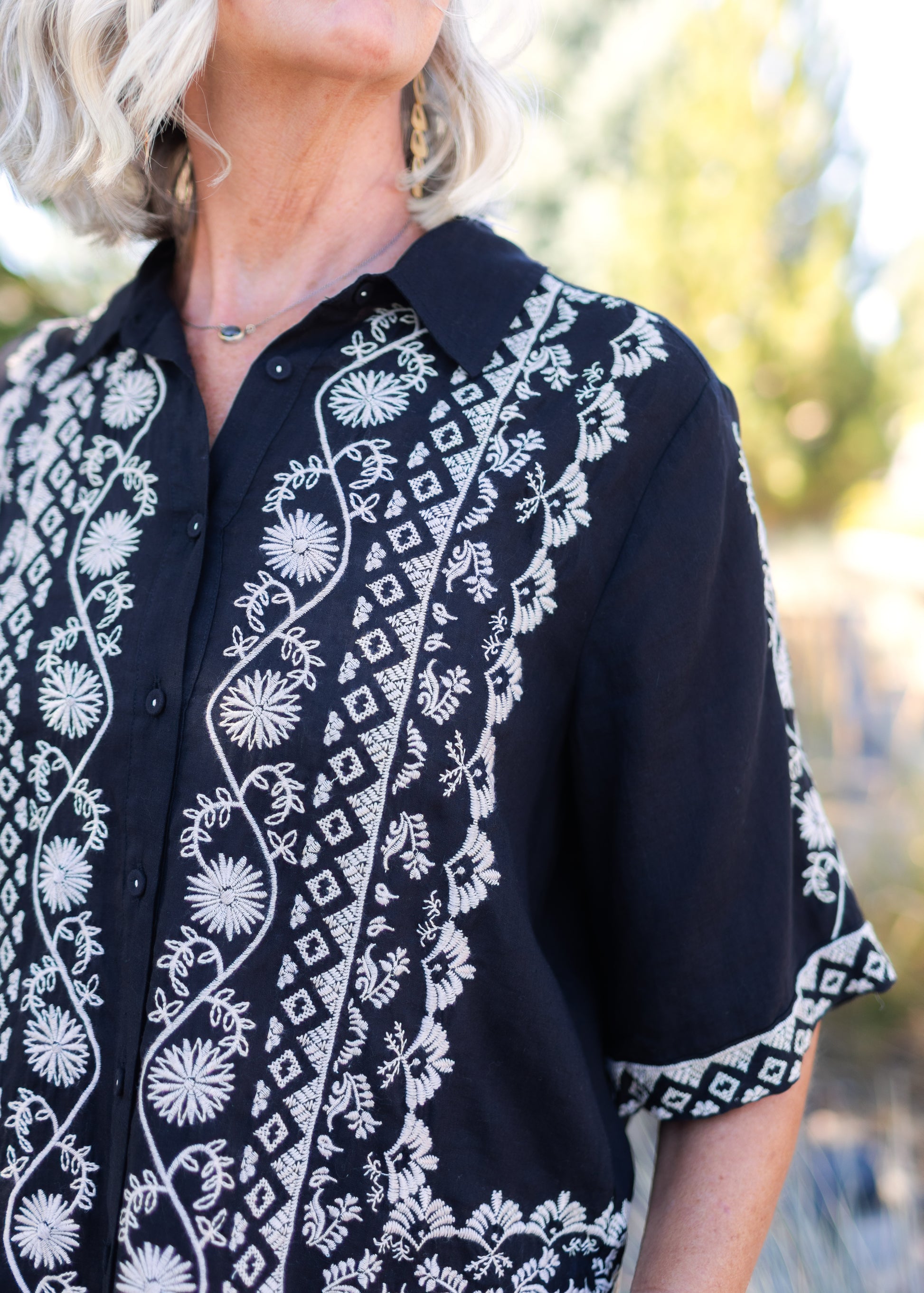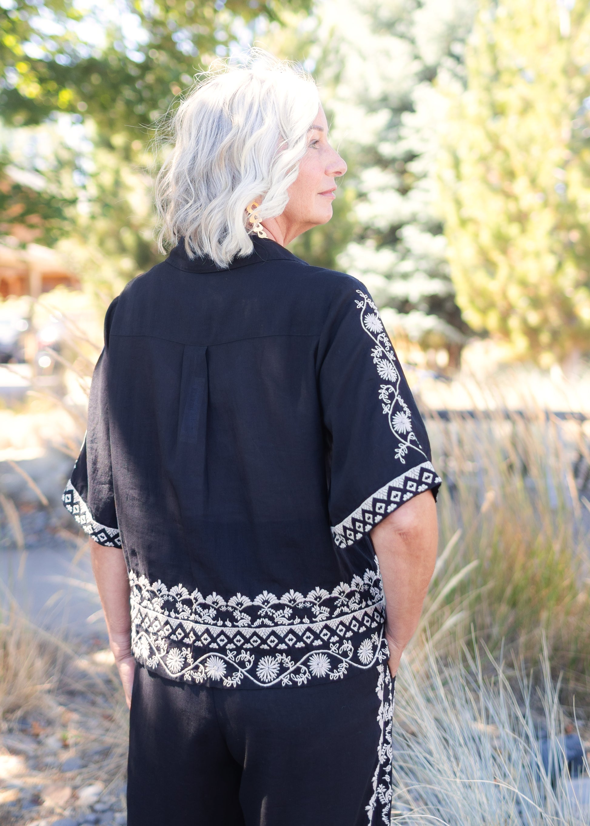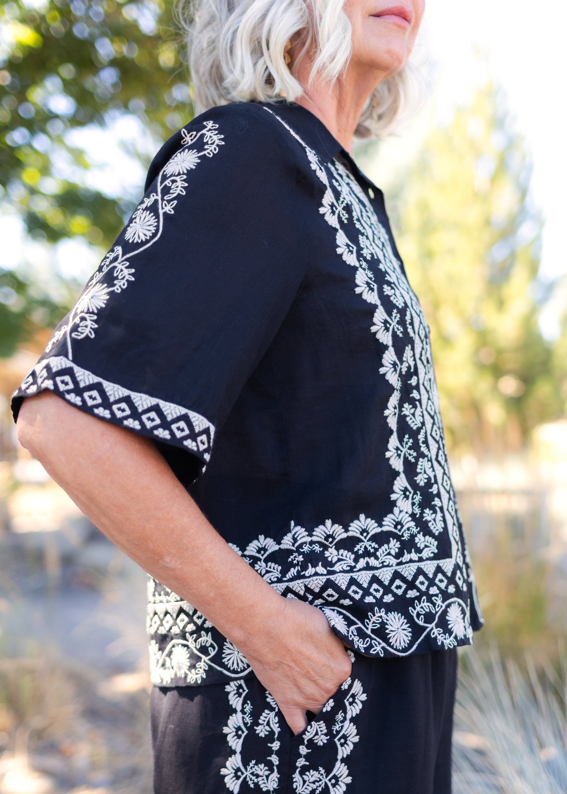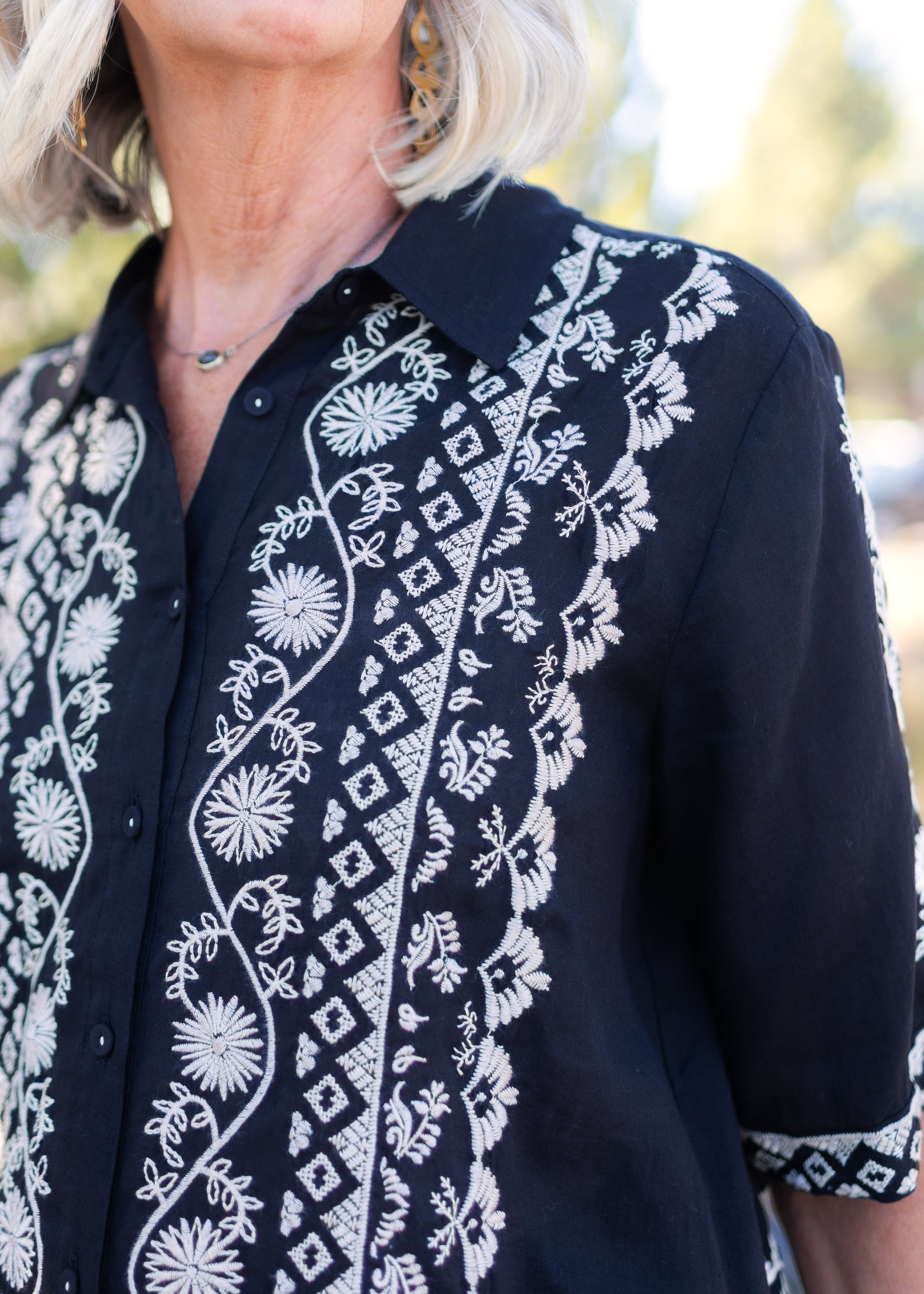 Beautifully embellished with intricate embroidery at the bodice, the Relaxed Shirt is crafted from 100% breathable linen. Featuring a traditional collared button front and elbow sleeves, this unique top is cut with a relaxed fit. Pair with linen palazzo pants and casual sandals for a resort-inspired casual ensemble.