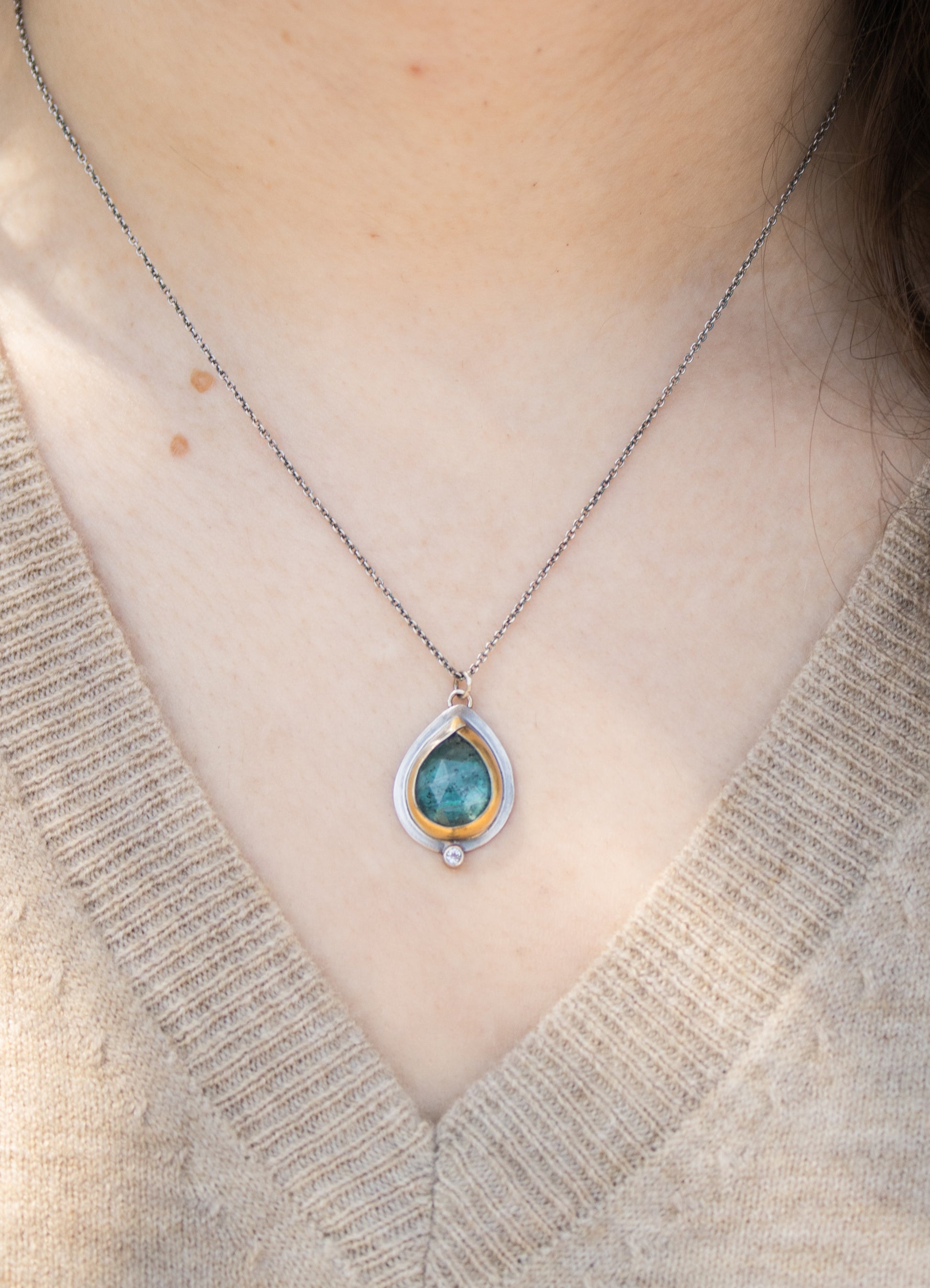 Rose cut teardrop stone, set in oxidized silver with 24k gold and accented with a 2mm blue zircon.