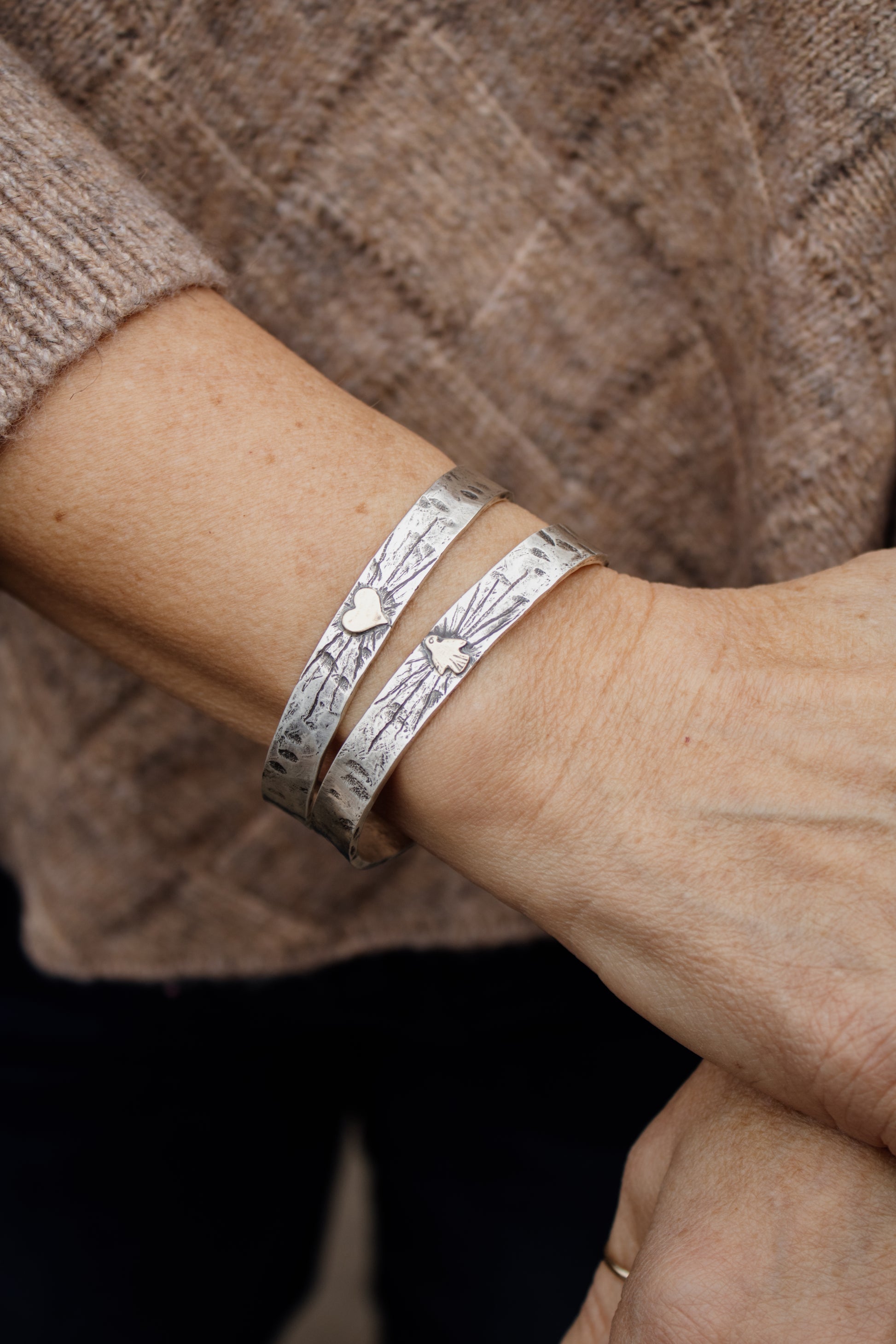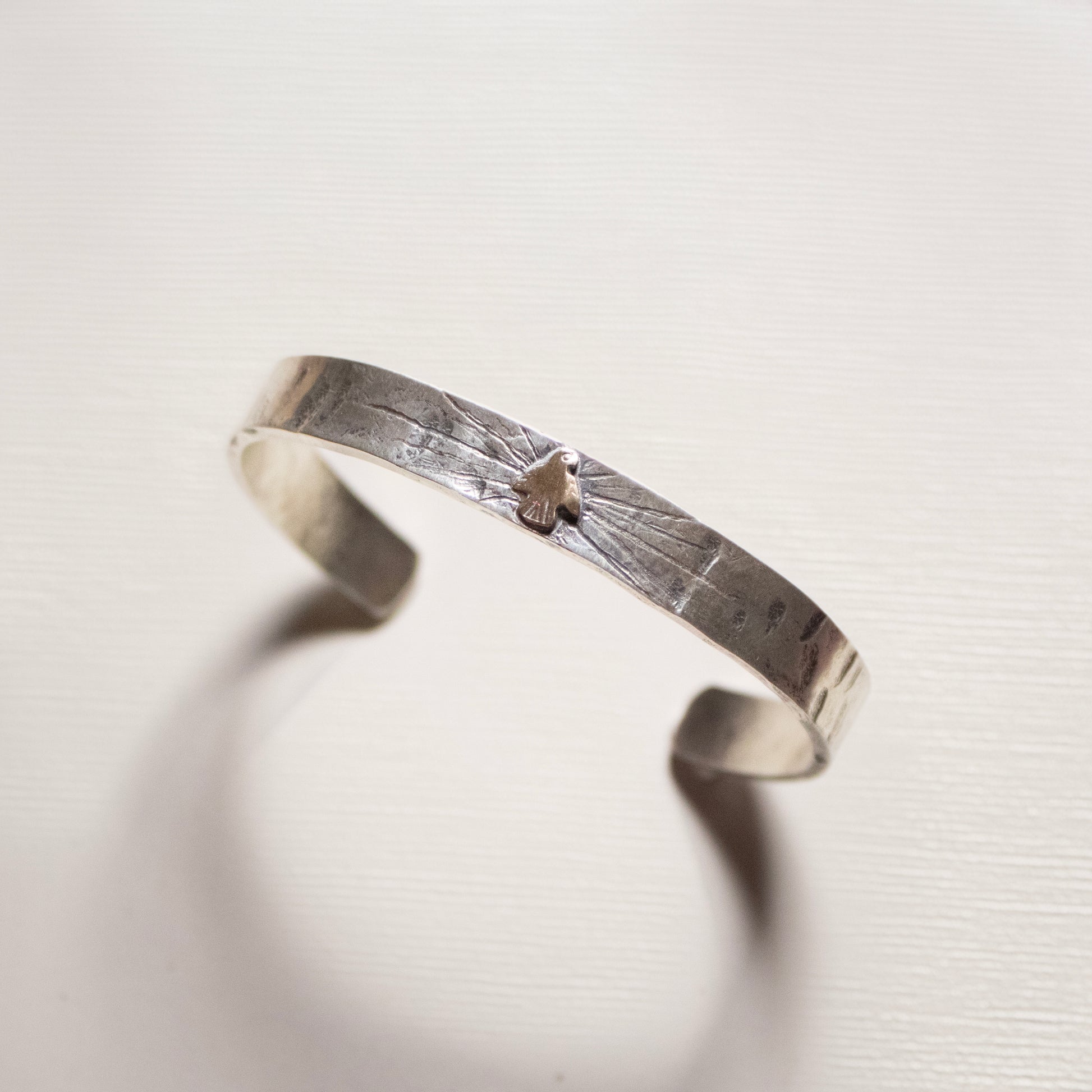 These heavy sterling silver cuffs are loaded with texture. This is a great addition to add to your everyday bracelet stack. The tiny 14 karat gold thunderbird symbol is a nice elevated touch.