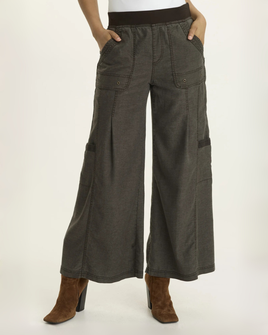 A contrasting waistband and side-pocket trim add dimension to this soft volume style. Antique brass grommets add some utility-style detail.