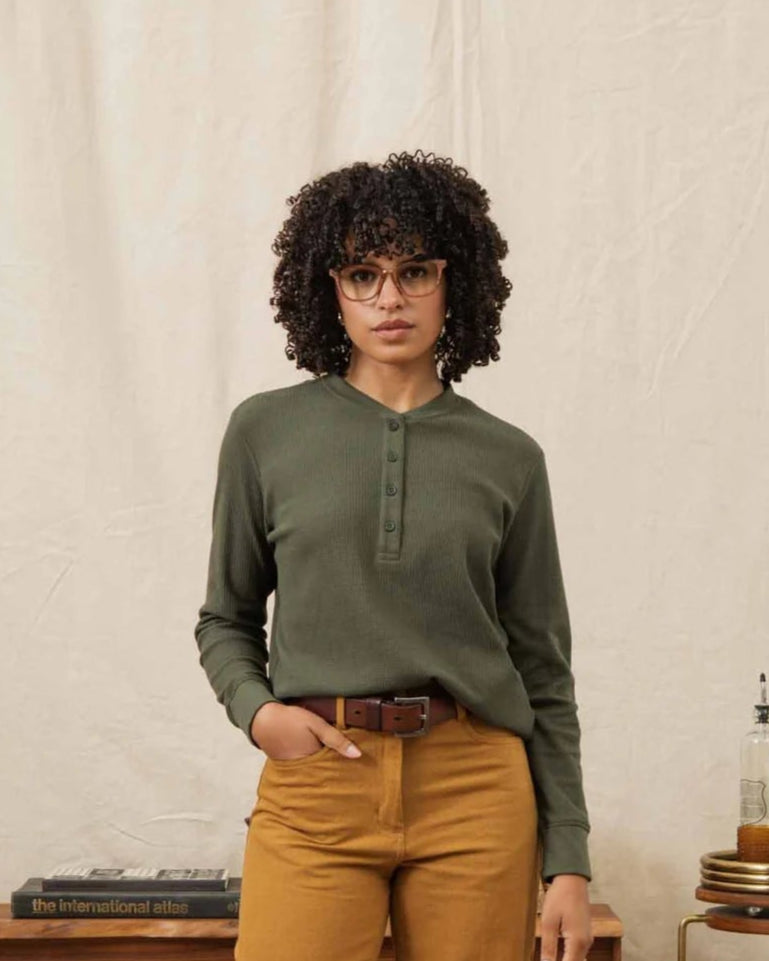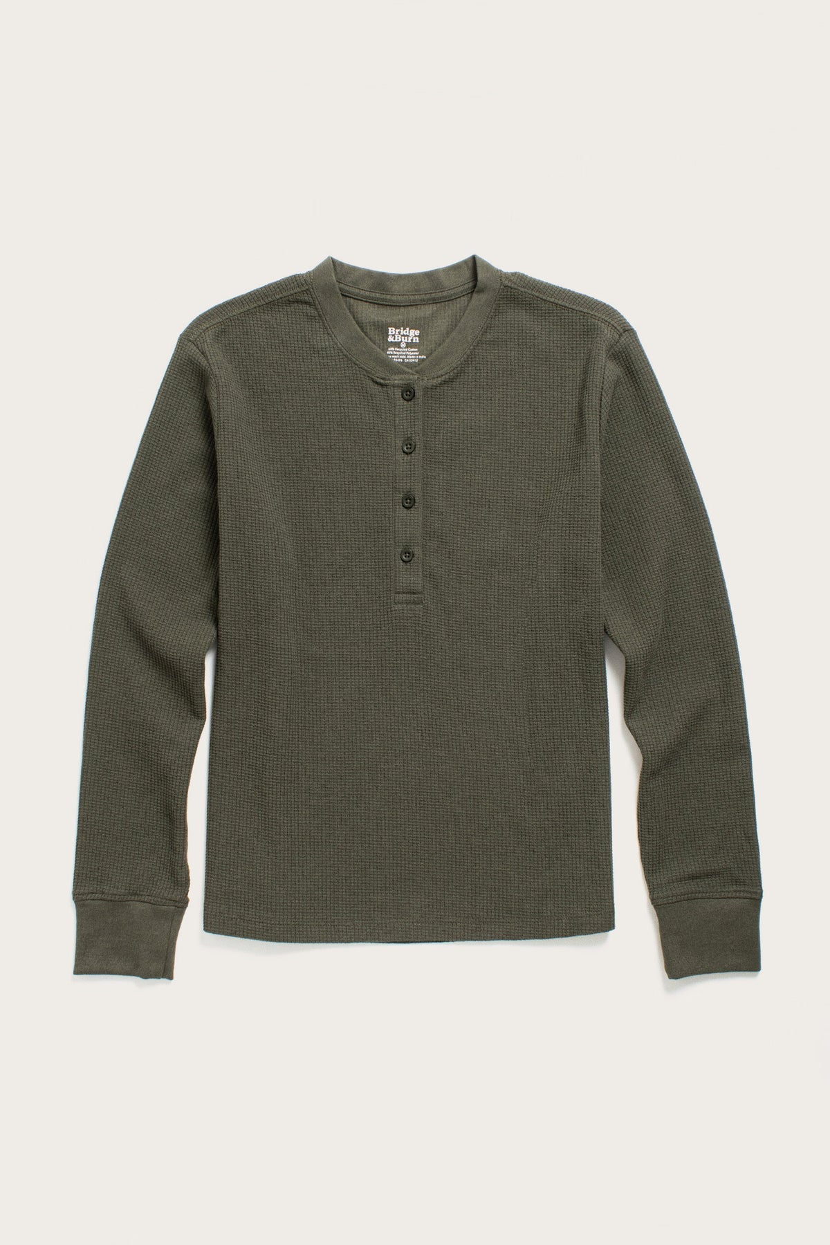 This waffle-knit henley is a modern take on a timeless staple, crafted from 100% recycled fibers with a proprietary process that cuts down on water waste and eliminates added dyes. Wear it on it's own or use it as a layering piece and the thermal waffle texture will trap heat without adding bulk. Comfortable, durable, and responsibly made, this is your everyday go-to, done right.